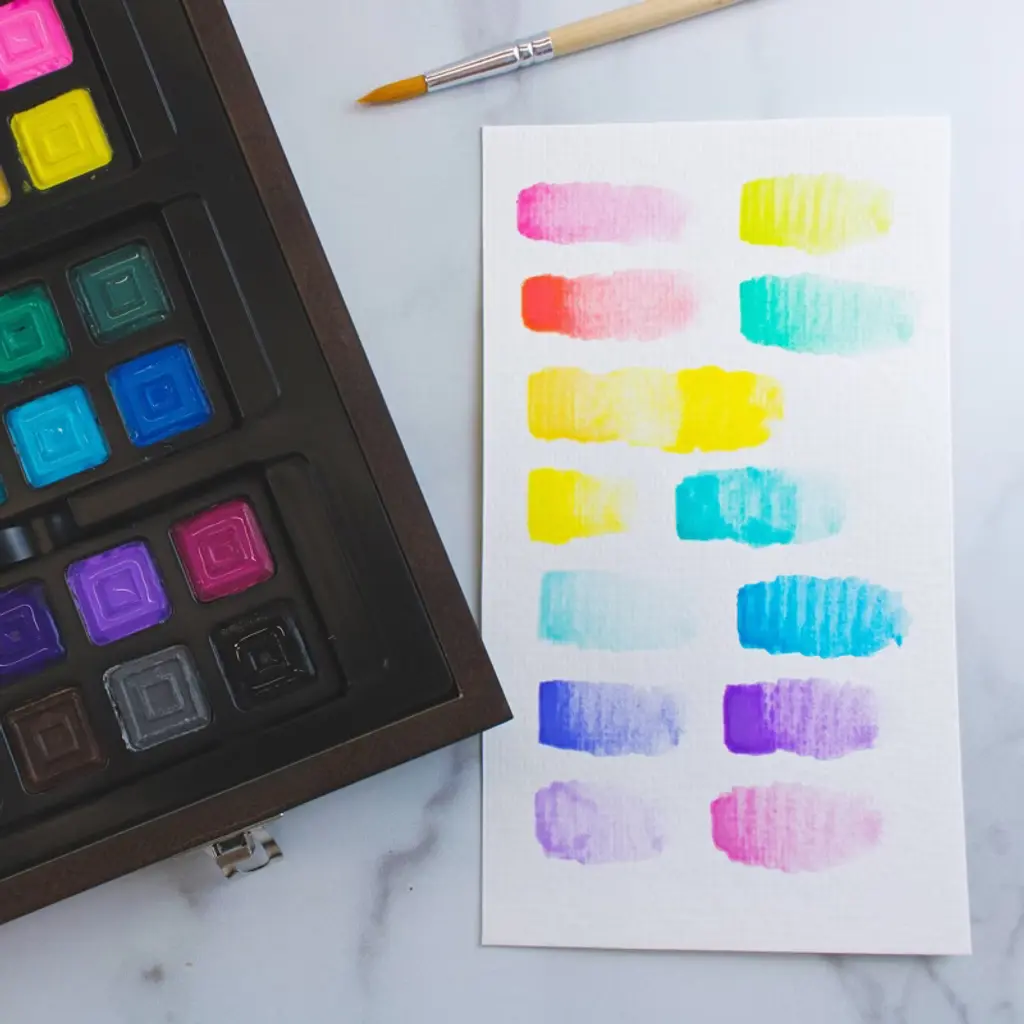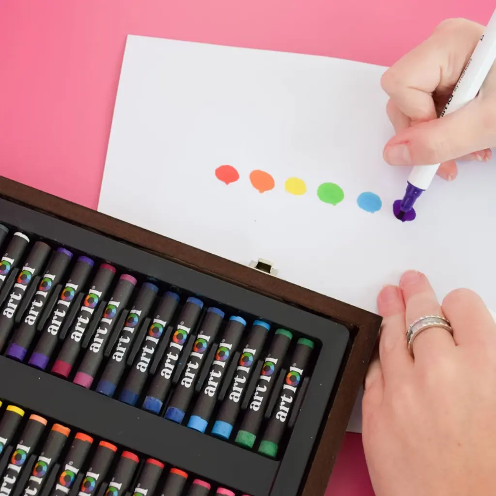 Art 101's Multimedia Illustration Wood Art Set comes with 85 pieces, including a number of different mediums that are perfect for creating your next illustration! This set features our professional quality, alcohol-based Illy Markers, which come with a dual chisel and bullet nibs. Use the chisel nib to shade in large areas and use the bullet side to add fine lines or detail! Your vibrant set of Illy Markers also includes a blending Illy, which allows you to seamlessly blend your colors as you draw. These markers are perfect for illustrations, fashion design, scrapbooking, architectural drawing, calligraphy, and more! You will also find in your set 34 of our creamy and pigmented oil pastels, making it easy for you to shade and blend the colors to create depth and dimension. Sketch out your composition before adding additional mediums with the included two sketch pencils, sharpener, and eraser. Want to try your hand at painting? Use the 24 watercolor cakes and included paint brushes to add soft and light colors. If you need some extra guidance when blending and creating new colors, refer to the handy color chart also included. Organize all of your artistic tools in a high-quality, convenient wooden carrying case, making them easy to use whenever inspiration strikes!