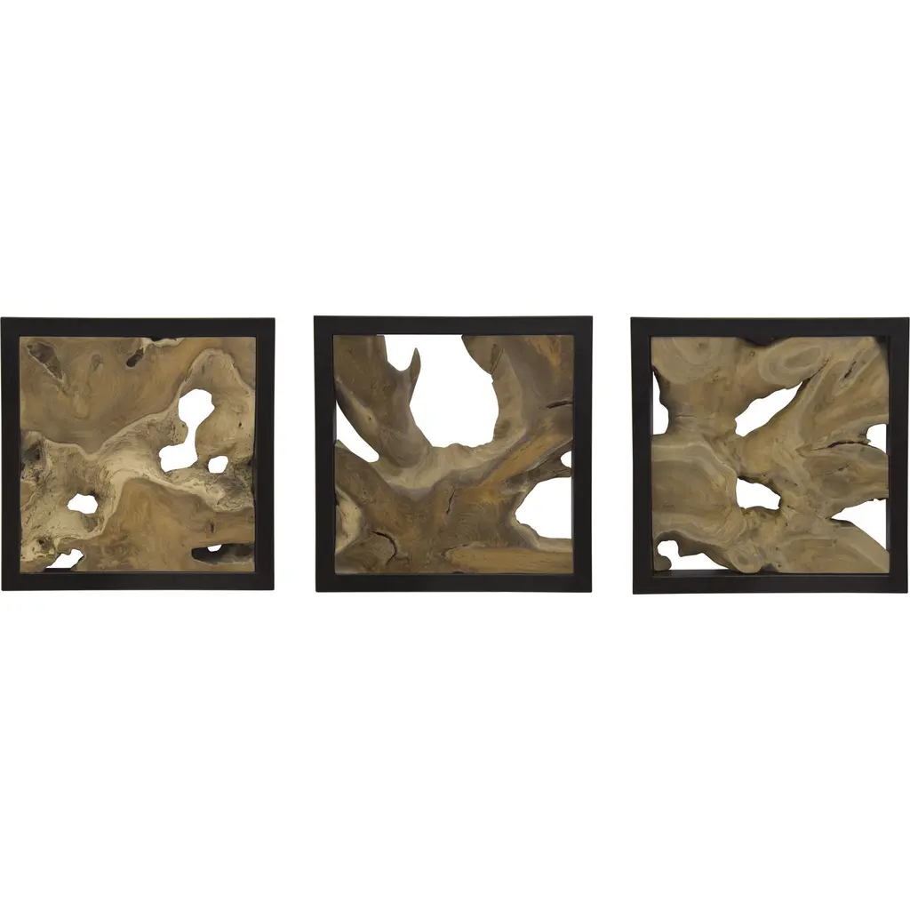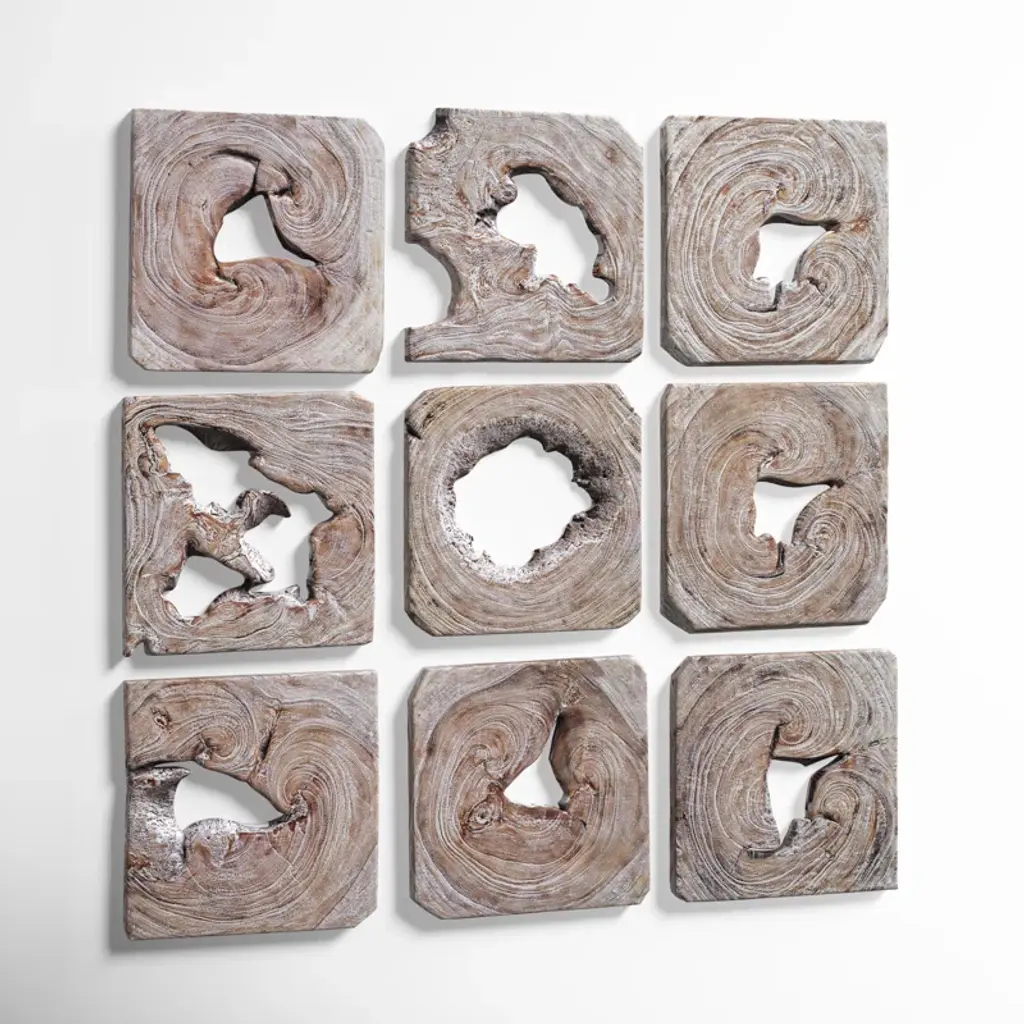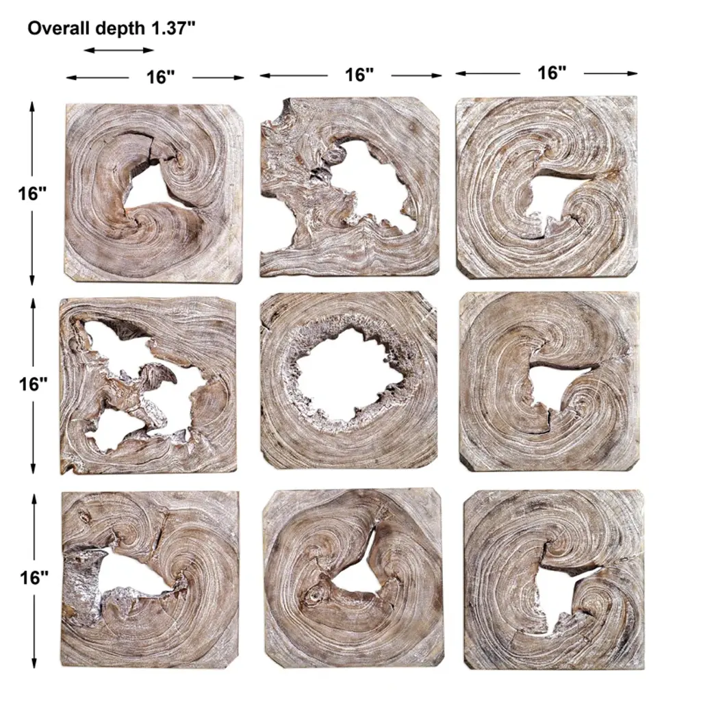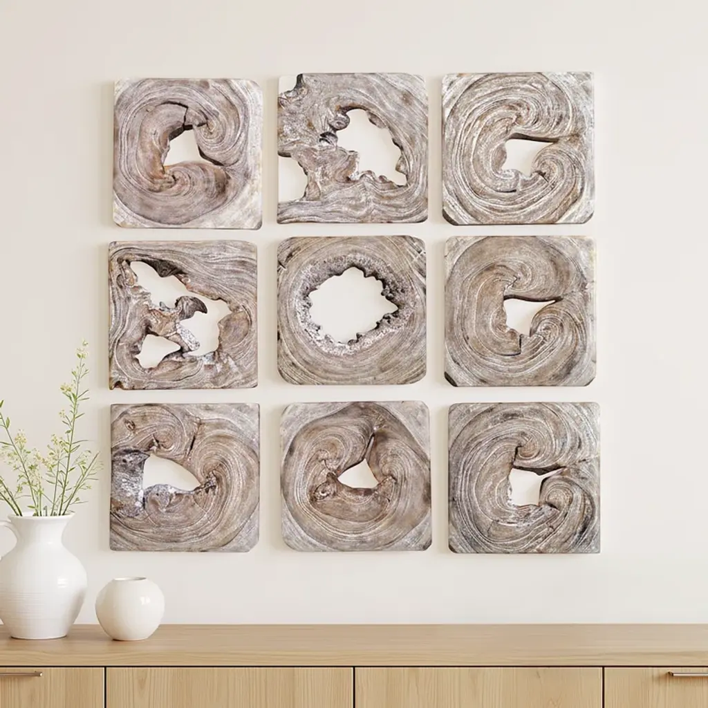 This 9-piece wall decor set captures the look of driftwood to bring a welcoming coastal feel to your living room or dining room. Each piece is made of solid natural suar wood in a distressed finish with coffee-brown undertones. Because each piece is shaped as a square, you have endless ways to group them together as a gallery on your wall or hang them separately to bring a natural element to different rooms.