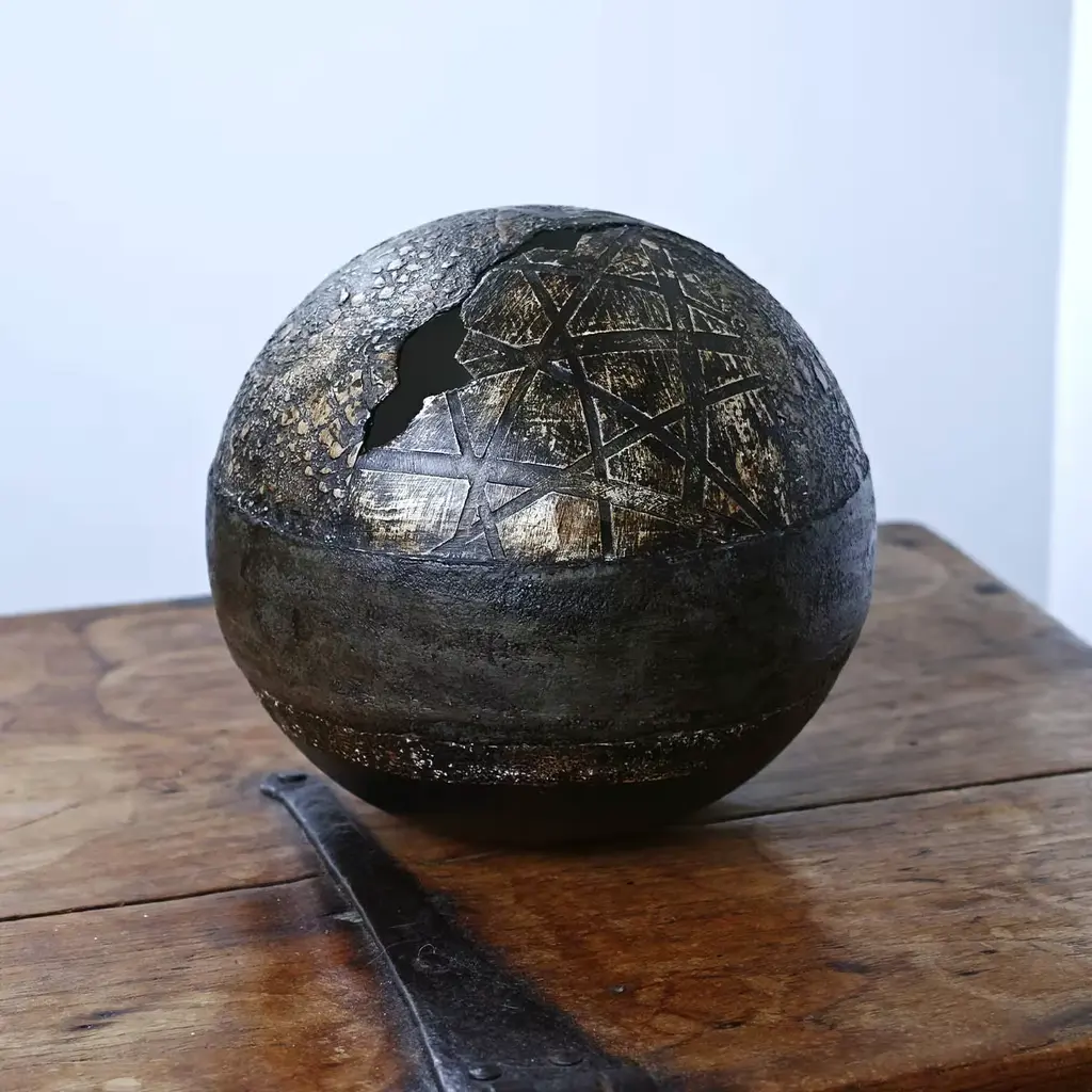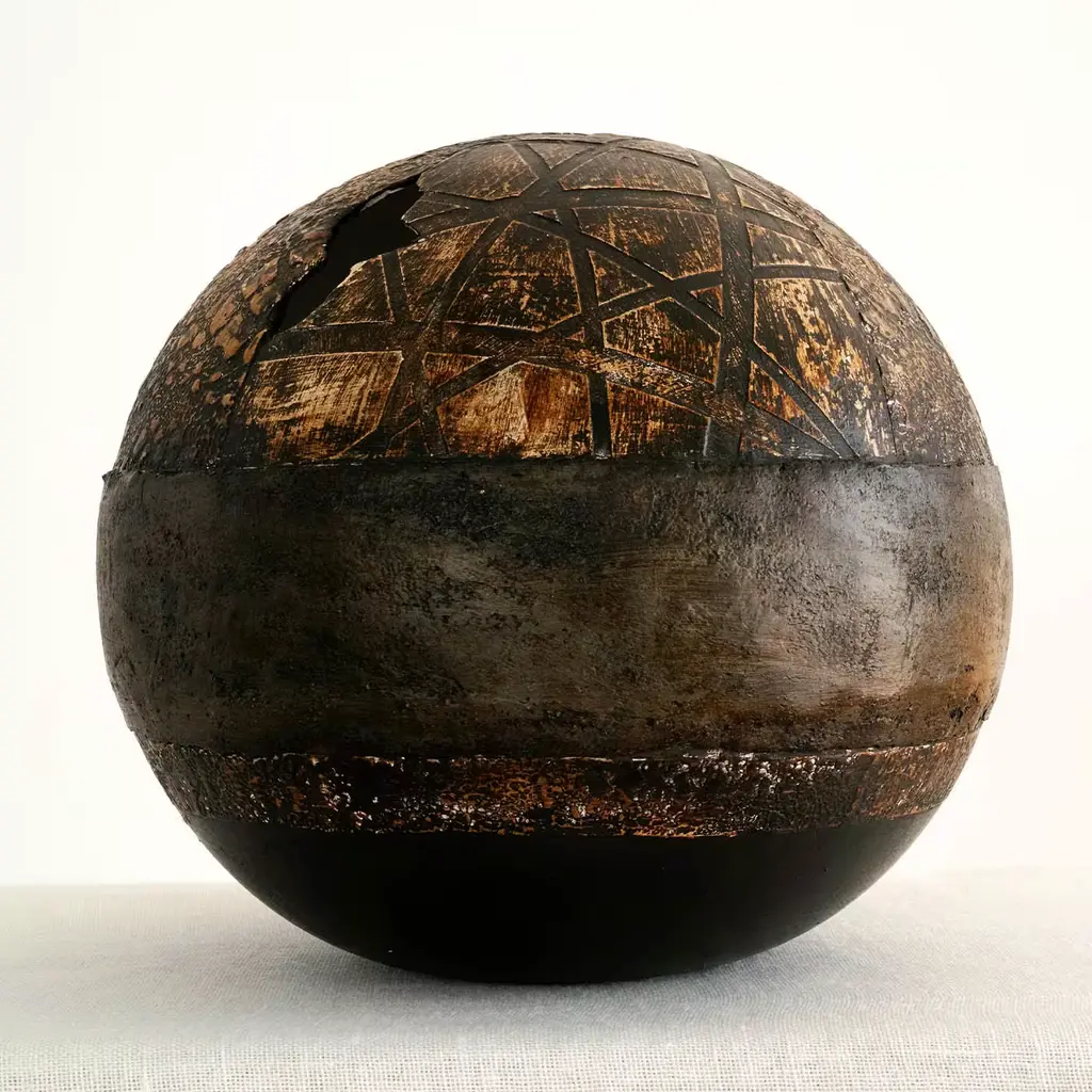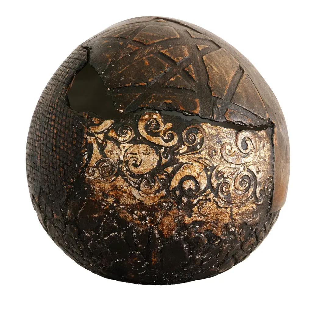 Inspired by the timeless elegance of ancient decorative arts, this sphere is adorned with a band showcasing intricate geometric and floral motifs. Formed entirely by hand from cement, Carrara marble powder, and ceramic powder, the upper section features a deliberate crack, reinforcing the beauty of imperfection. The careful balance of raw and refined elements makes this lightweight yet fragile artwork a compelling narrative of craftsmanship and heritage.