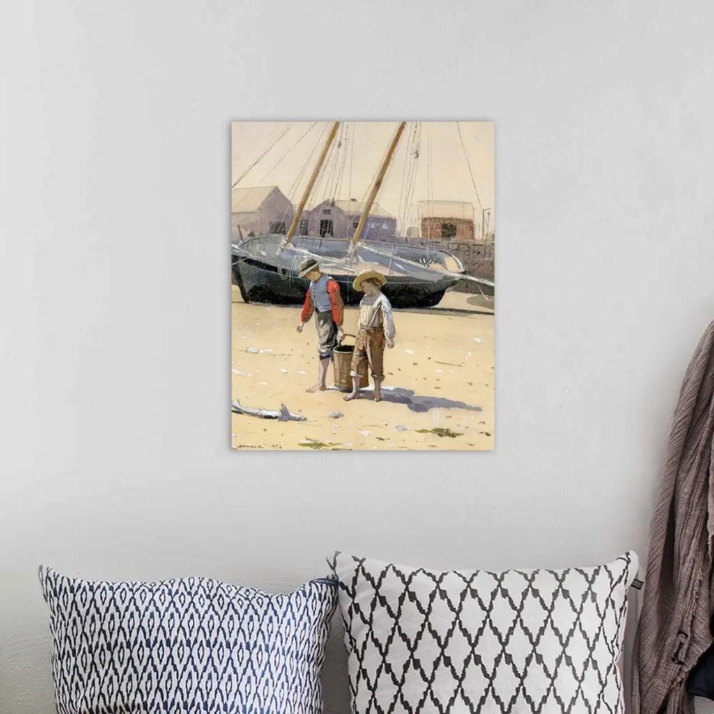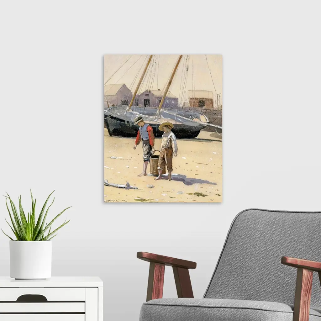 In June 1873 Homer went to Gloucester, Massachusetts, where he painted his first watercolors, depictions of the local children playing in dories, sitting on the wharves, helping with chores, or simply preoccupied by their own youthful concerns. One of the most delightful products of that summer of experimentation is A Basket of Clams. This is the earliest watercolor by him to be acquired by the Museum. The artist sums up the modest responsibilities of childhood in this engaging image of two boys carrying a large basket of clams along a shell-strewn beach. The background buildings and the cropped two-masted sailboat refer to Gloucester's maritime activity. This charming sheet typifies the direct observation, vigorous design, and dazzling light of Homer's first watercolors. Reminders of his experience as an illustrator are evident in his sense of pattern, use of sharp outlines and flat washes, and attention to detail. Homer shared an interest in childhood with many American artists of the 1870s. Their paintings responded to the spirit of the post-bellum era, when the desire for national healing and the challenges of urban and industrial growth made children symbols of a simpler and more innocent time and of America'a hope for the future.