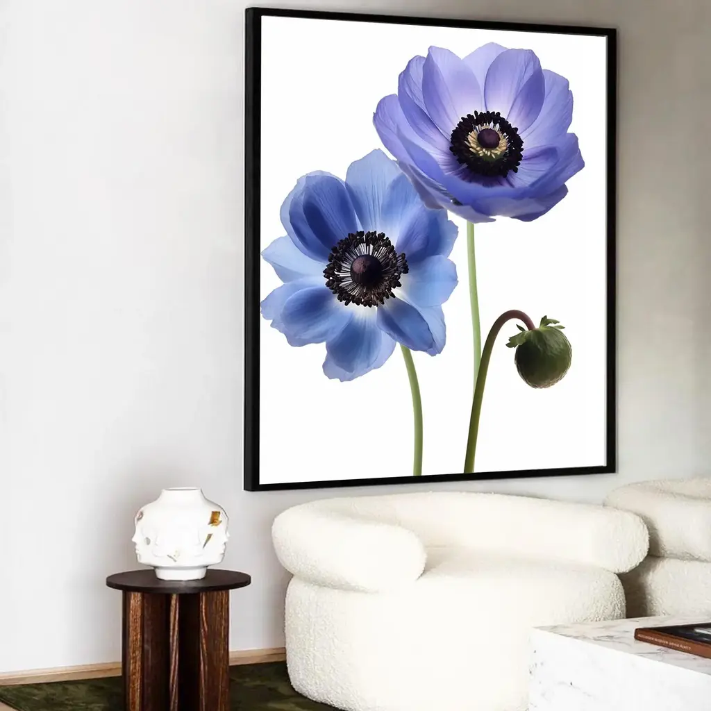 A color photograph of several blue and purple flowers. Printed on 300gsm Archival Fine Art Paper.