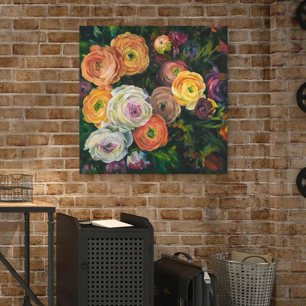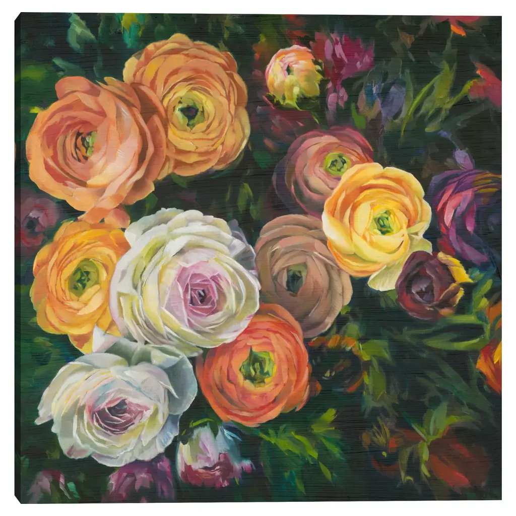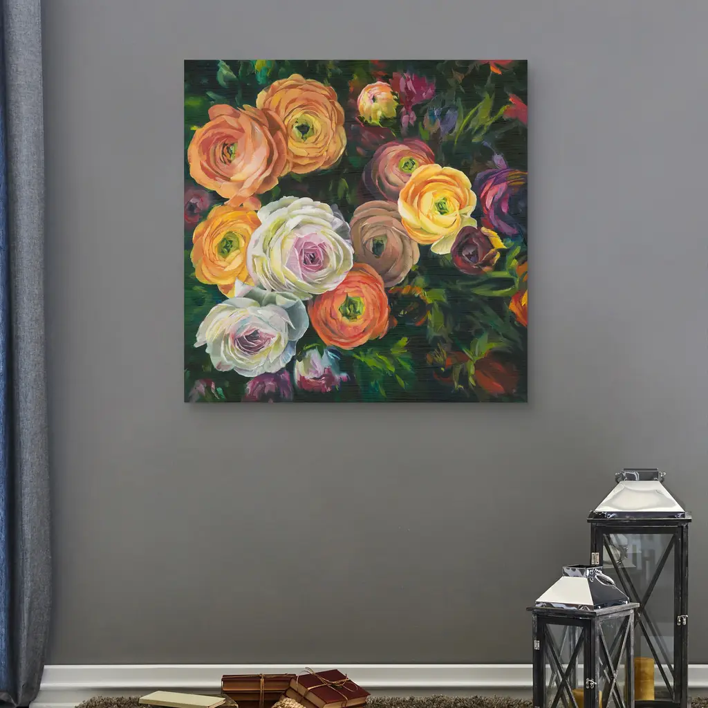 A massive bouquet of plentiful waxy petals in brilliant hues is Liz Jardine's A Charmed Life centerpiece. This canvas art print is full of lively blooms, ready to adorn your walls. This beauty would make a perfect present as well!