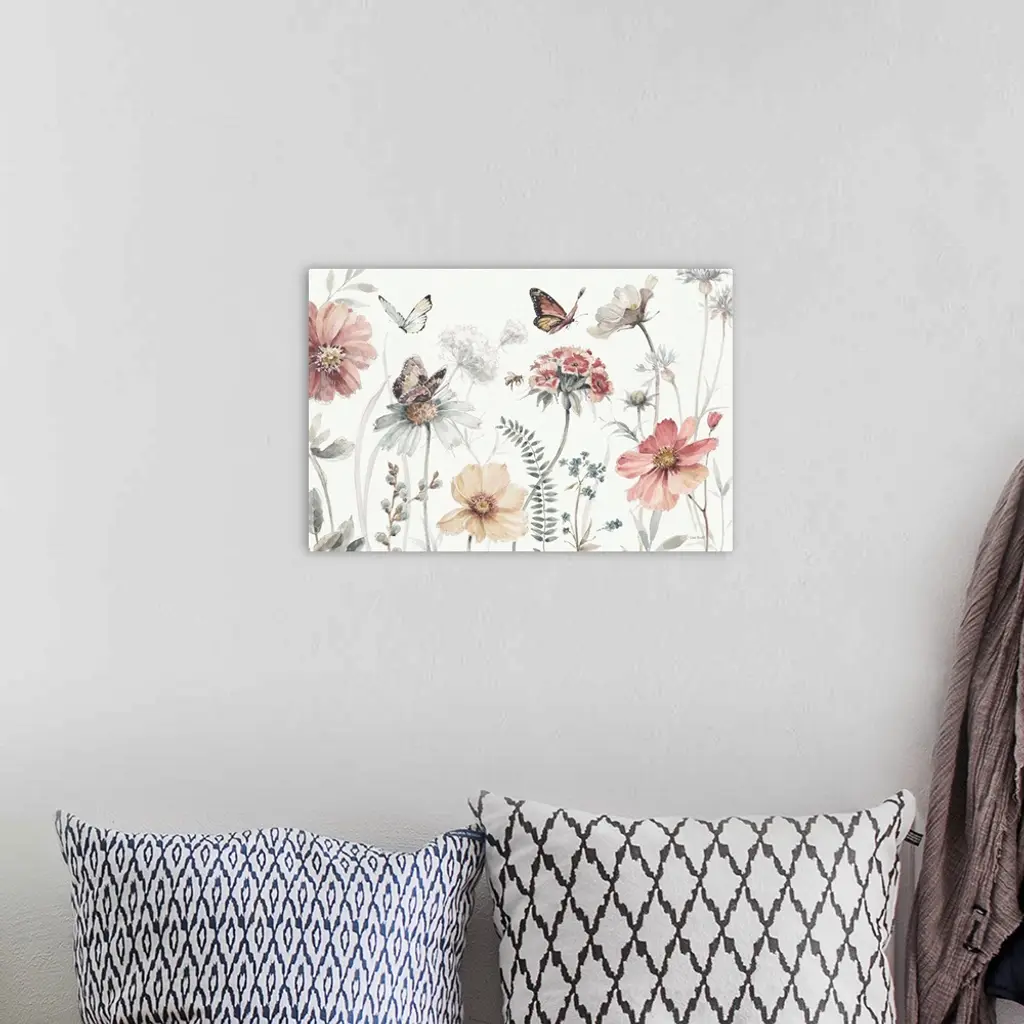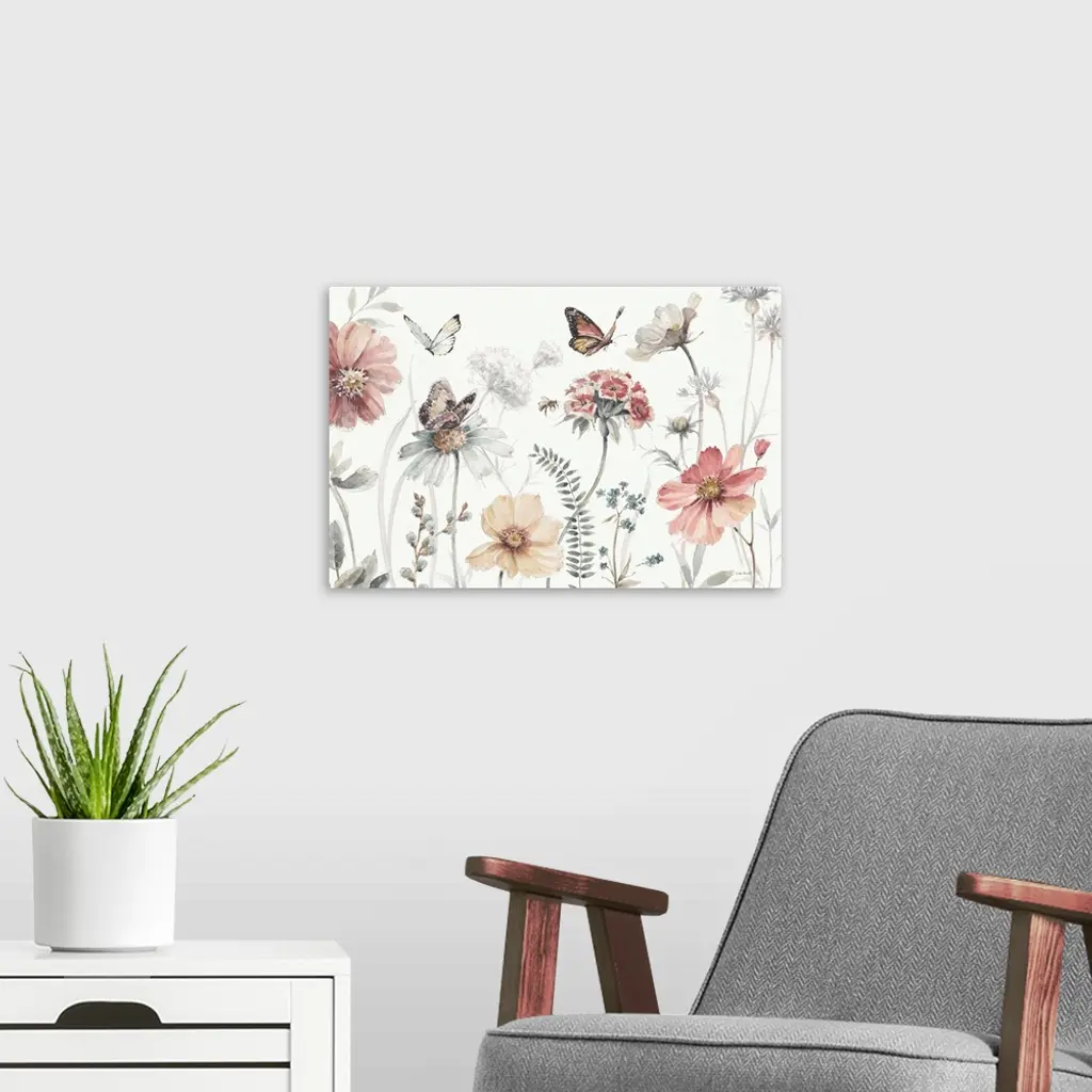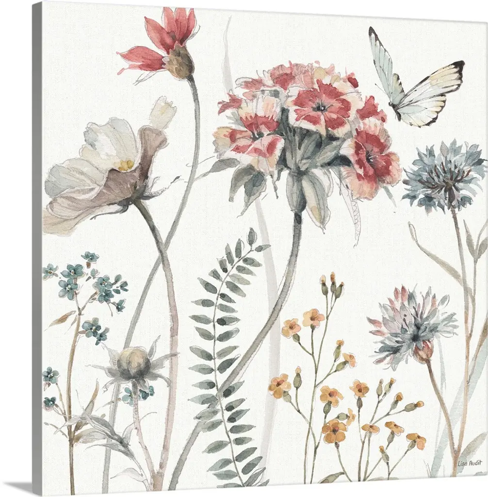 Contemporary country artwork of wildflowers with fluttering butterfly over a white background.