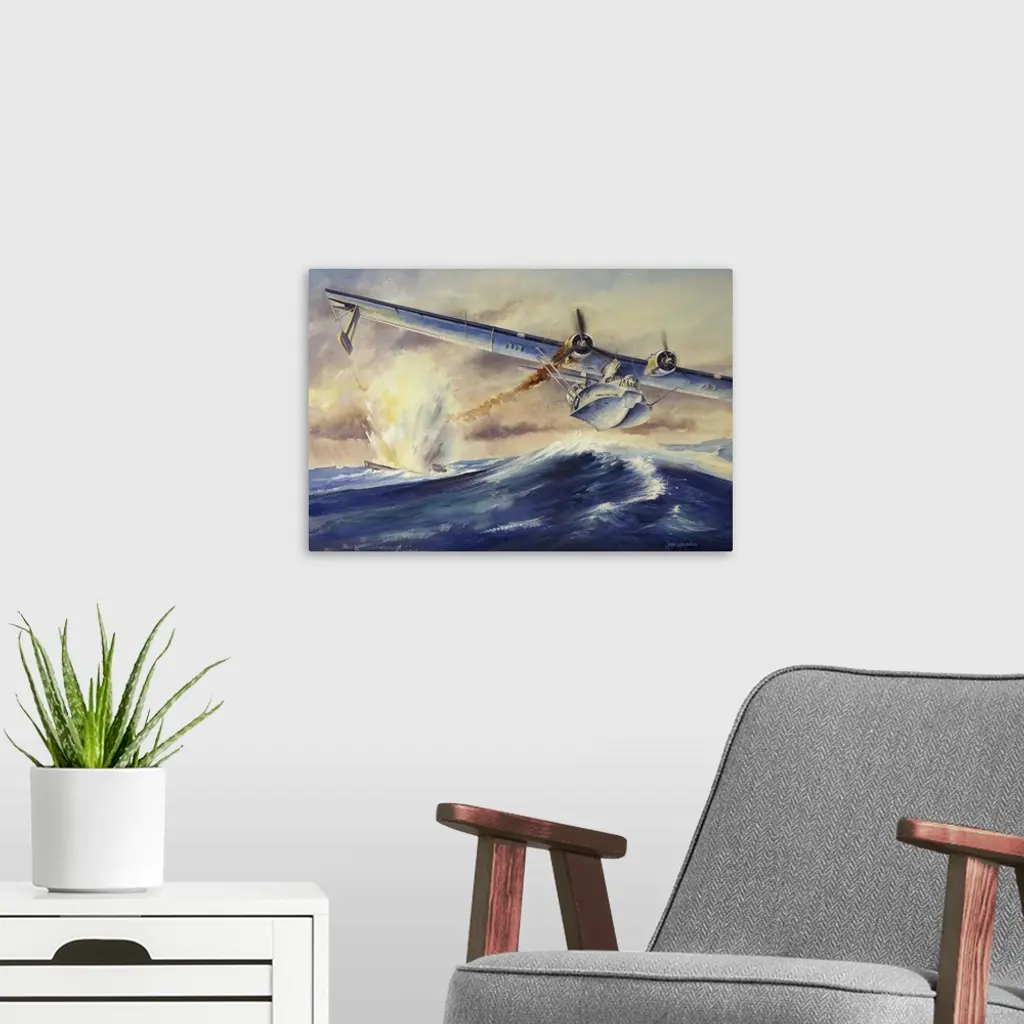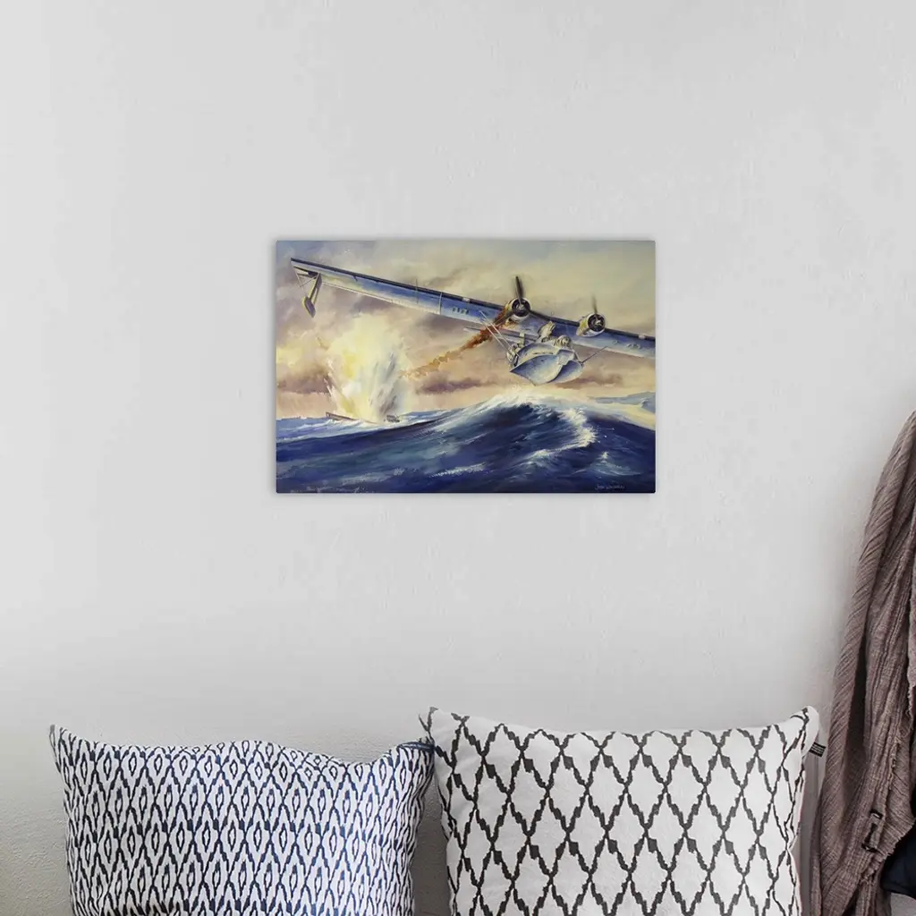 F/L David Hornell on his last mission June 24, 1944. Hornell's PBY Catalina aircraft was severly damaged after the attack and sinking of the German U-boat. Hornell successfully landed his damaged aircraft allowing the crew and himself to escape into the life dingy. Two of the crew members and Hornell unfortunately died of exposure before they were able to be rescued. Hornell was posthumously awarded the Victoria Cross. Watercolor painting..