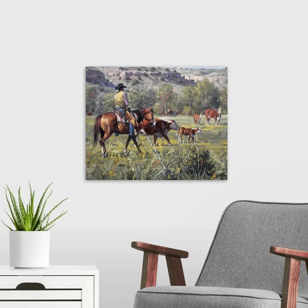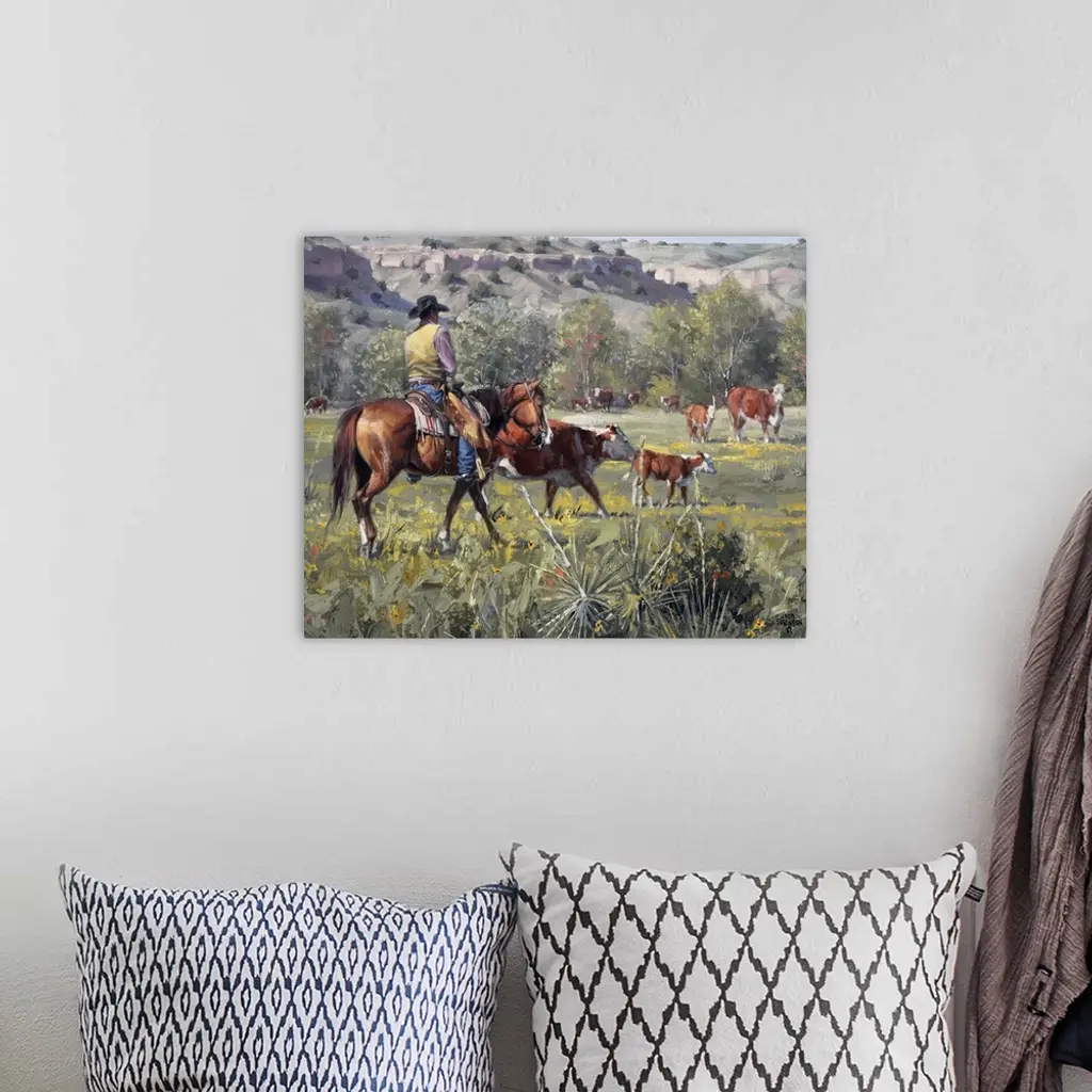 This contemporary artwork of a cowboy and his cattle reminds one of the simple times during yesteryear.