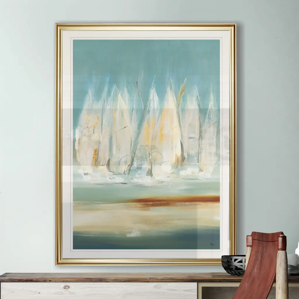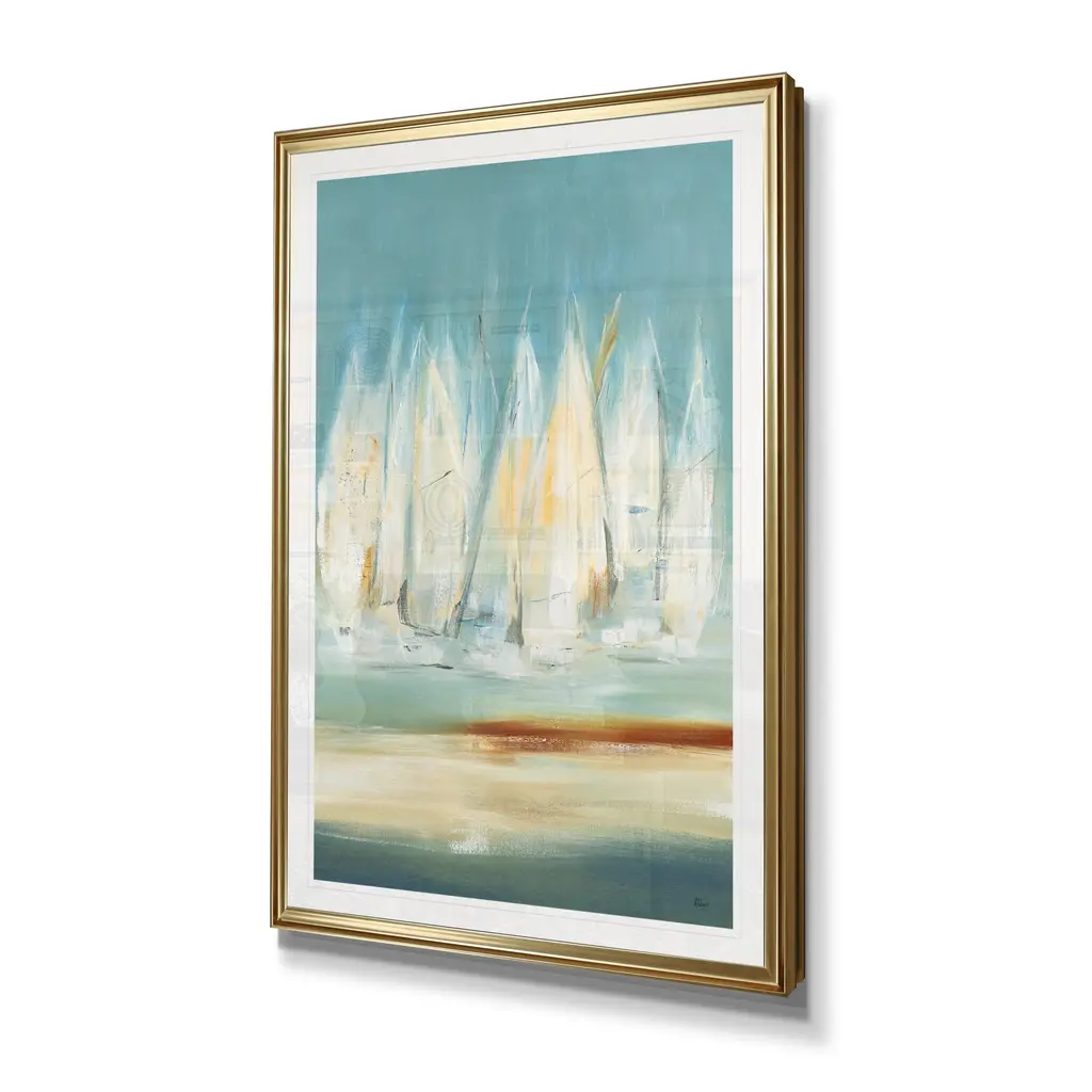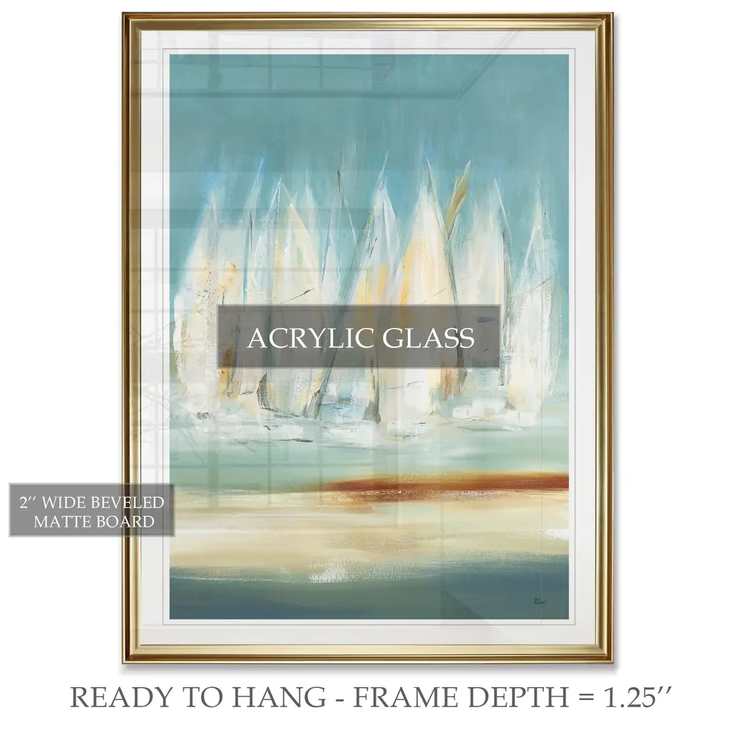 A Day to Sail I -Framed Giclee Print A premium framed giclee print under glass Featuring a beveled a solid wood stretcher bar, each piece comes ready to hand 4 SIZES AVILABLE 18''X24'' - Overall Size 22''x30'' - Overall Size 26''x36'' - Overall Size 30''x42'' - Overall Size Each piece is made to order. Built to Last Each piece comes ready to hang Acrylic Glass and 2'' Beveled Matt Board Fade resistant Made domestically