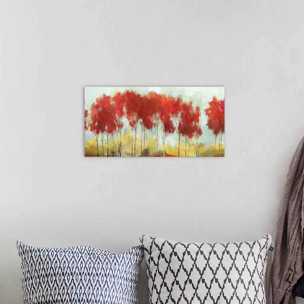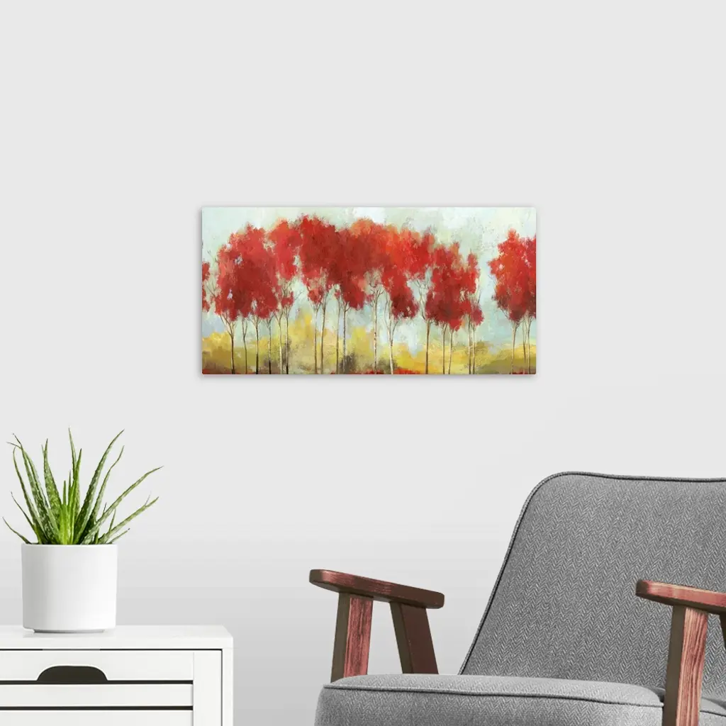 A long horizontal painting of a row of trees with bright red leaves in the fall.