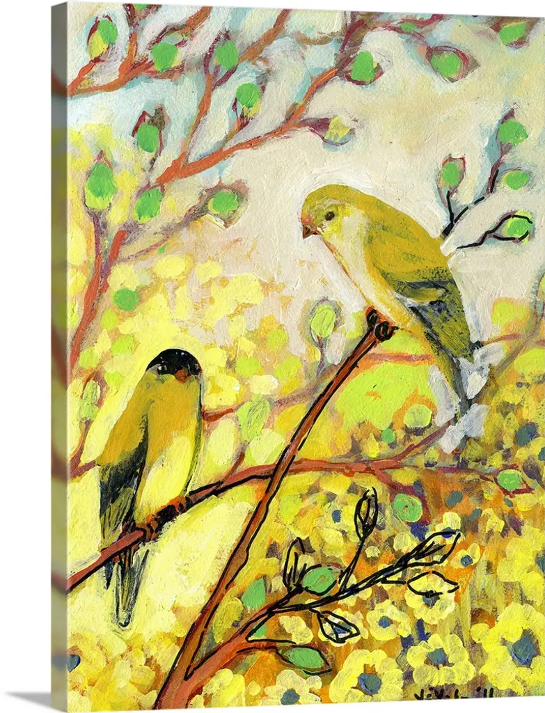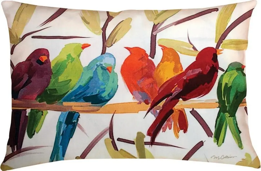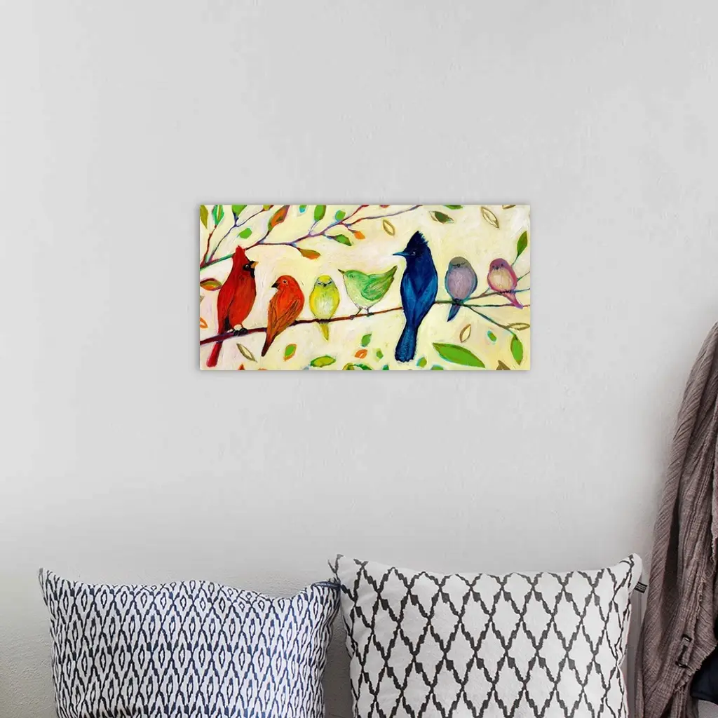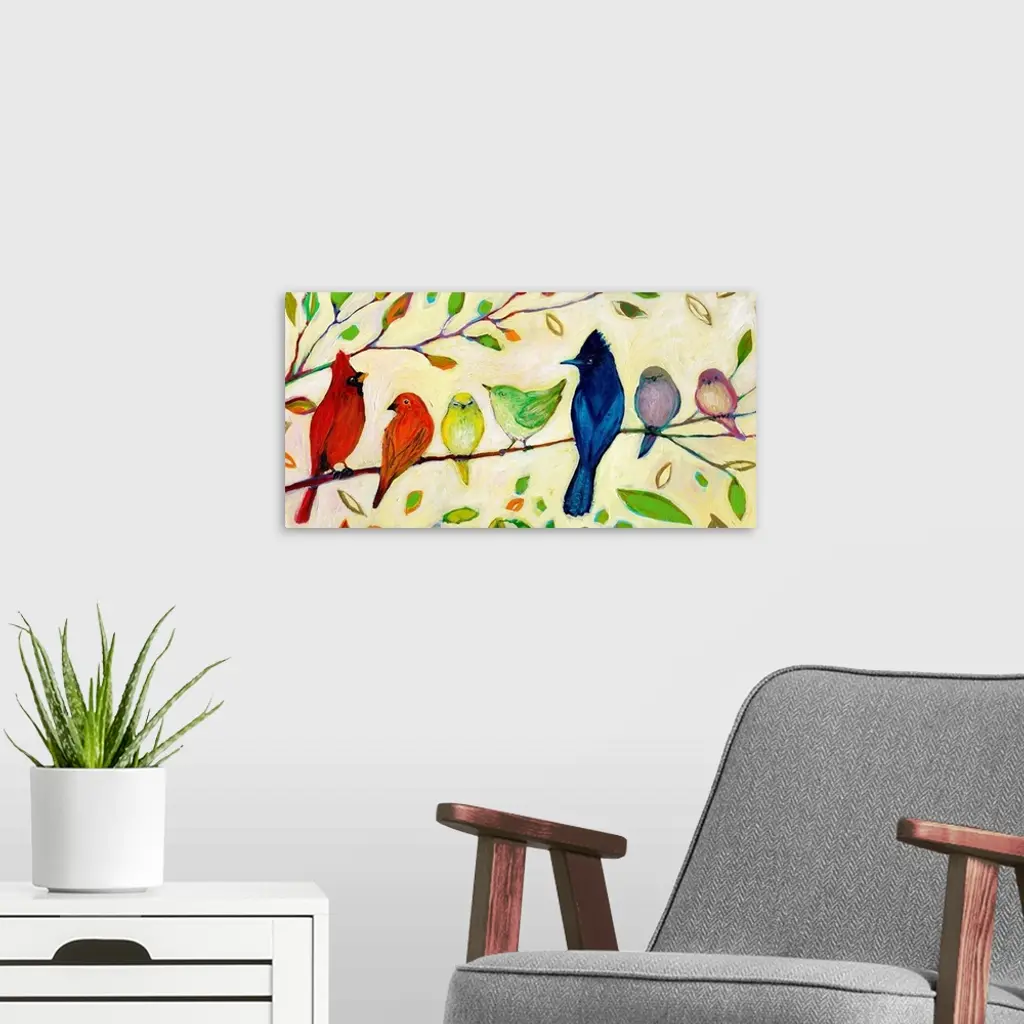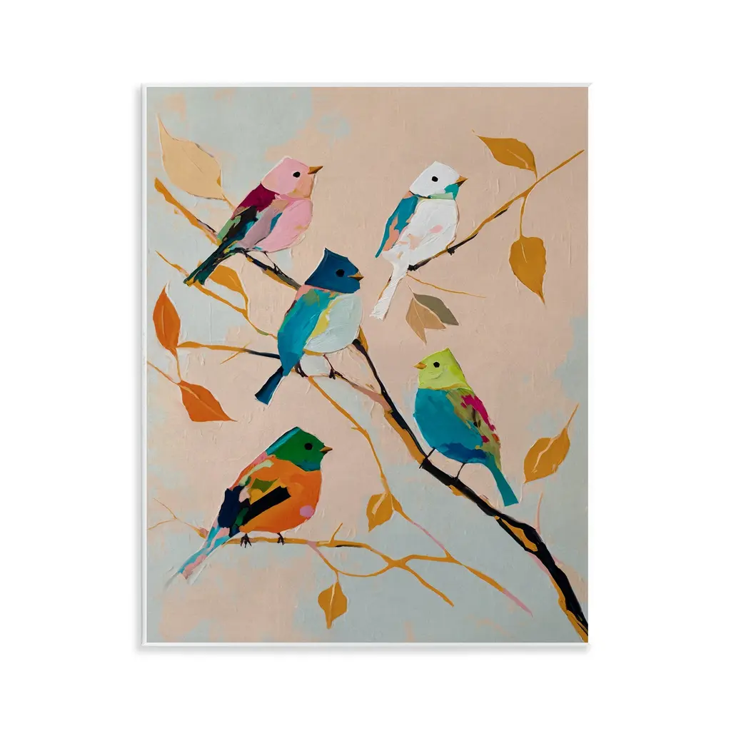 Seven birds that chromatically shift from warm to cool colors sitting on a tree branch in this decorative accent artwork for the home or office.