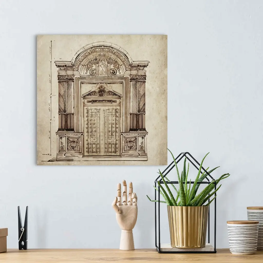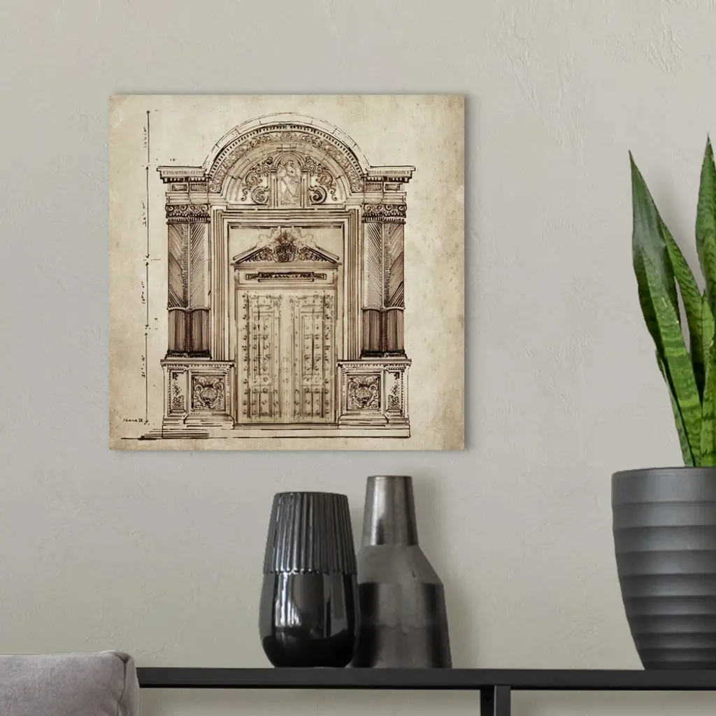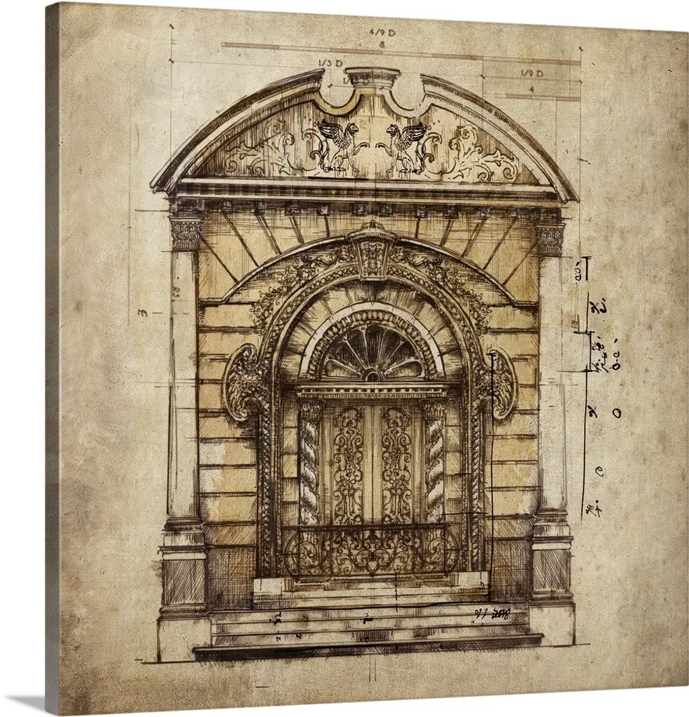 Contemporary artwork of an architectural drawing, in a weathered and rustic style.