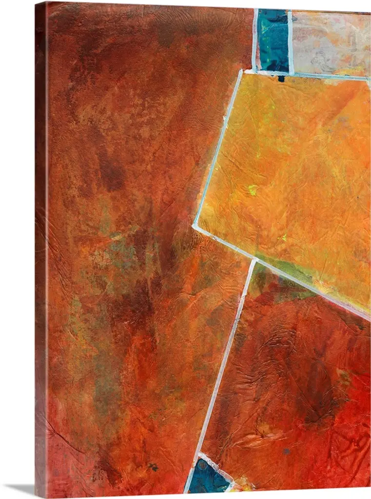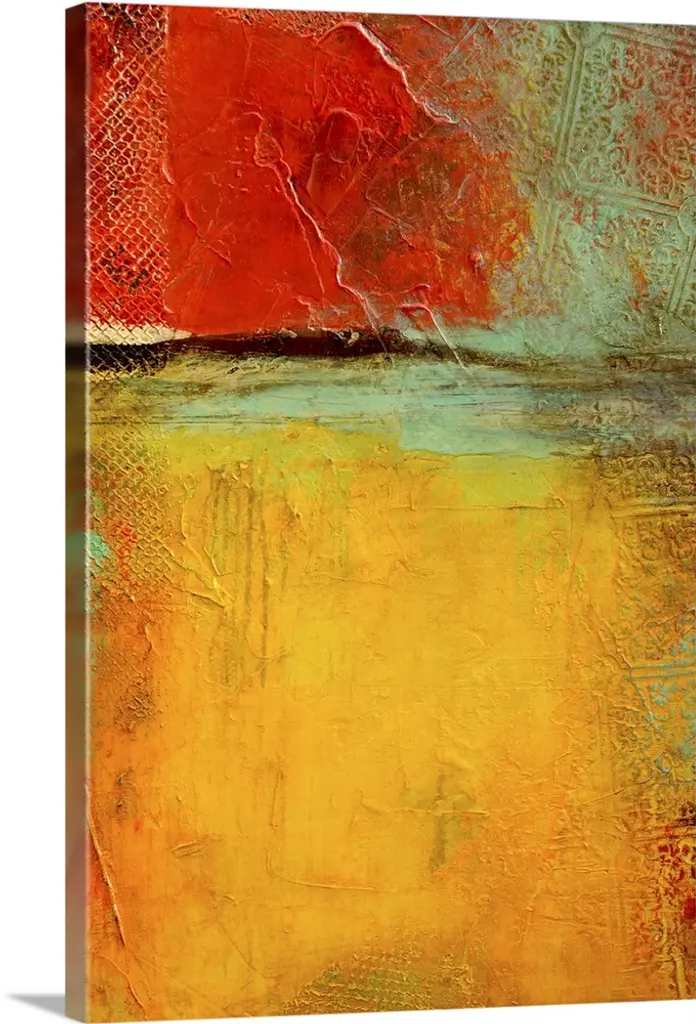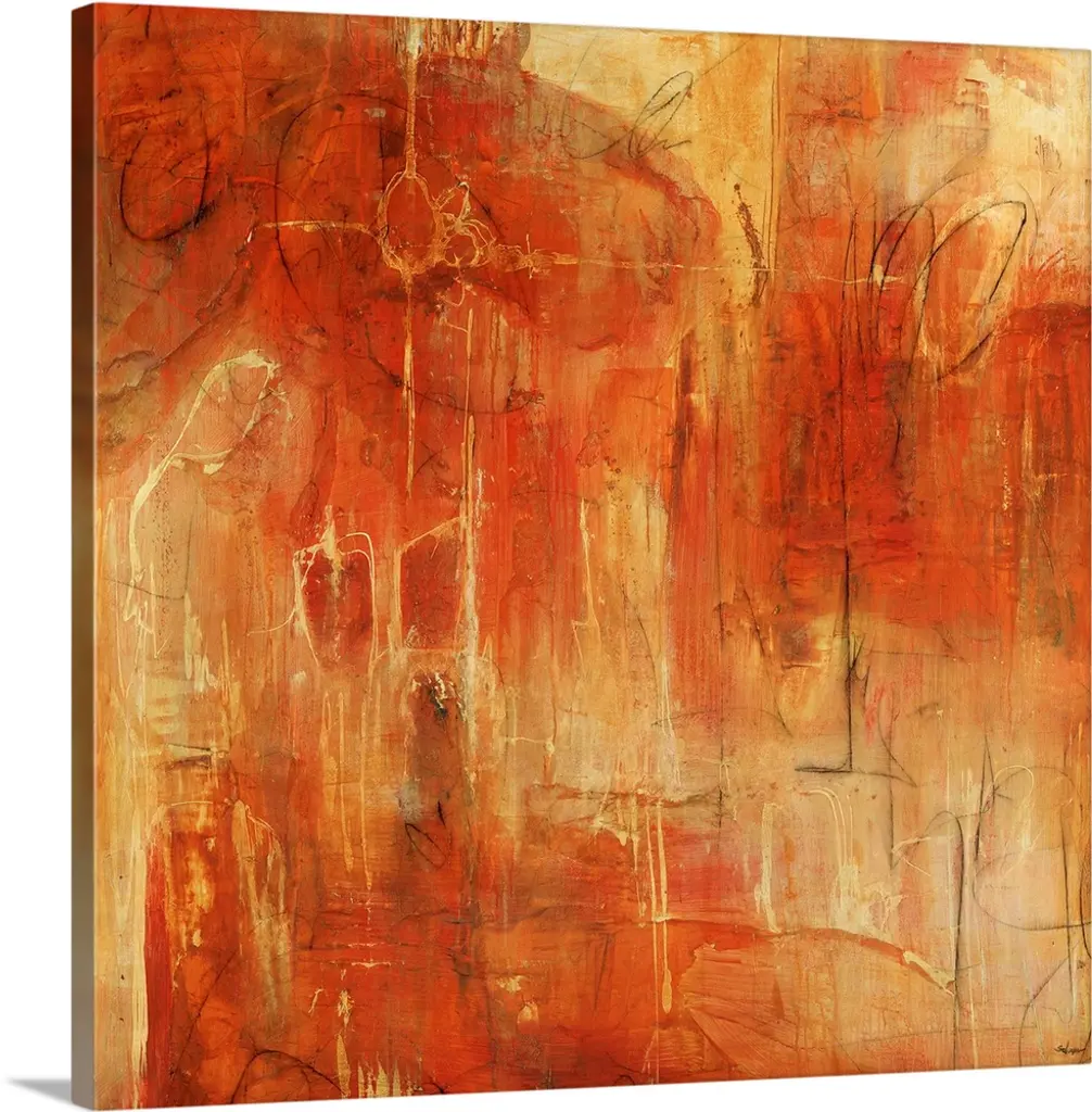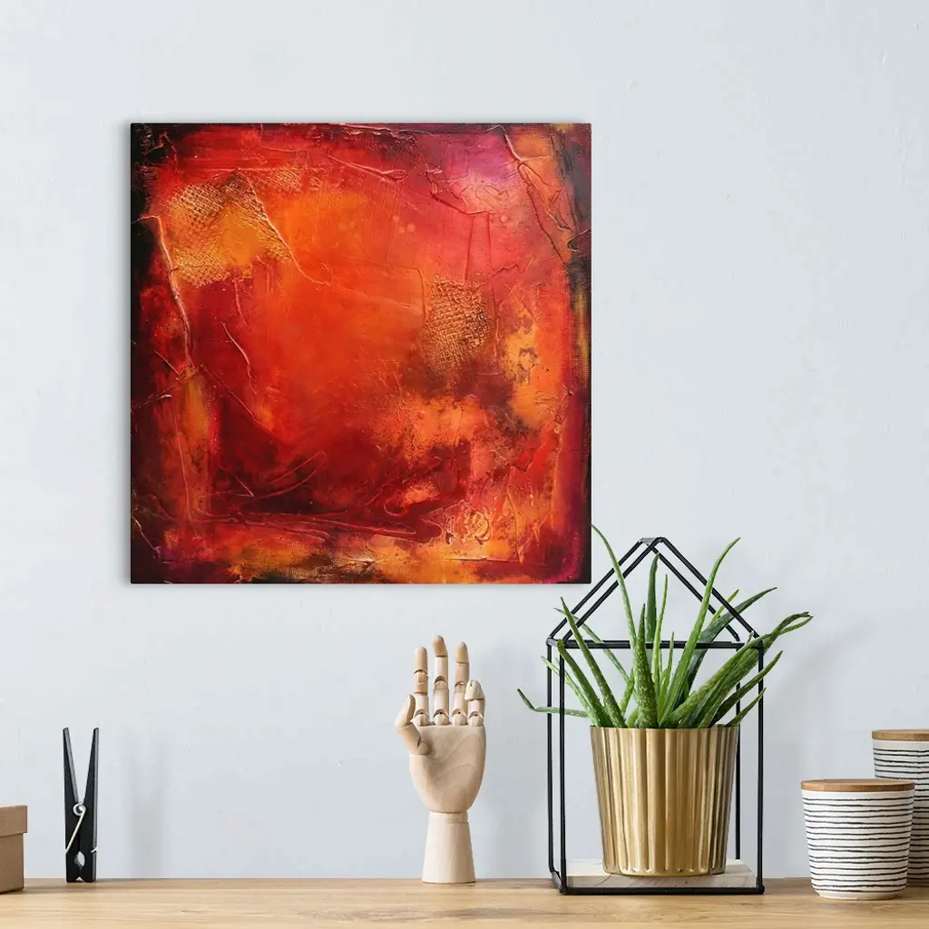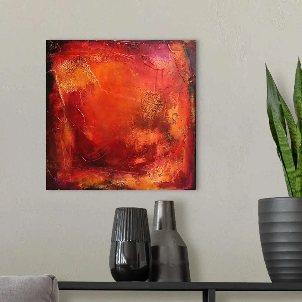 A square contemporary abstract painting full of texture and dimension from the palette knife with a variety of deep and light red hues in combination with yellow, gold, orange, and black hues spread throughout.