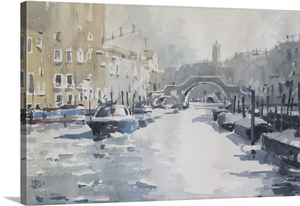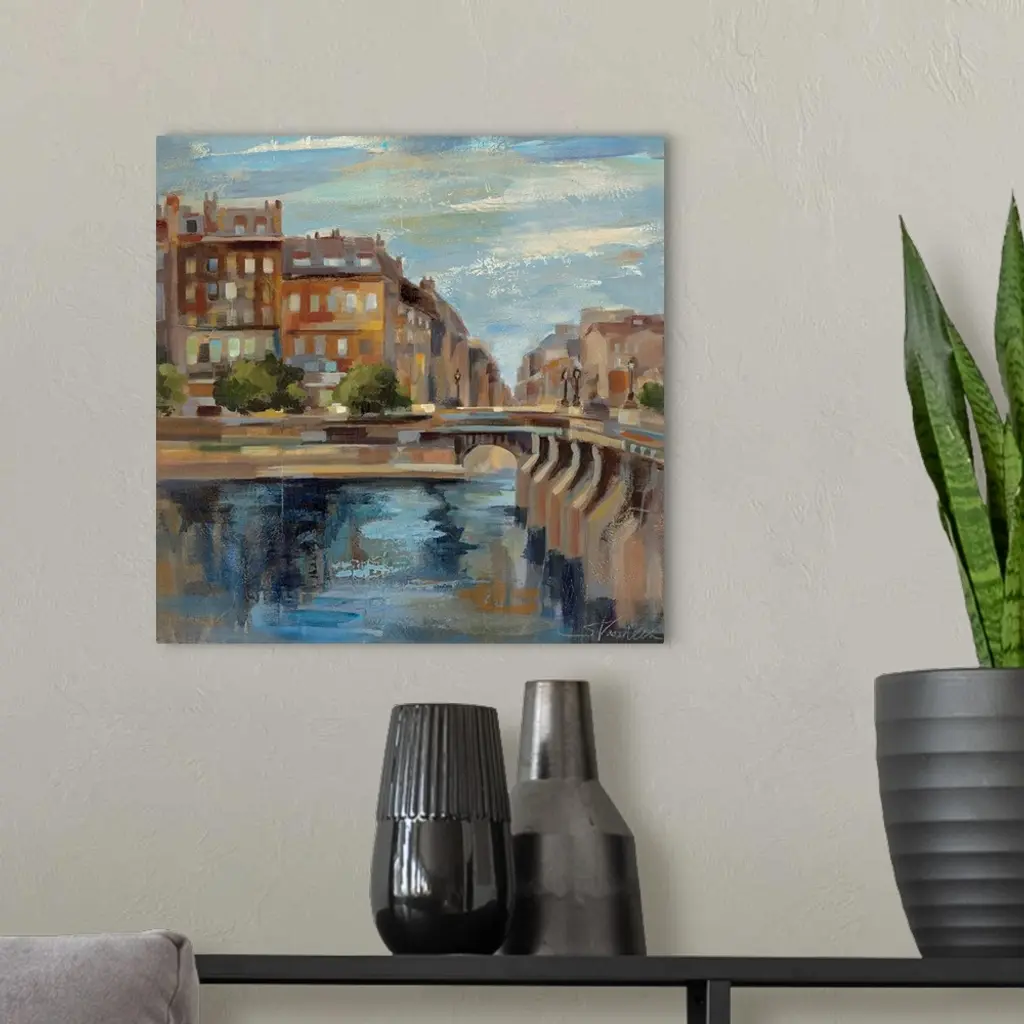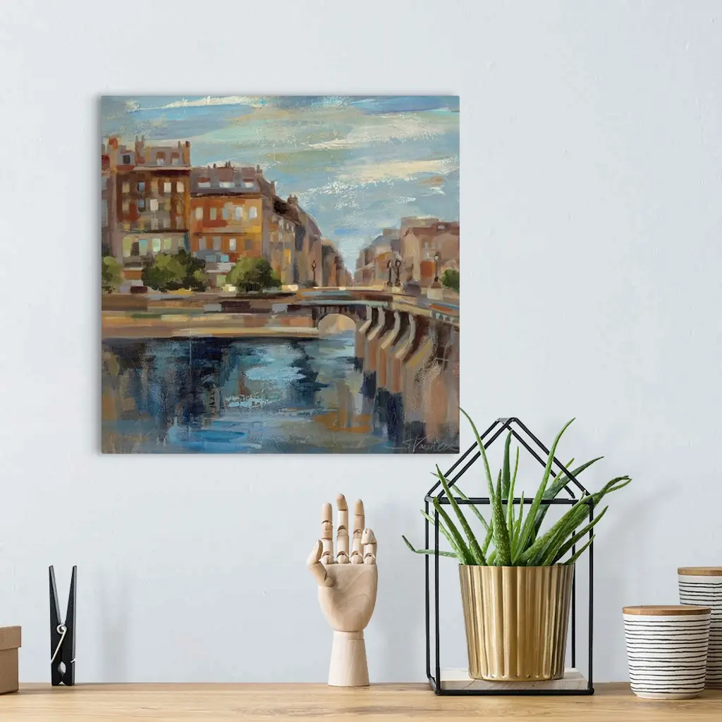 This contemporary artwork is a painting of scenery in Paris with a small bridge over water and buildings straight ahead.