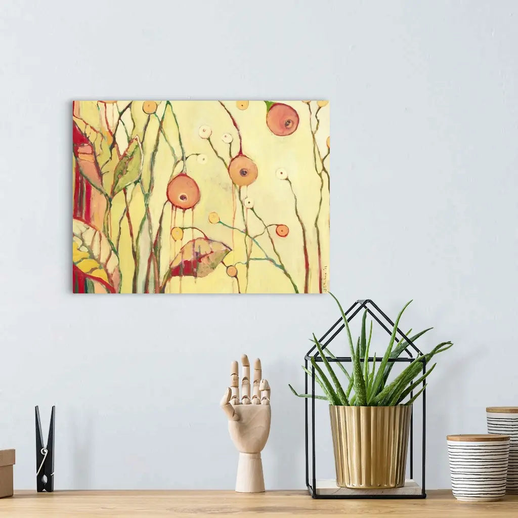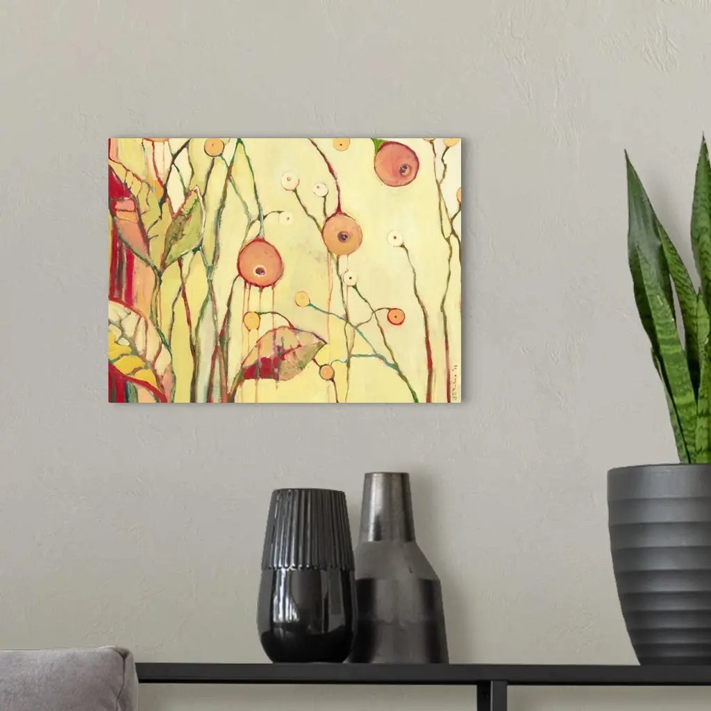 A piece of contemporary artwork showing flowers that are bent over and have the paint dripping down.