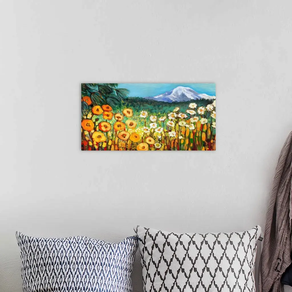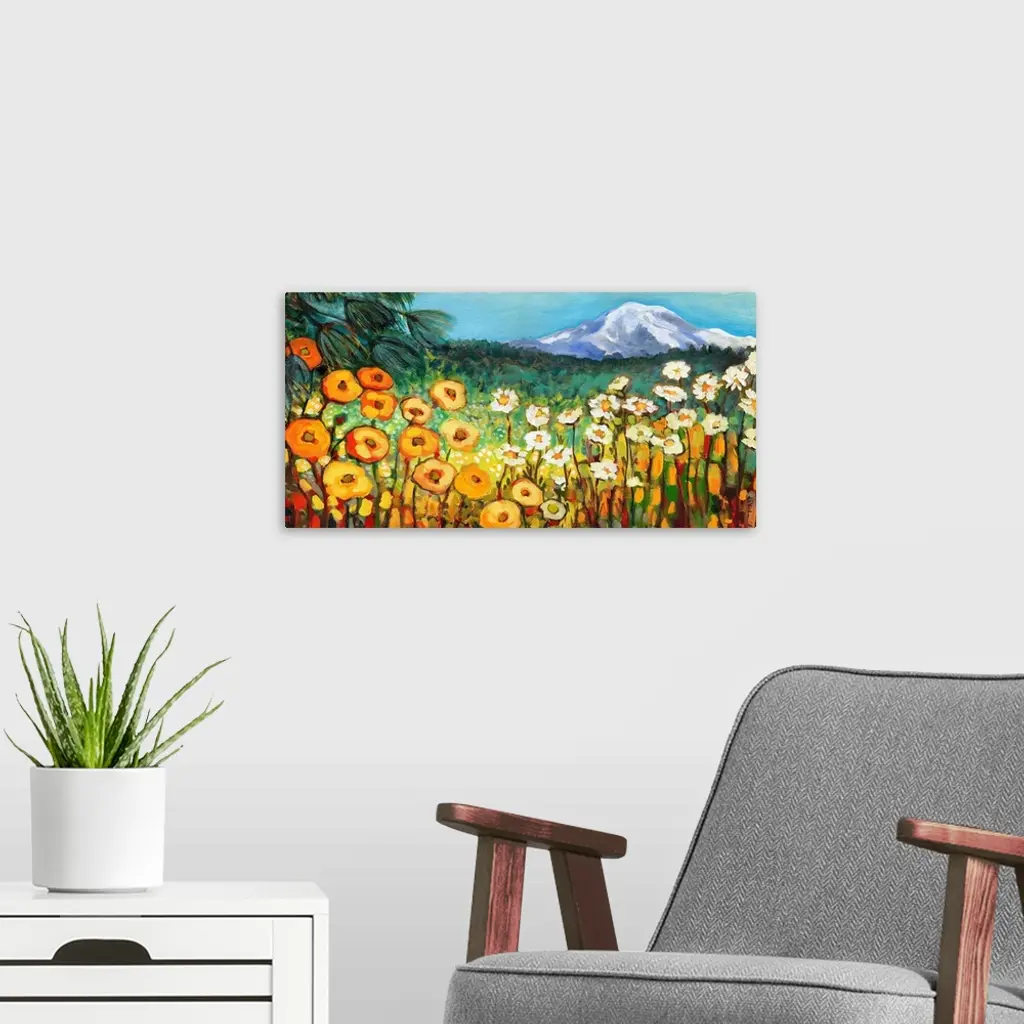 Contemporary painting of a Washington landscape with poppies and other wildflowers in the foreground and Mount Rainier in the distance.