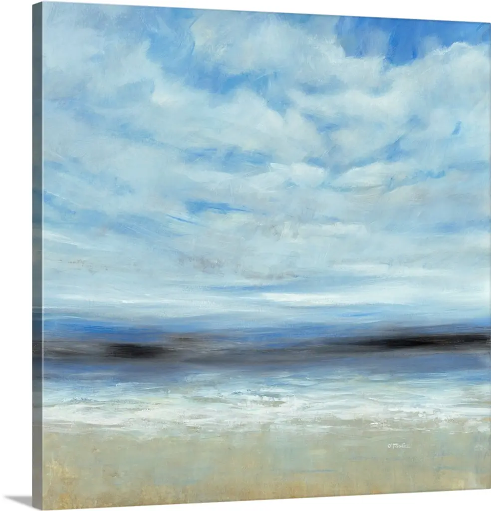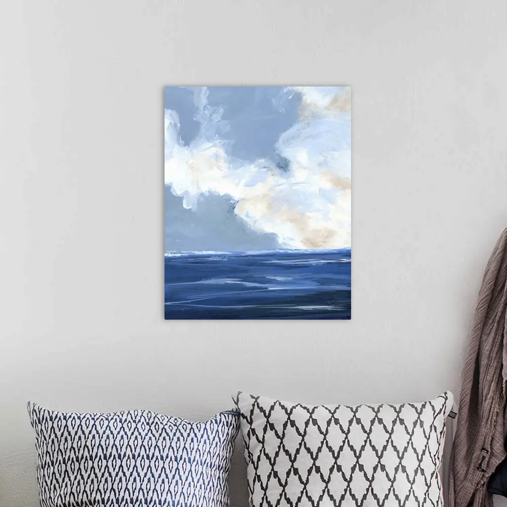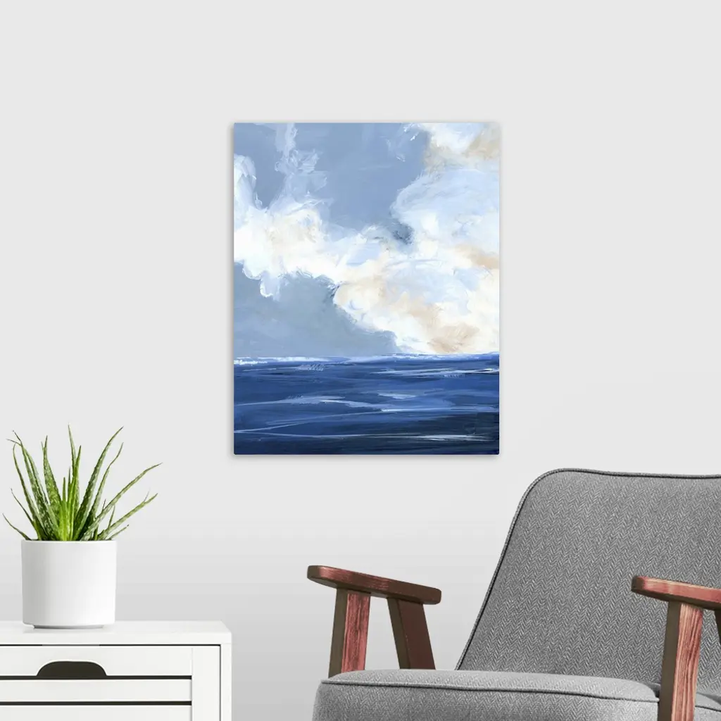 Contemporary painting of a calm ocean with large white clouds on the horizon.