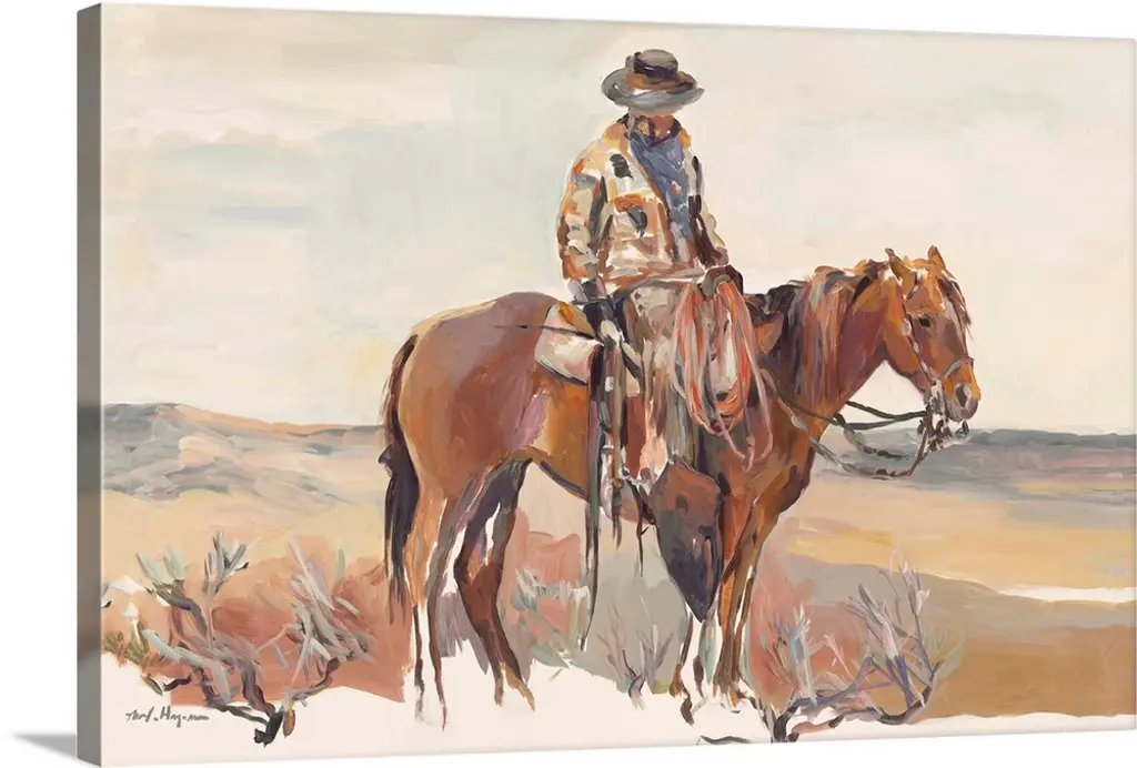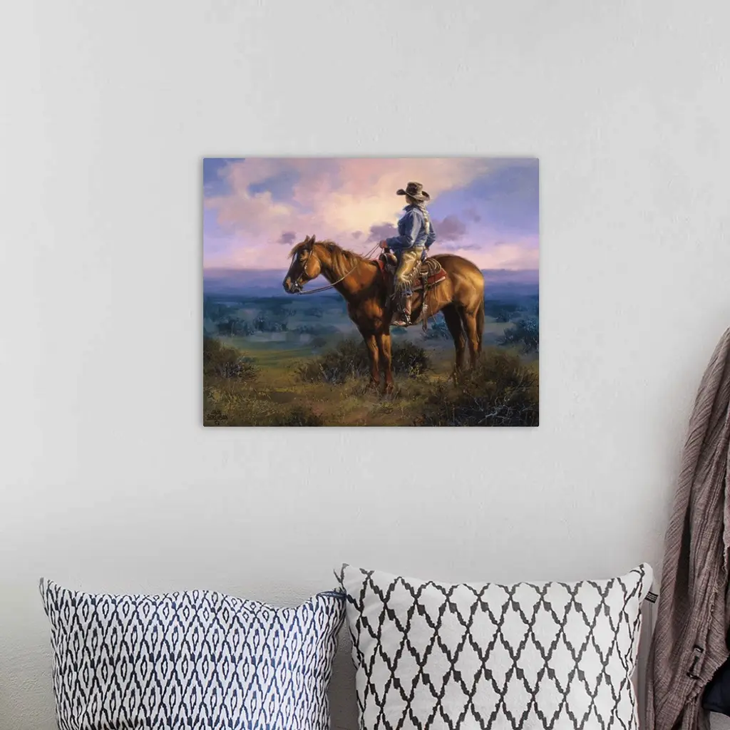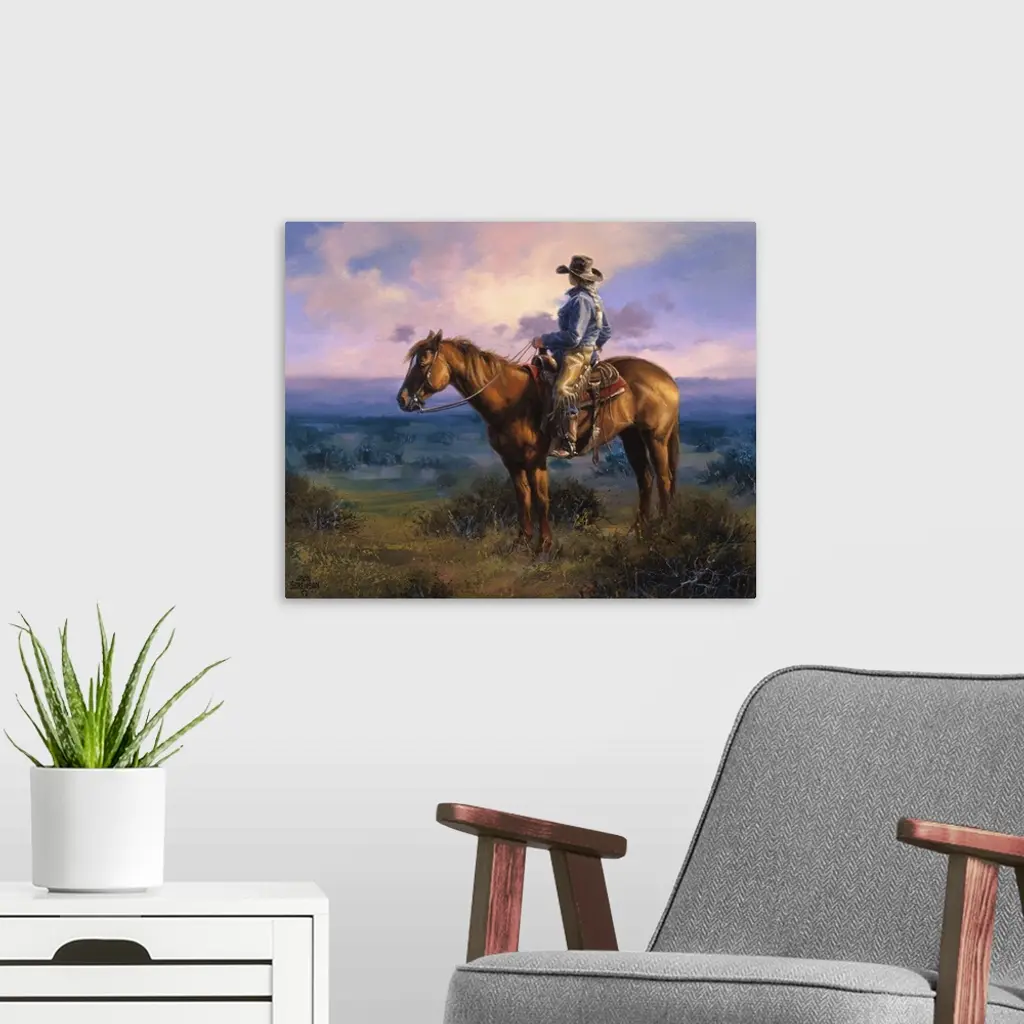 Contemporary Western artwork of a cowboy on his horse in the glow of the setting sun.