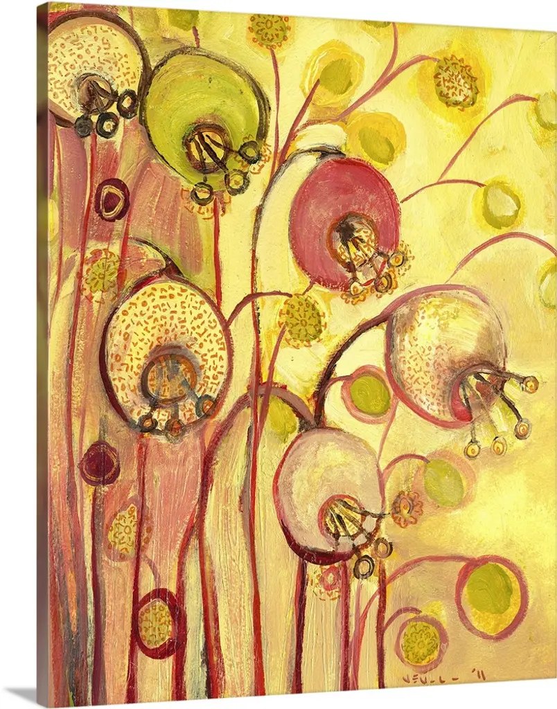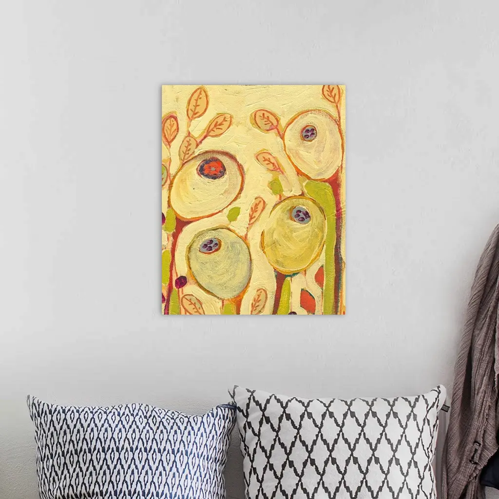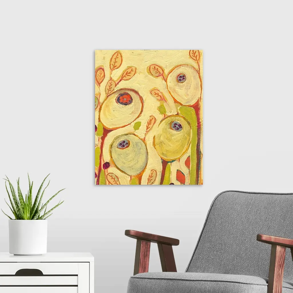 Big, vertical, contemporary floral painting of several large posy flowers surrounded by small leaves, on a golden background. Painted with thick, multidirectional brushstrokes.