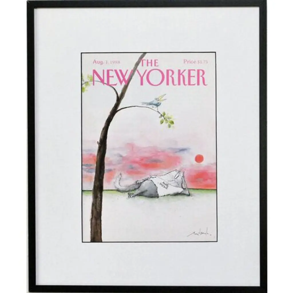 Original New Yorker cover from August 1, 1988. Based on an illustration by the English artist and satirical cartoonist Ronald Searle (1920-2011). Displayed in a conservation mat in a black metal frame under ultraviolet conservation glass. Image: 8"L x 11"H; overall: 13"L x 16"H. This beautifully framed original New Yorker cover arrives ready to hang. Includes a certificate with additional information and a brief history of New Yorker magazine cover art.