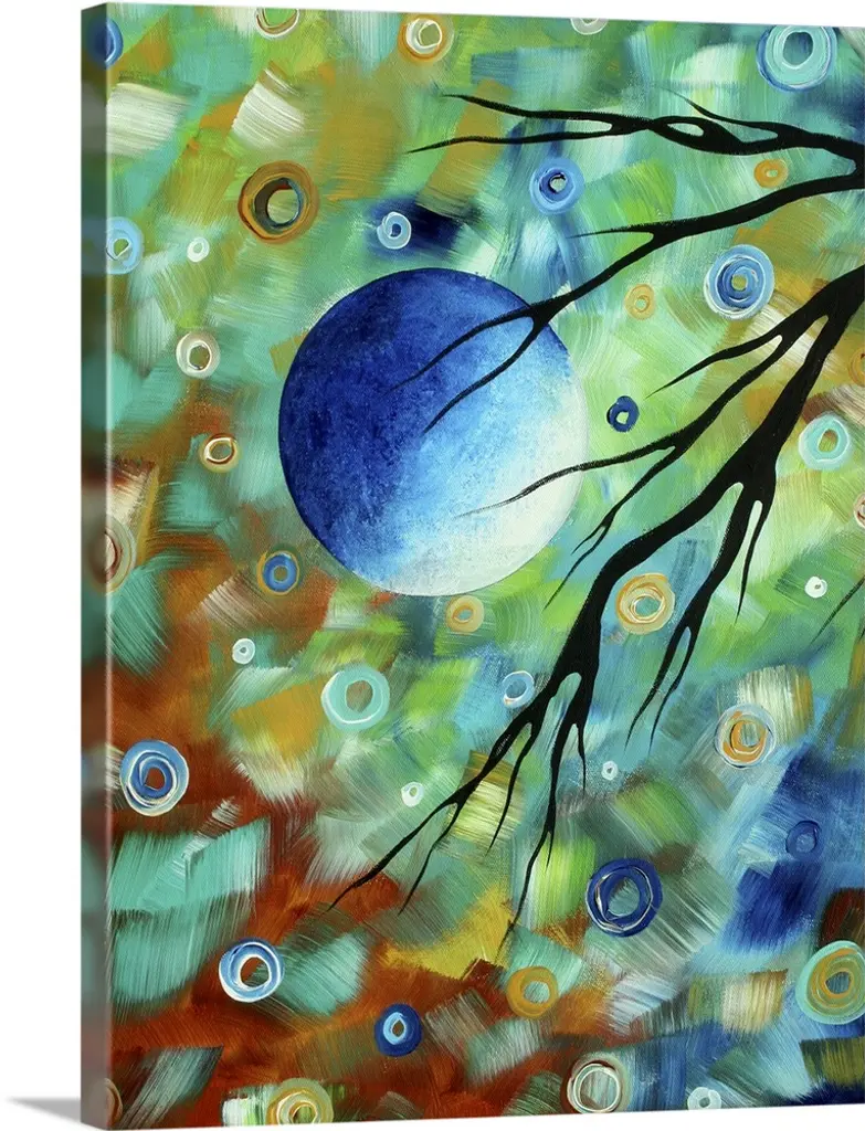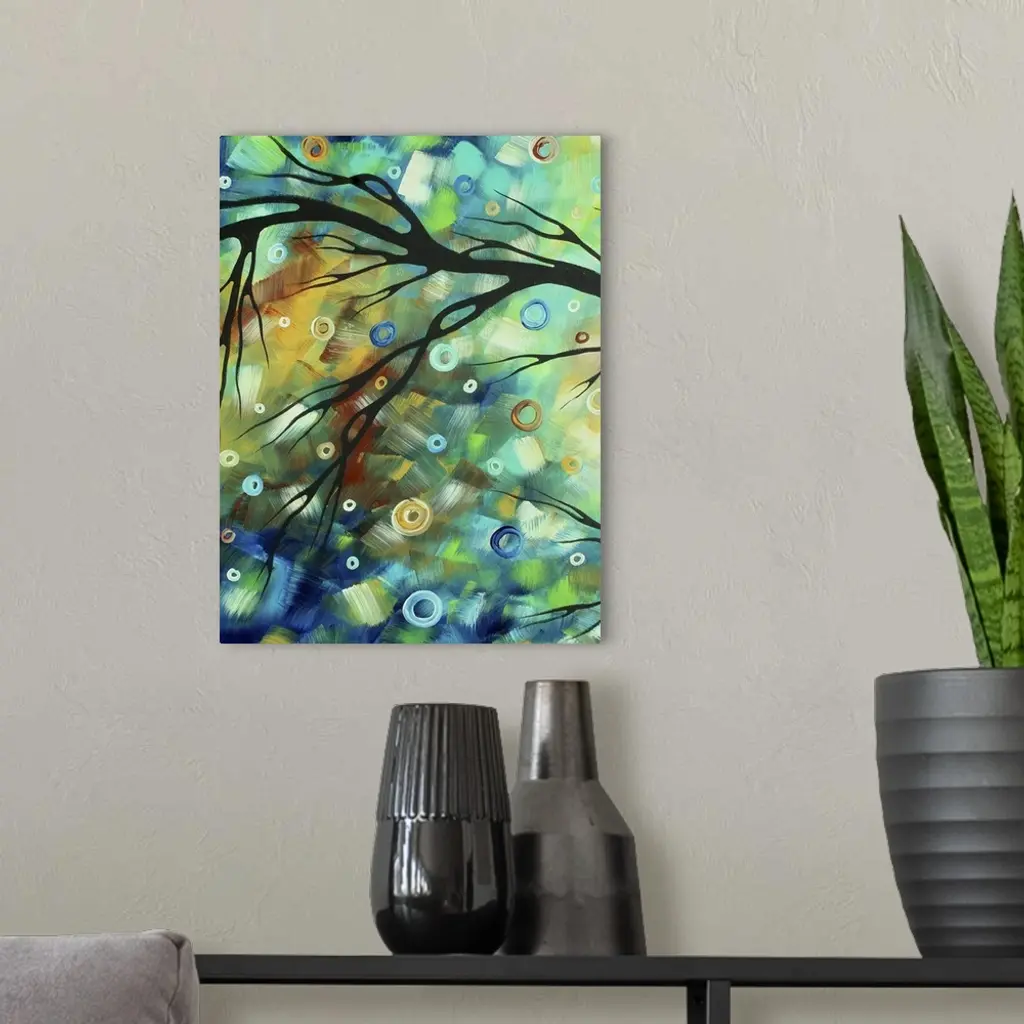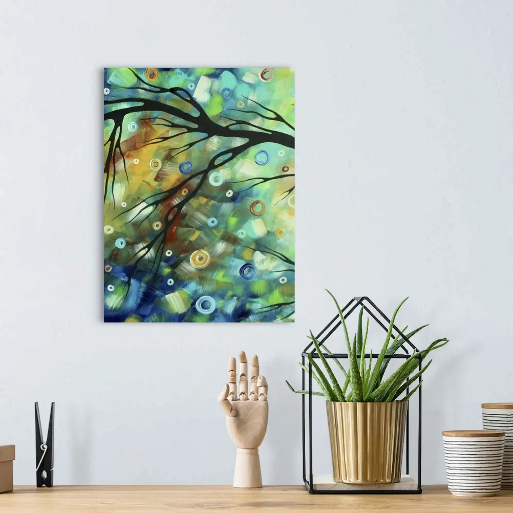 Tall abstract painting of patches of color with the silohuette of a branch over top.