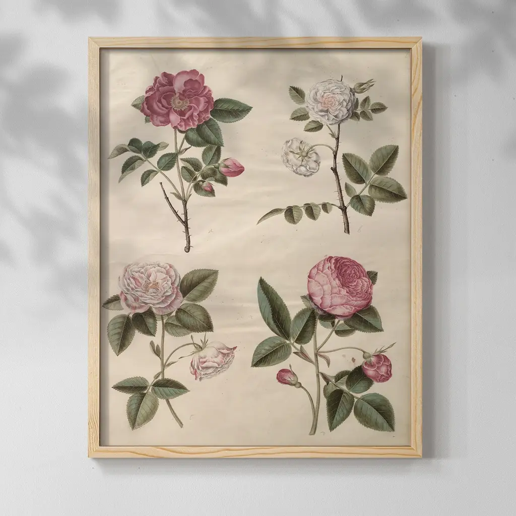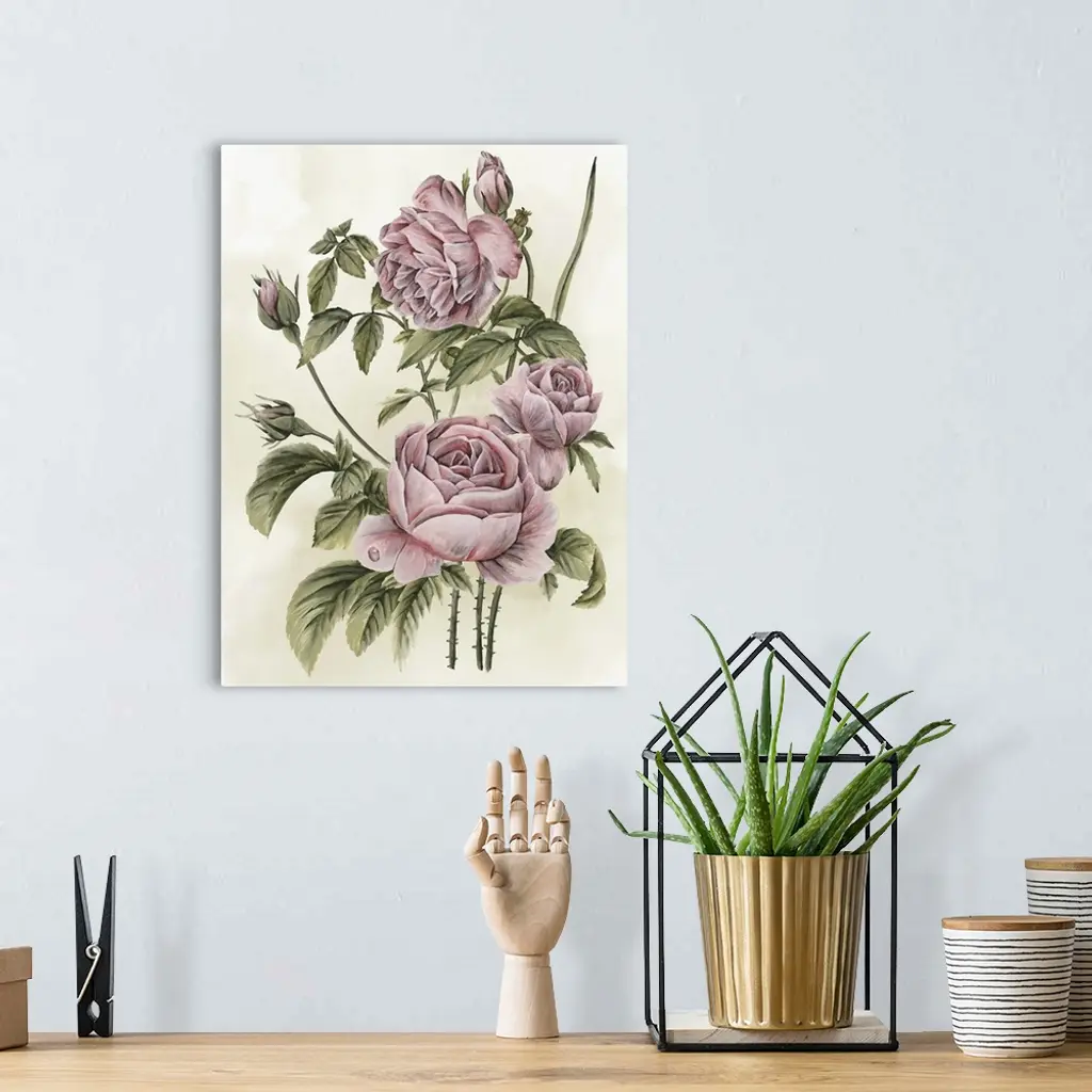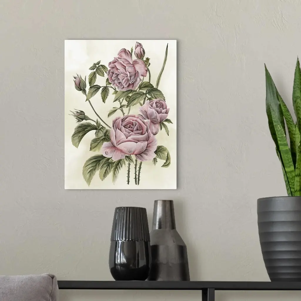 This contemporary painting features a bouquet of romantic flowers in shades of pink with the leaves in a soft green against a gradated background.