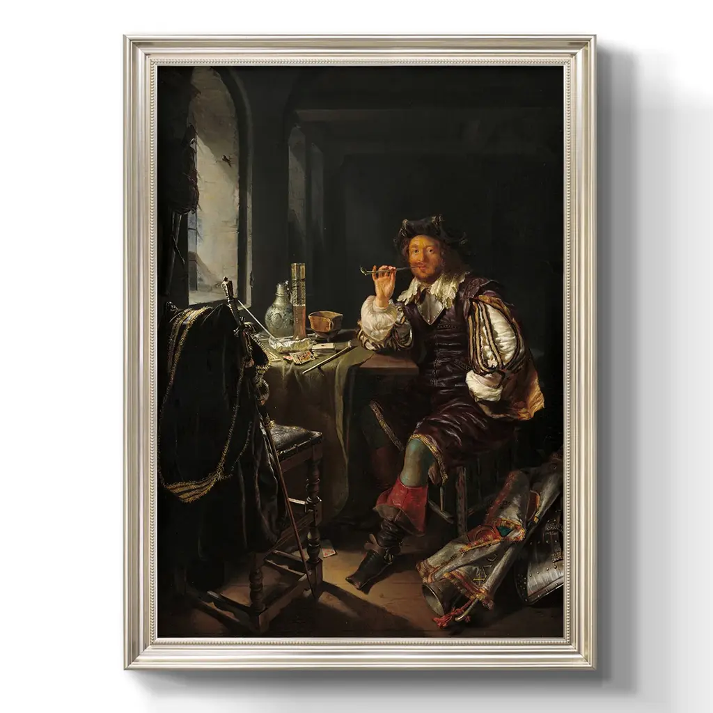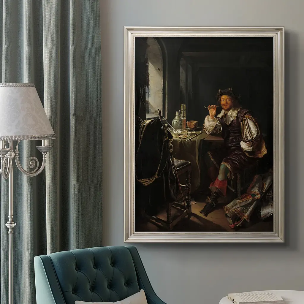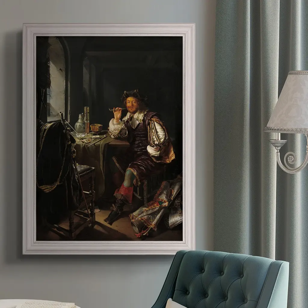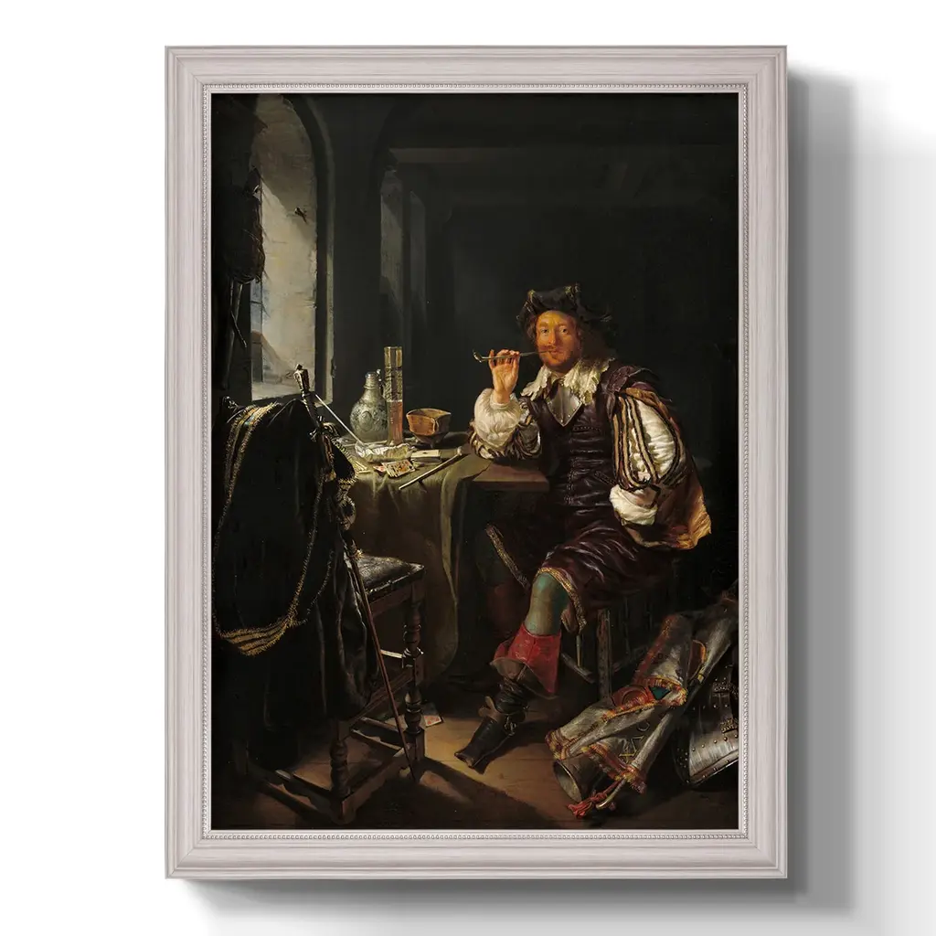 A Soldier Smoking a Pipe Premium Framed Canvas- Ready to Hang A Premium Framed Canvas created to last. Framed in distressed wood and available in an array of sizes and colors Featuring a beveled a solid wood stretcher bar, each piece comes ready to hand 3 SIZES AVAILABLE 16''X20'' - Overall Size 18'X27'' - Overall Size 24''x36'' - Overall Size Each piece is made to order. Each piece comes with hanging hardware. Made in the USA Ready to Hang Giclee Paper Print Acrylic Glass Beveled Matt Board