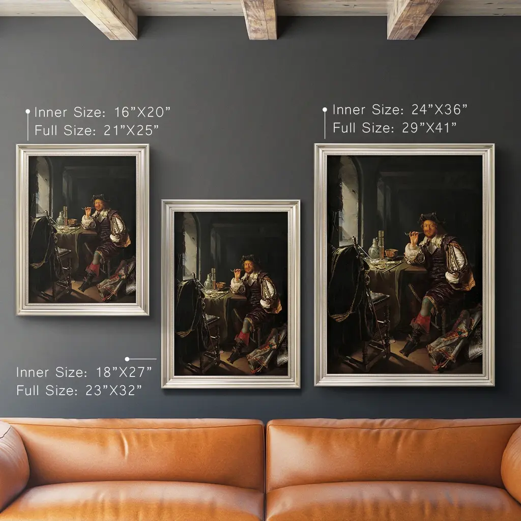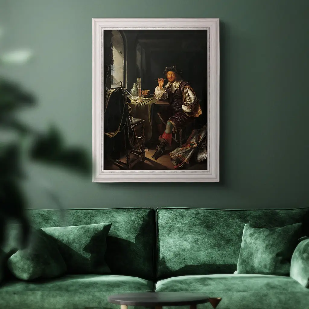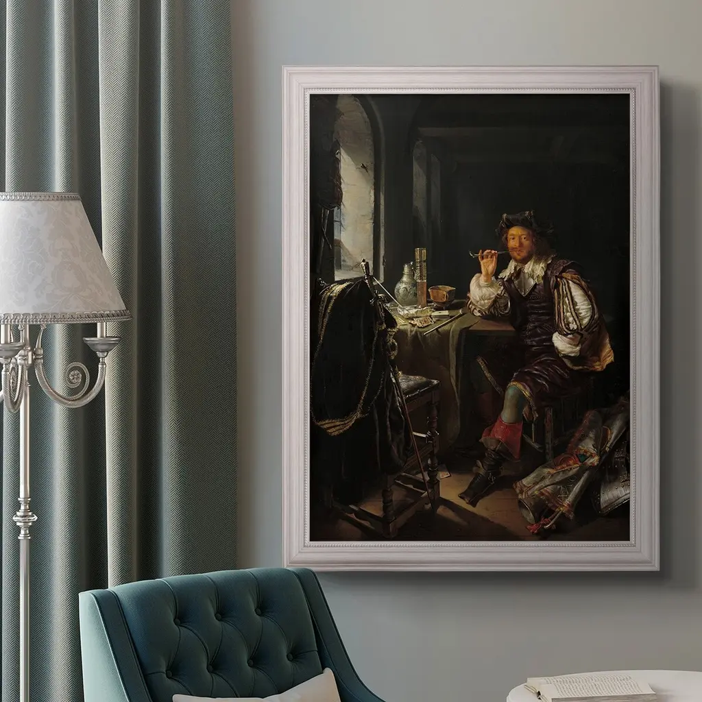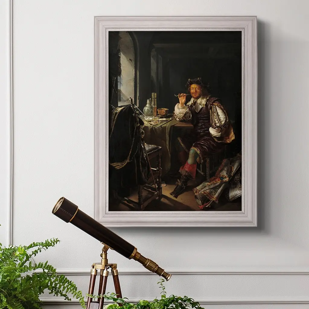 A Soldier Smoking a Pipe Premium Framed Canvas- Ready to Hang A Premium Framed Canvas created to last. Framed in distressed wood and available in an array of sizes and colors Featuring a beveled a solid wood stretcher bar, each piece comes ready to hand 3 SIZES AVAILABLE 16''X20'' - Overall Size 18'X27'' - Overall Size 24''x36'' - Overall Size Each piece is made to order. Each piece comes with hanging hardware. Made in the USA Ready to Hang Giclee Paper Print Acrylic Glass Beveled Matt Board