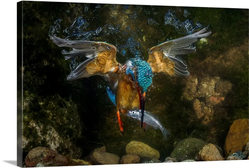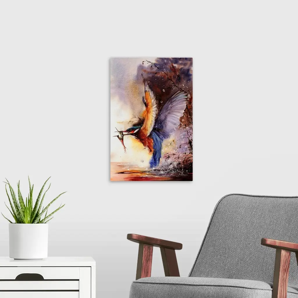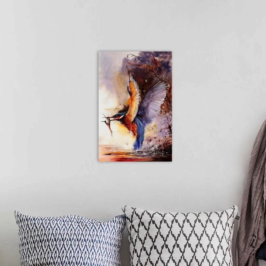 Watercolor painting of a Kingfisher catching a fish from the river.