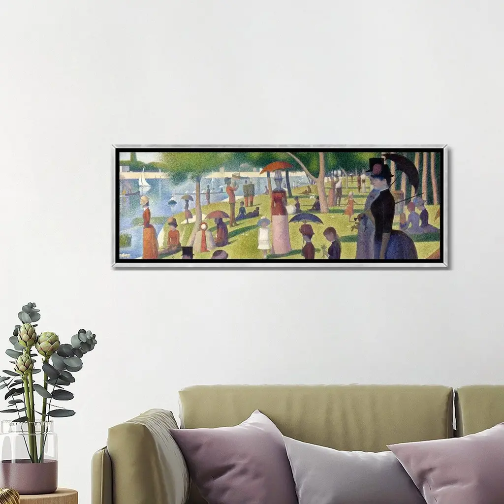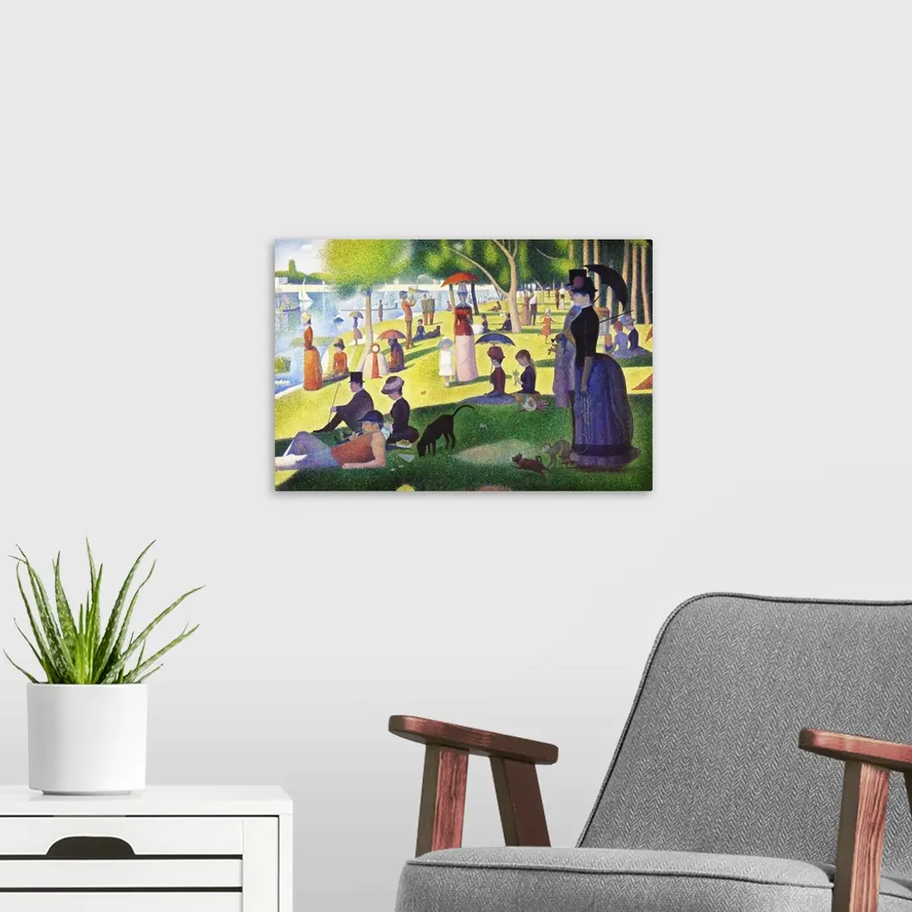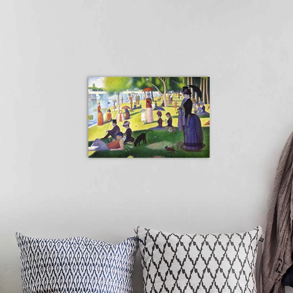 "Bedlam," "scandal," and "hilarity" were among the epithets used to describe what is now considered Georges Seurat's greatest work, and one of the most remarkable paintings of the nineteenth century, when it was first exhibited in Paris. Seurat labored extensively over, A Sunday on La Grande Jatte - 1884, reworking the original as well as completing numerous preliminary drawings and oil sketches (the Art Institute has one such sketch and two drawings). With what resembles scientific precision, the artist tackled the issues of color, light, and form. Inspired by research in optical and color theory, he juxtaposed tiny dabs of colors that, through optical blending, form a single and, he believed, more brilliantly luminous hue. To make the experience of the painting even more intense, he surrounded the canvas with a frame of painted dashes and dots, which he, in turn, enclosed with a pure white wood frame, similar to the one with which the painting is exhibited today. The very immobility of the figures and the shadows they cast makes them forever silent and enigmatic. Like all great master-pieces,La Grande Jatte continues to fascinate and elude.