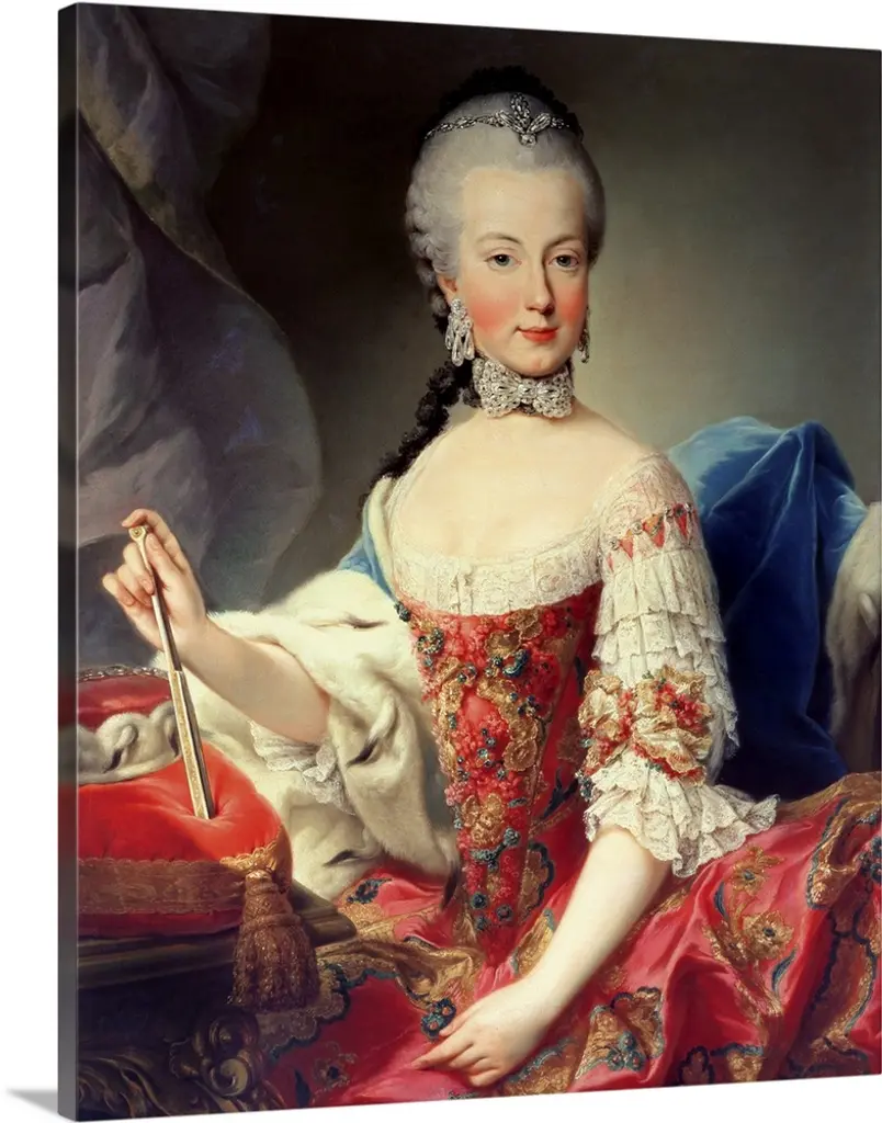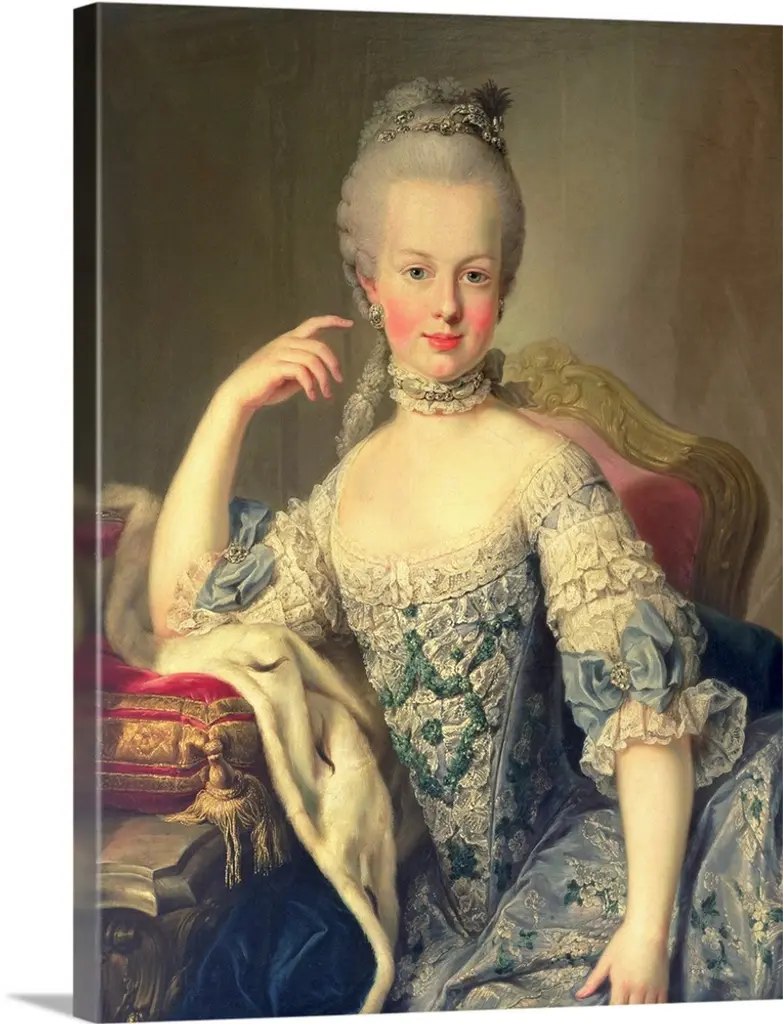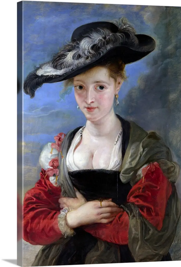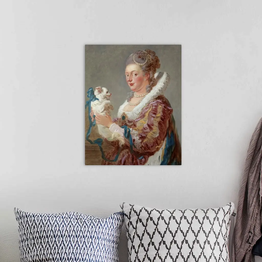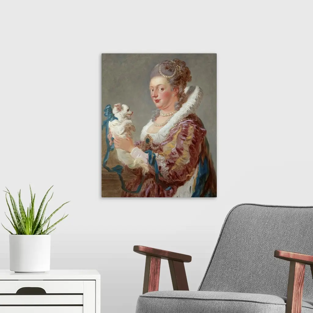 The model's costume recalls the court dress in which Rubens depicted Marie de Medicis (1573-1642), queen of France, in the series of famous paintings in the Musee du Louvre. She has recently been identified as Marie Emilie Coignet de Courson (1727-1806). Fragonard's canvas is broadly brushed, with exceptional virtuosity and panache. There is humor in the contrast between the ample proportions of the lady and the small size of her lapdog; the curl of his silky tail echoes her gray ringlets. Her pearls are too large to have been real.