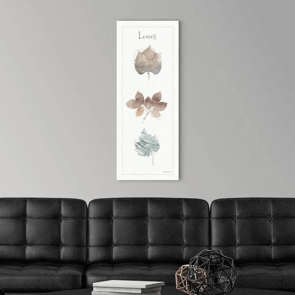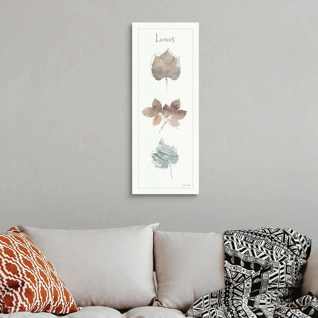 Watercolor painting of a variety of types of leaves on an off white background with a thin line border and the word "Leaves."