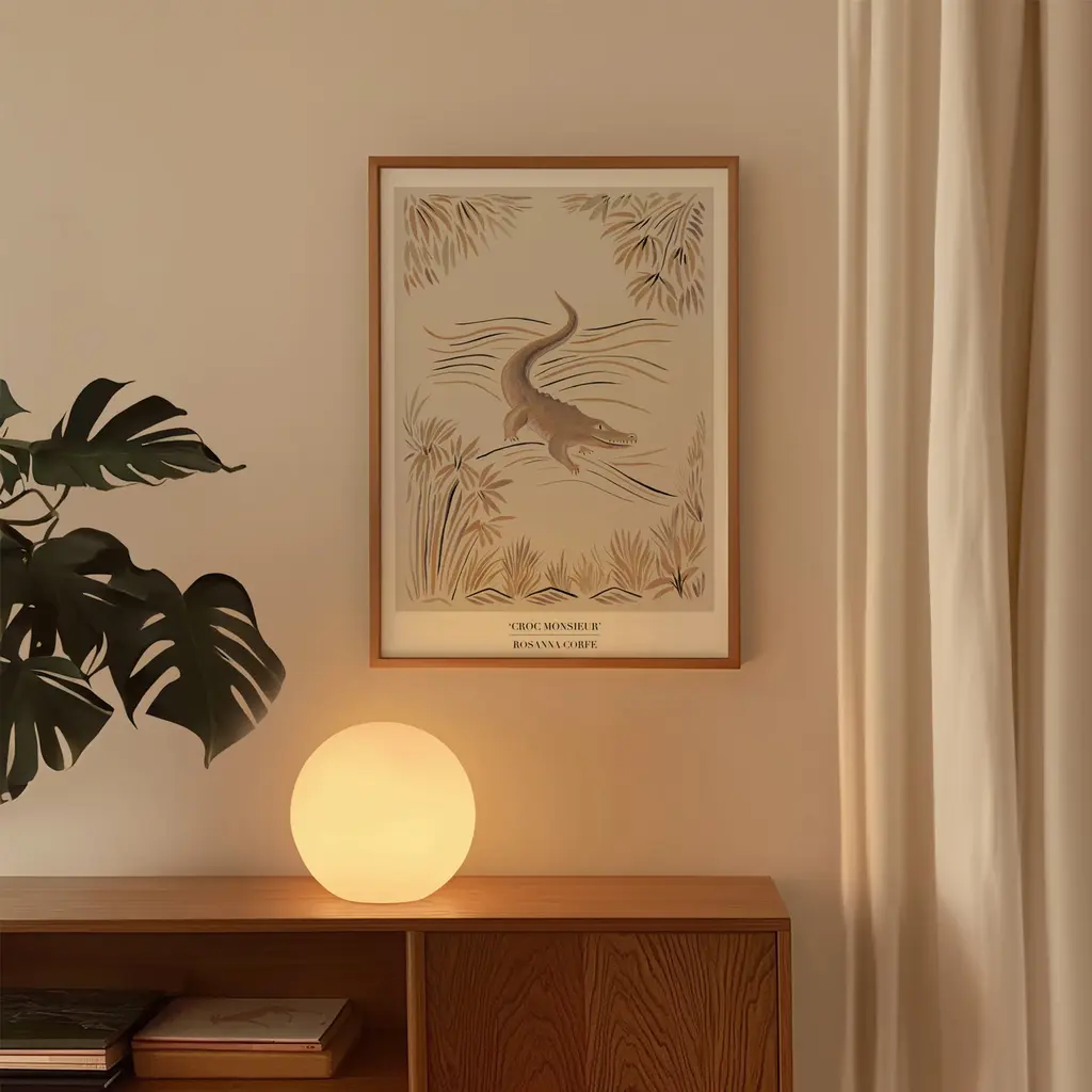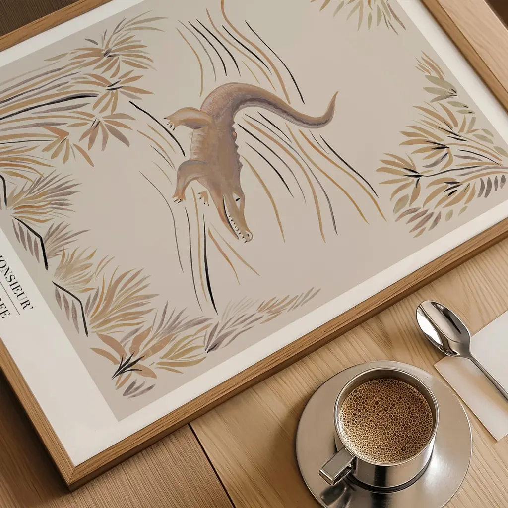 The playful Croc Monsieur fine art print was originally painted by Rosanna Corfe in ink and gouache and this wall print wonderfully replicates the delicate details and textures of the original artwork. Featuring a fun and playful crocodile drawing in a beautiful subtle beige colour palette, this artwork is both contemporary and timeless and will be a statement piece in your interiors.Paper size A4 Printed in the UK onto Matt Heavy 300gsm Recycled paperSupplied unframed