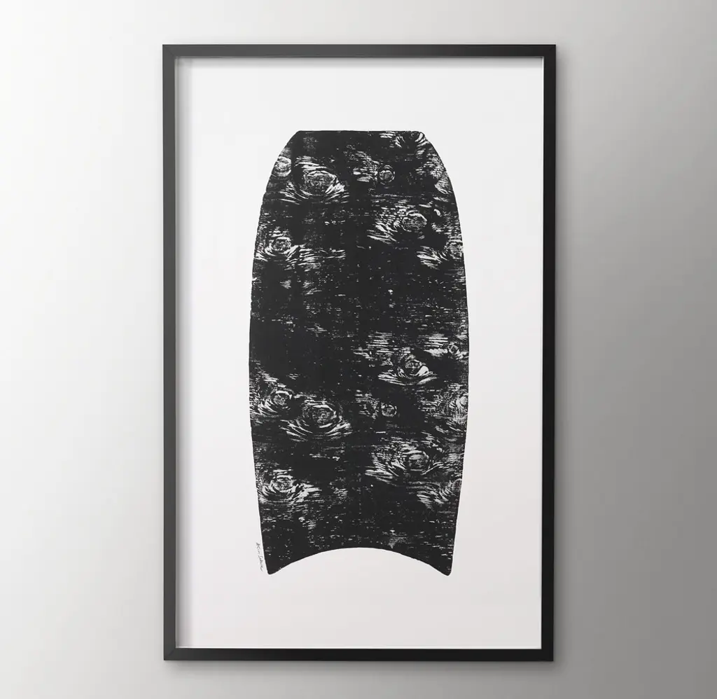 An homage to surf culture, Aaron Seltzer's handcrafted life-size woodblock print brings a California-Hawaii influence to a traditional Japanese artform. Seltzer taps into sensory memories of the ocean through the iconic form of a bodyboard. The grain of the wood block visible in the image adds a sense of age and connection to nature.