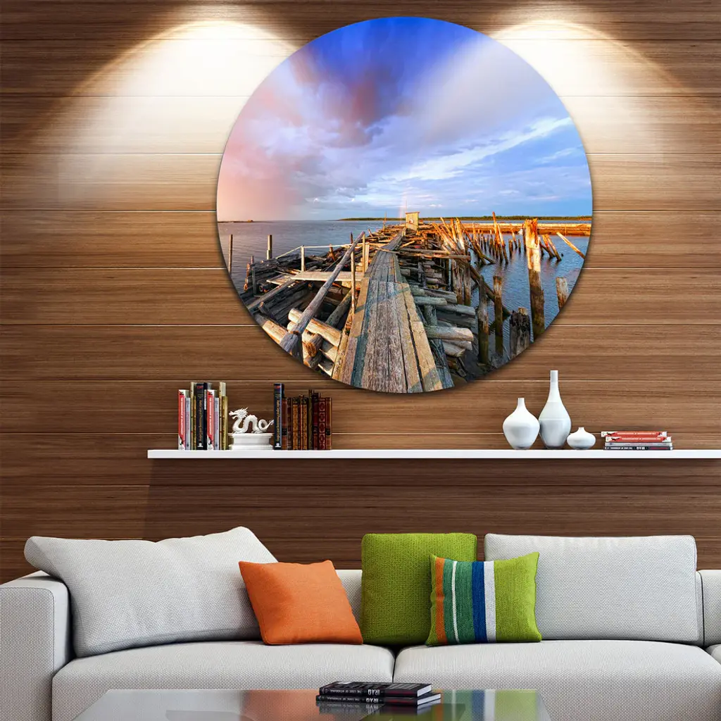 Bring Contemporary Abstraction to your home with this large Circle Metal wall art. This Abandoned Wooden Pier and Blue Sky Metal Artwork makes it the focal point of any room or office. - White Gloss Coating ensures colors are extra vibrant with light reflection.- Aluminum grade Sheet Metal with 1 inch mounting frame on the back giving the illusion that the artwork is floating on the wall..- Mounting Brackets are included along with instructions.- High Quality Digital images are created directly into a glossy aluminum panel producing a stunning and captivating print into the glossy finish of the metal.- Water, Fire and Scratch resistant HD Aluminum panels.- Looks better than any photo paper and guaranteed to last at least 20 years- Easy to clean with a microfiber cloth. Colors are far superior to regular Canvas Art. - Easy to Hang