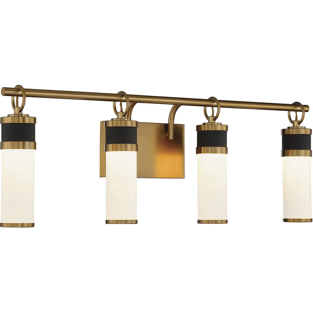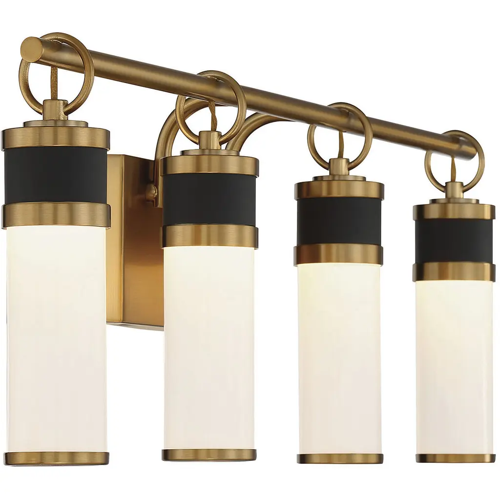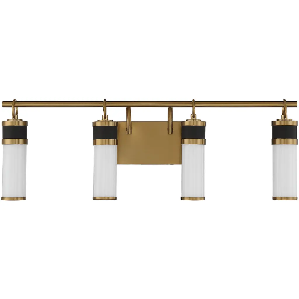 The Savoy House Abel 4-light bath vanity light flaunts a sleek and airy look that creates a robust presence in any space. Tubes of white opal glass are accentuated by ring accents and thoughtful hardware detailing in a rich combination of matte black with warm brass. Integrated LED light sources contribute to the sleek style. Abel is 10" in height, 30" in width and extends 5" from the wall. Damp area rated.