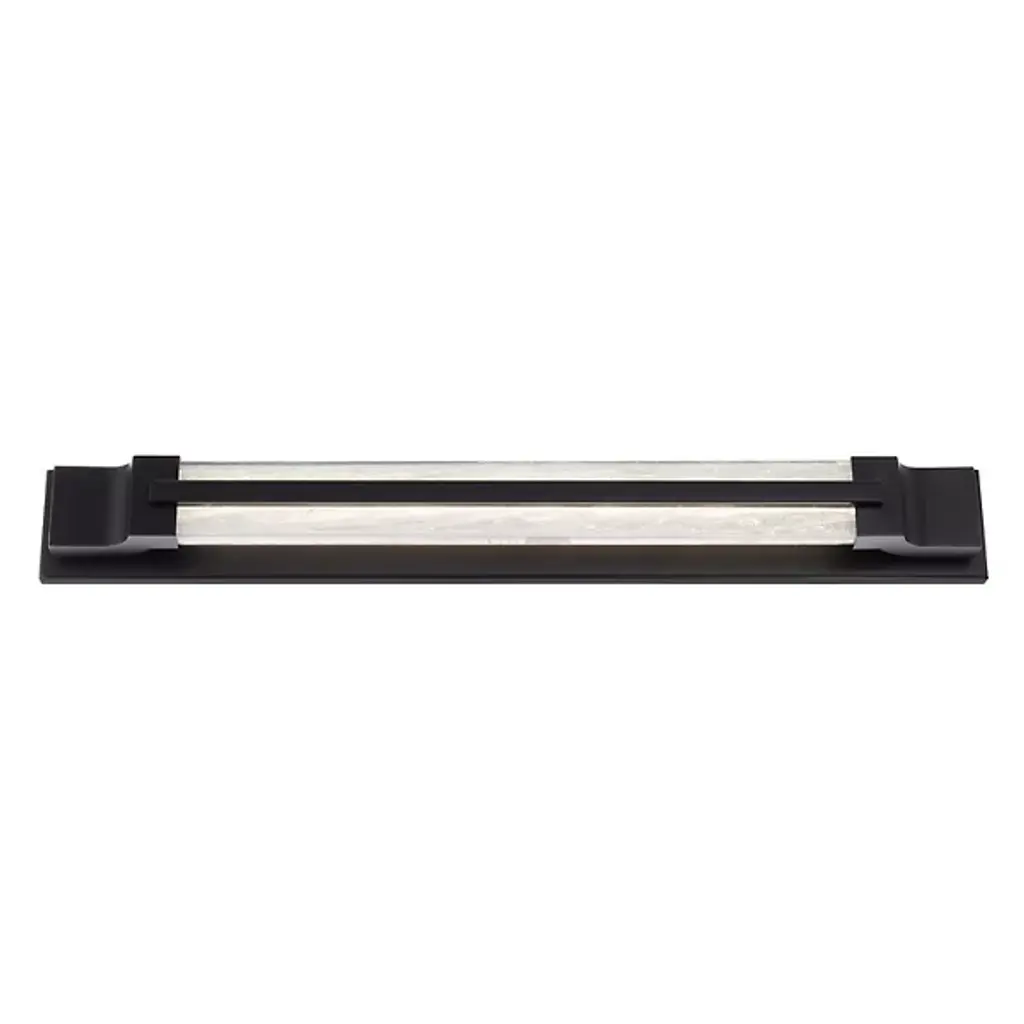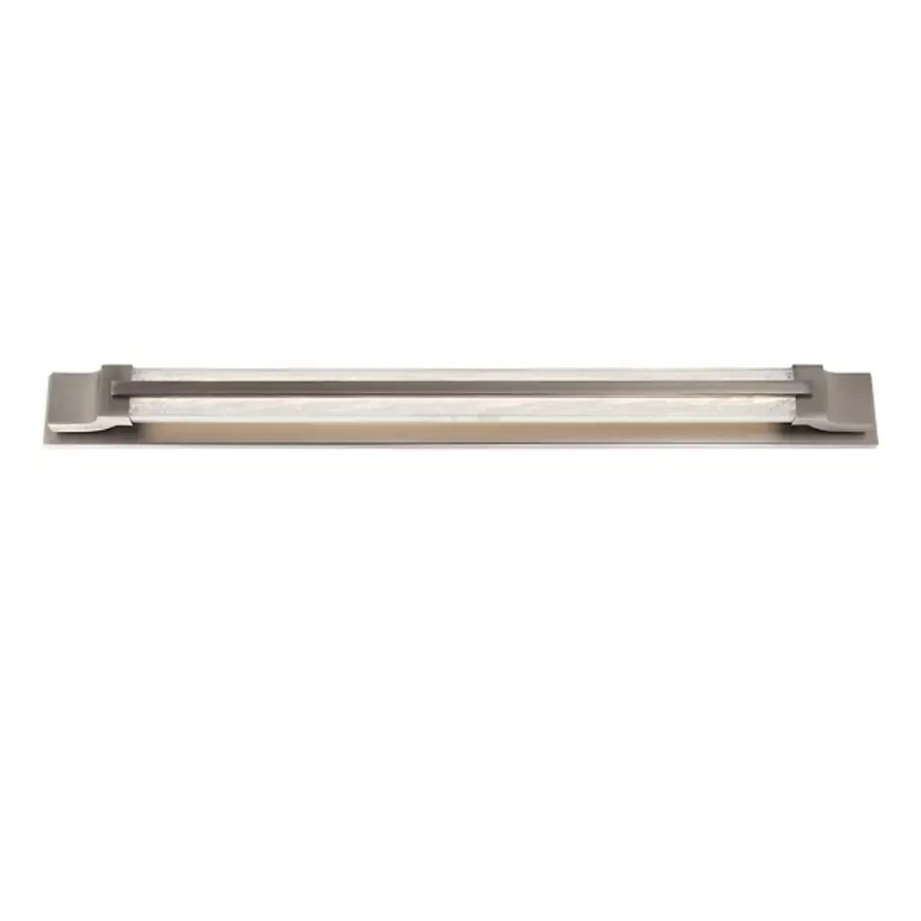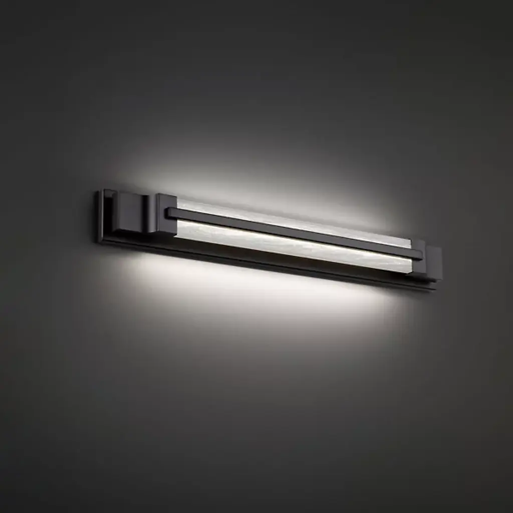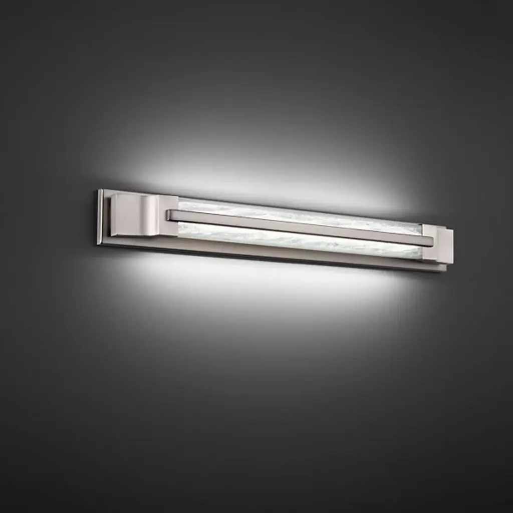 The Aberdeen LED Vanity Light from Schonbek Beyond gives the daily routine an even, flattering light and an artful visual of textured glass. This design's sharp geometry is a natural fit in the modern and contemporary setting. The piece makes the most of its wall space, mounting with a low-profile and slim backplate. This rectangular backplate can be mounted over a mirror or paired up across the sides. The metal backplate serves as a clean background for the fine details of the tempered glass diffuser. A slender crossbar protects the glass while adding a dashing linear silhouette when the lights come on. An LED array turns on inside and mellows through the mesmerizing glass as a comfortable spread.