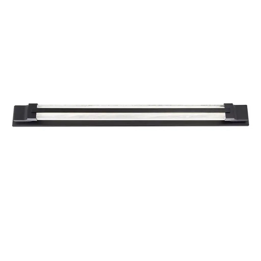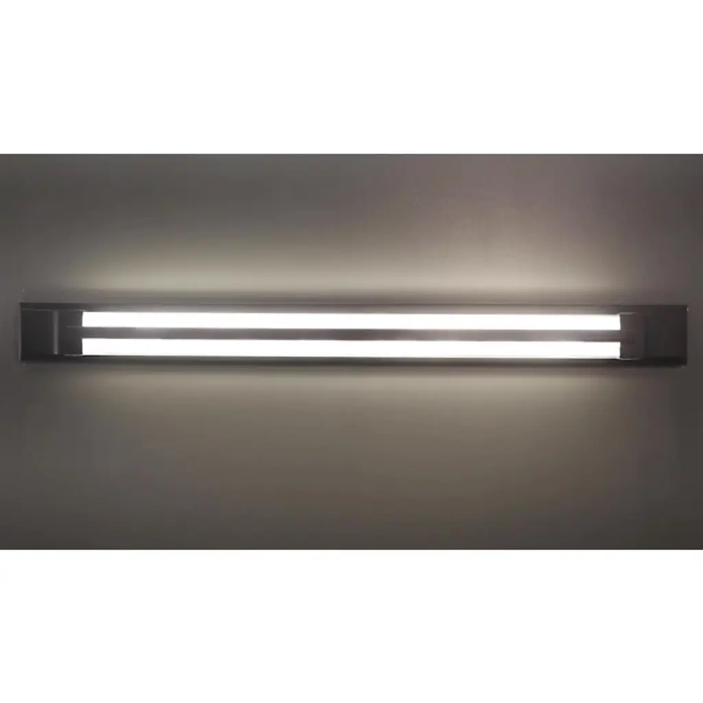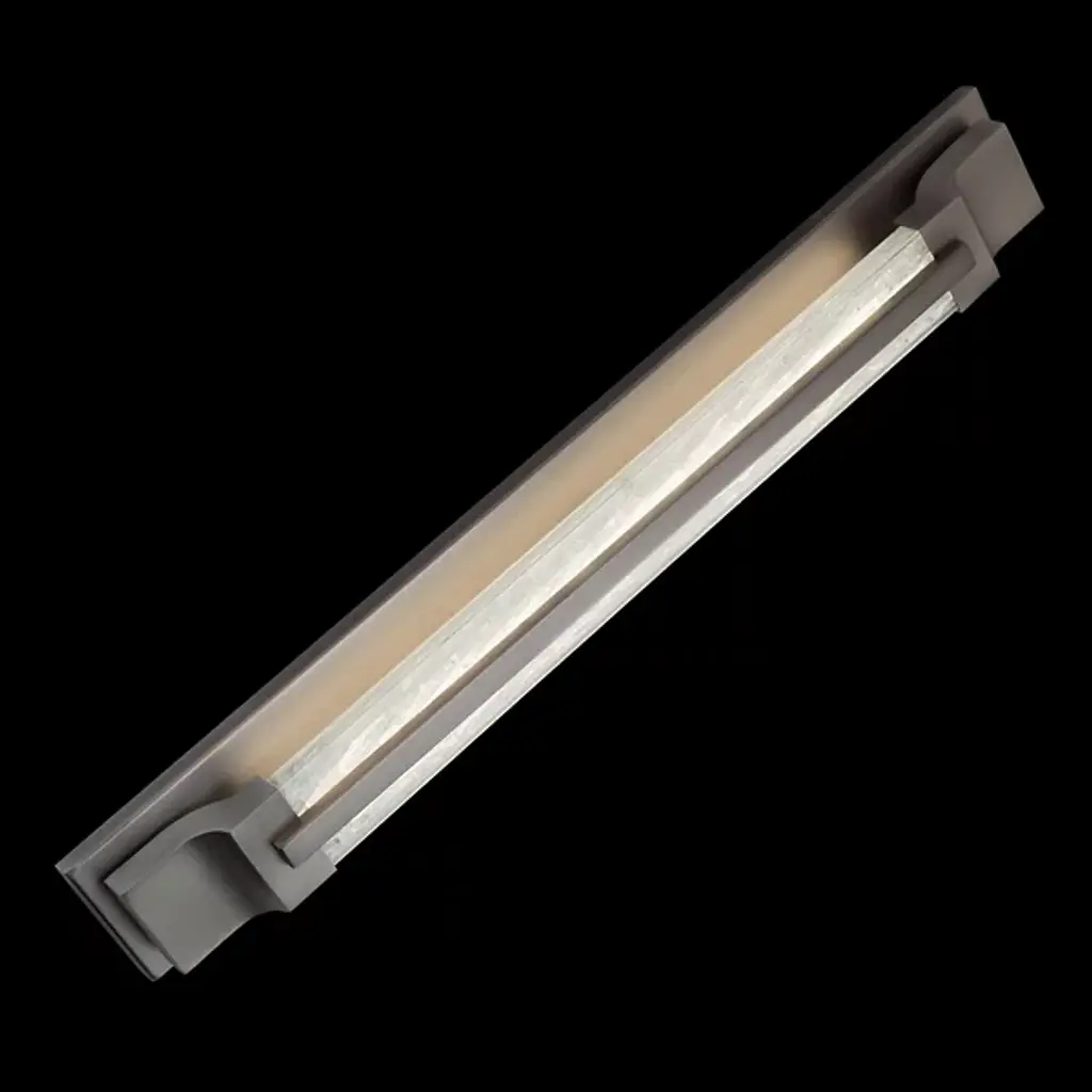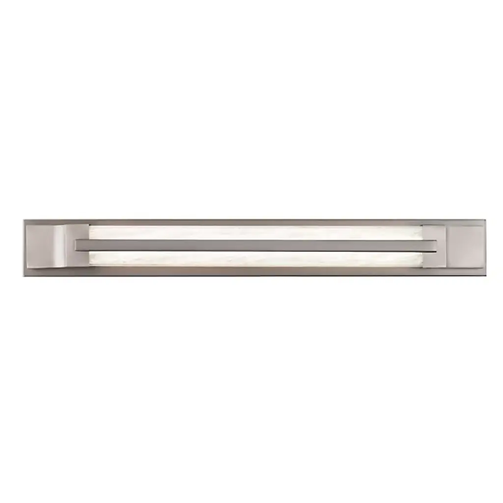 The Aberdeen LED Vanity Light from Schonbek Beyond gives the daily routine an even, flattering light and an artful visual of textured glass. This design's sharp geometry is a natural fit in the modern and contemporary setting. The piece makes the most of its wall space, mounting with a low-profile and slim backplate. This rectangular backplate can be mounted over a mirror or paired up across the sides. The metal backplate serves as a clean background for the fine details of the tempered glass diffuser. A slender crossbar protects the glass while adding a dashing linear silhouette when the lights come on. An LED array turns on inside and mellows through the mesmerizing glass as a comfortable spread.