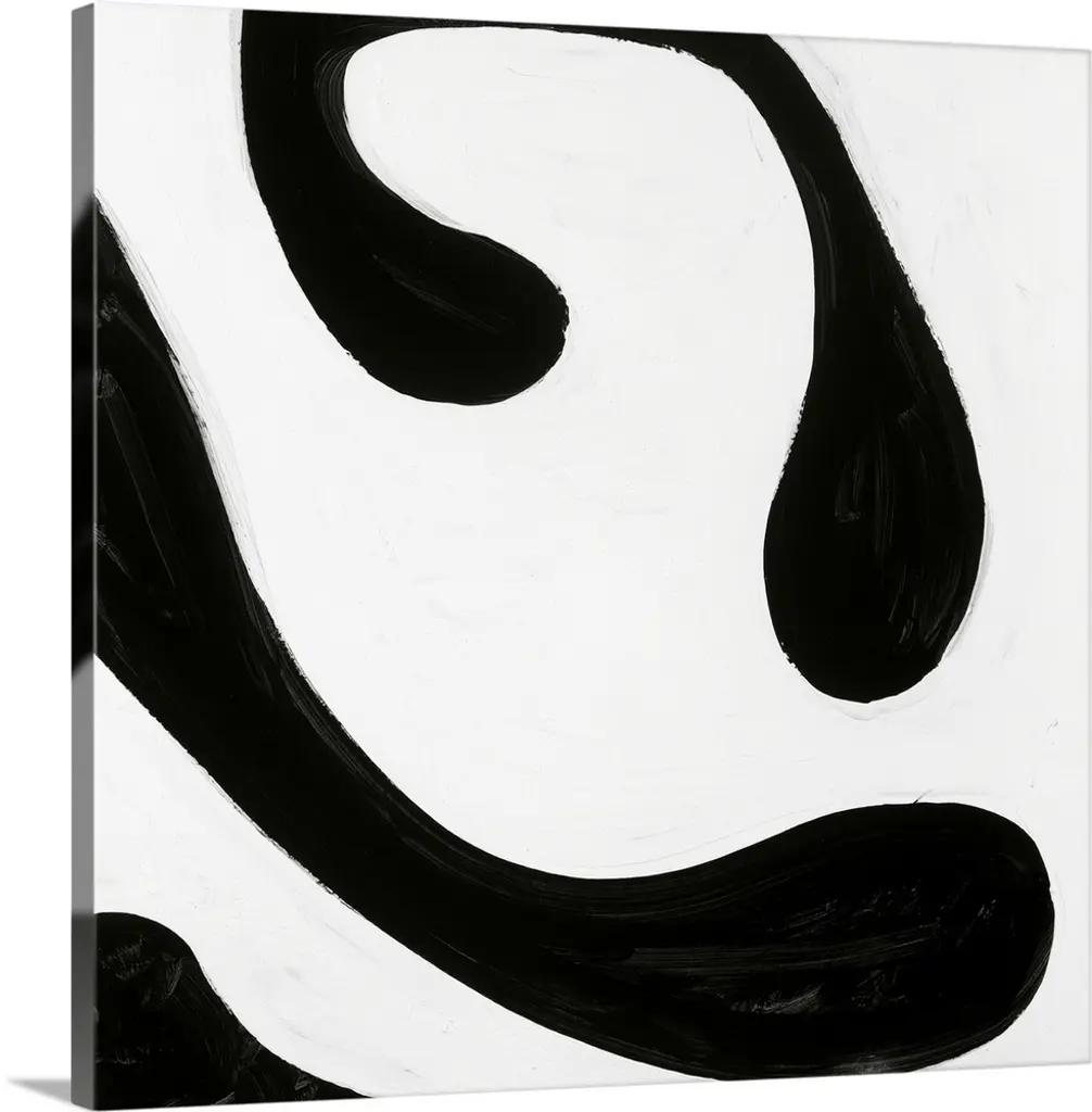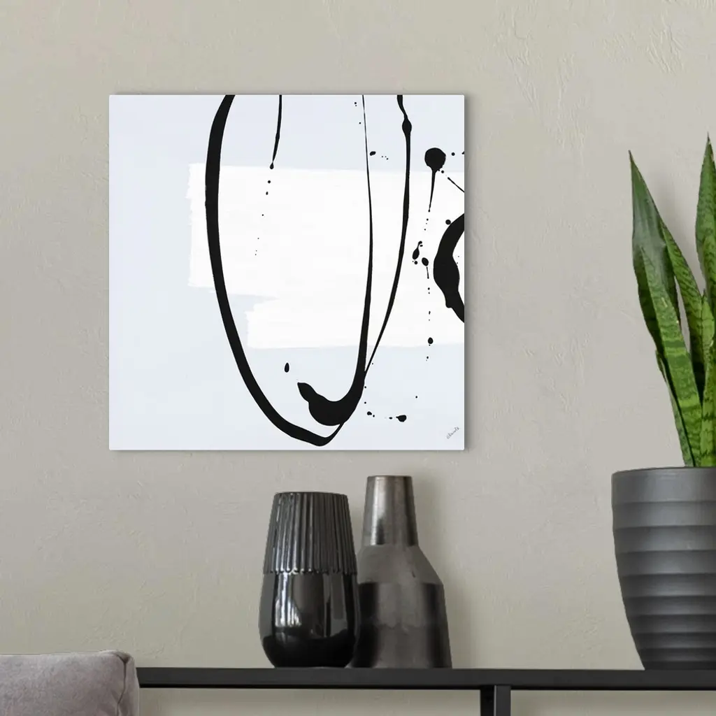 Minimalist abstract painting with a light blue background, a thick white brushstroke on the side, and black curvy lines and paint splatter on top.