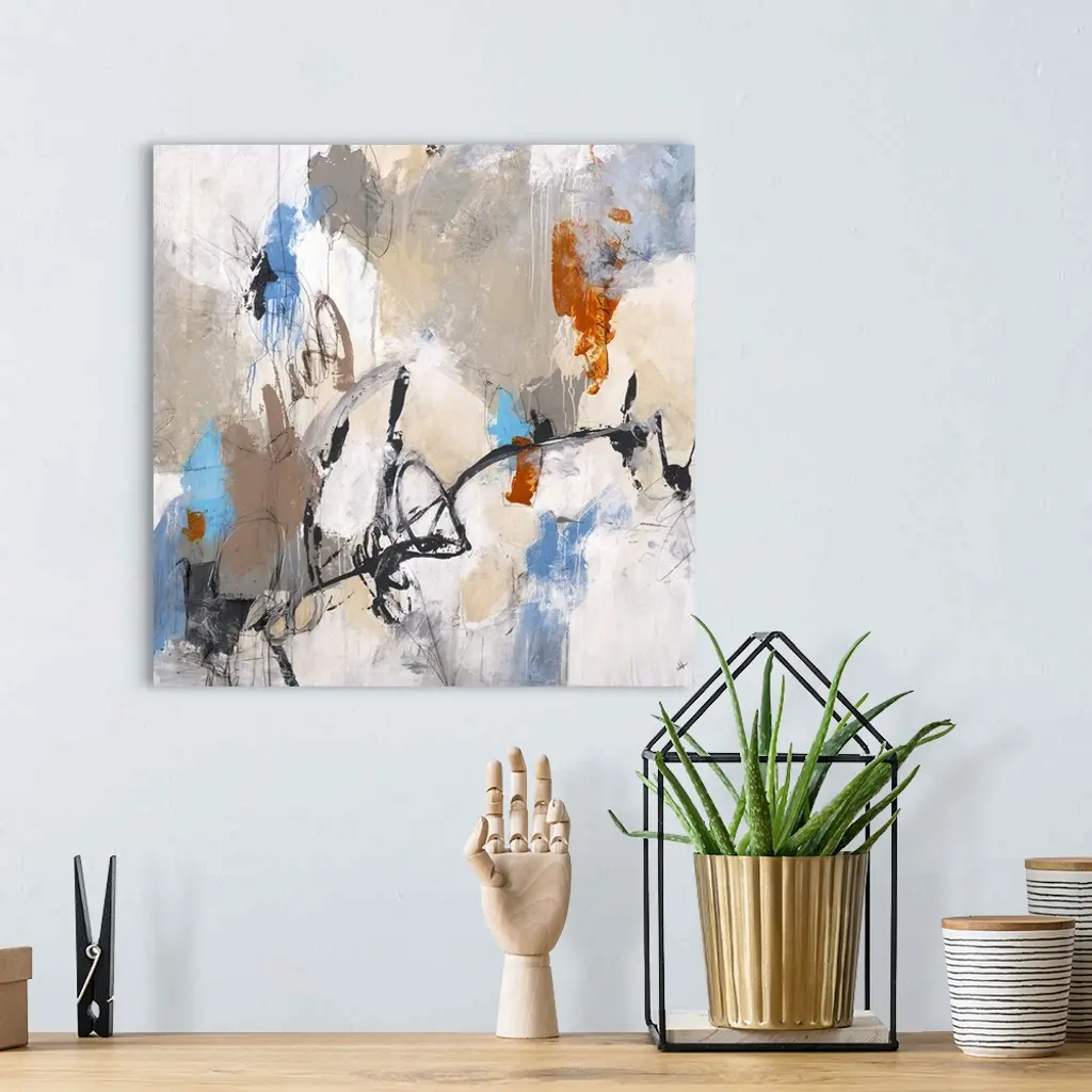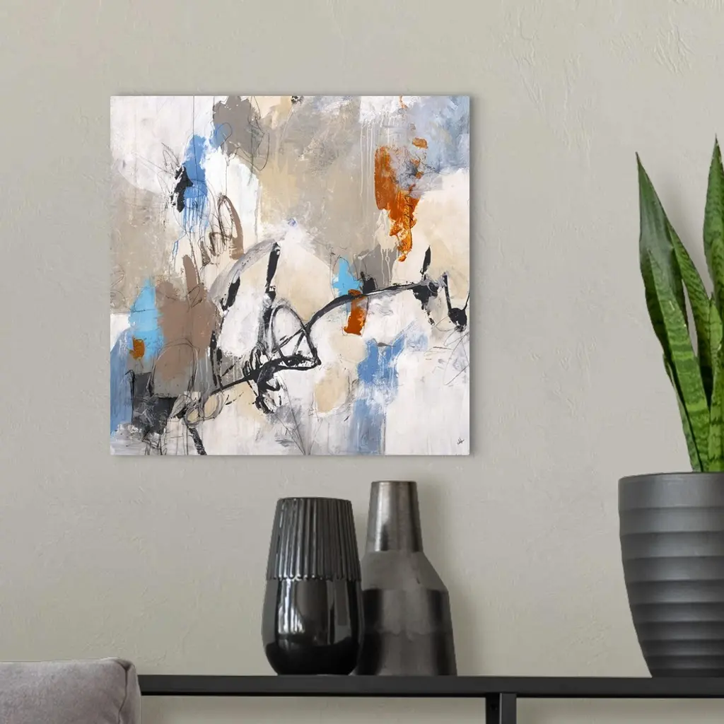 Square abstract painting with clusters of neutral colors on the background and pops of bright orange and blue on top amongst dark gray squiggly lines.