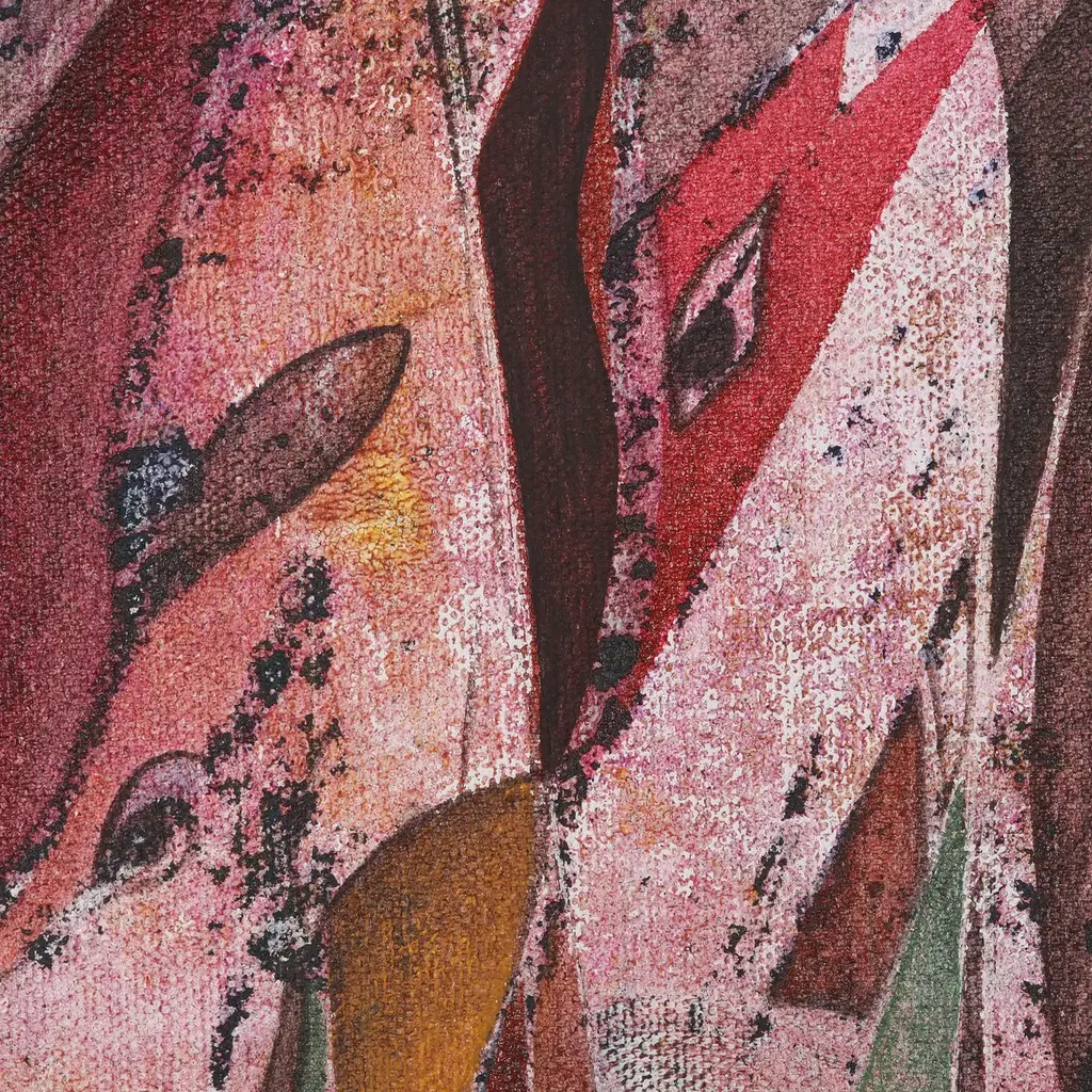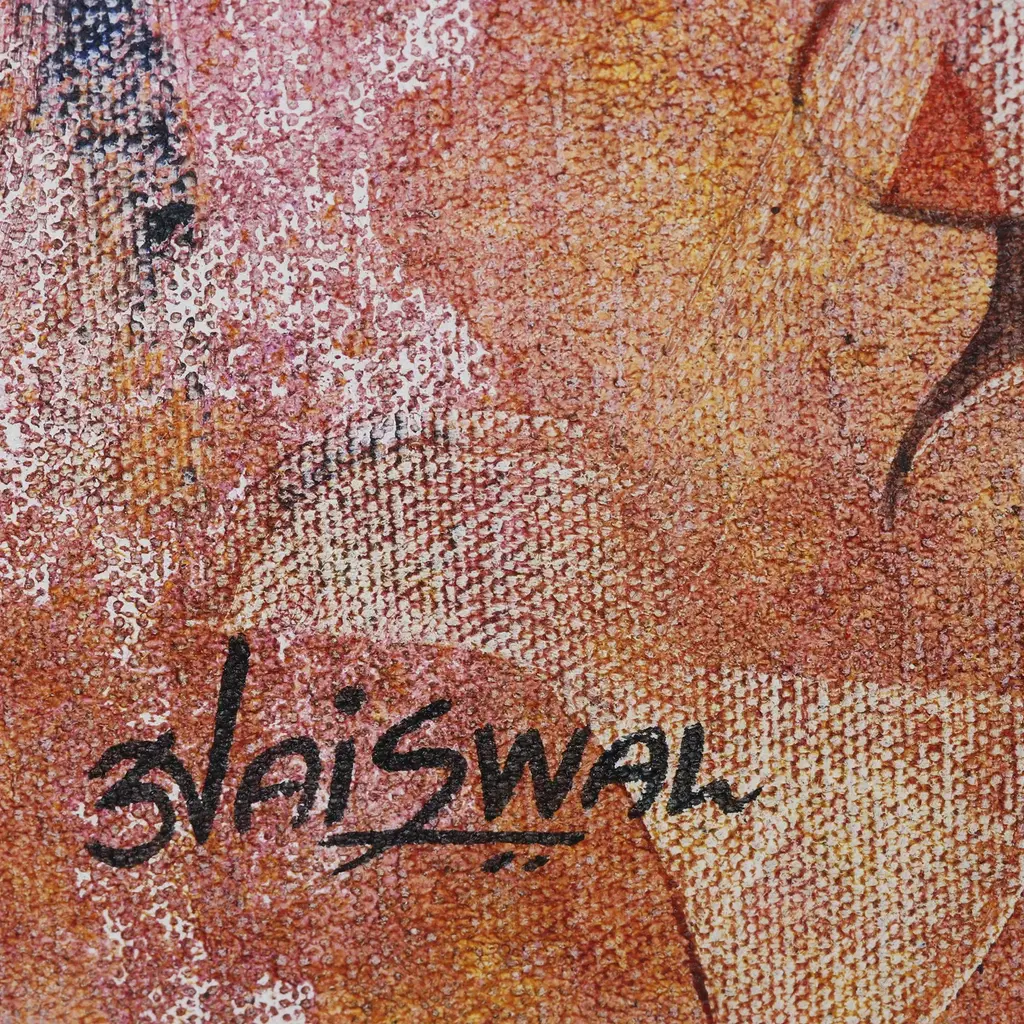 This intriguing abstract composition is painted by Sunil Jaiswal in India. The artist works in acrylic on canvas to create the painting, which features human and elephantine profiles in a muted palette of colors.
