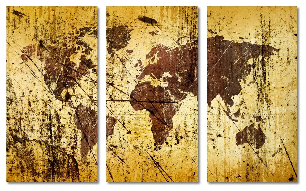 30"œ x 20"œ total size. Ready To Hang! (3 pieces - 10"œ x 20"œ each). 3 Panel Split (Triptych) Abstract Art World Map canvas print. Features buff, kobicha and shades of yellow/brown colors. For home or office wall decor & interior design. This giclee print includes beautiful digital texturing.. OBA free Giclée print wall art. Gallery Wrap - Image wraps around sides of the stretcher bars. Can be hanged without any decorative frames. • Canvas Giclee Wall Art• Made in USA• Ready to hang• Sawtooth hangers on the back• Hand stretched on 1.5"œ wooden stretcher bars• Fade resistant, OBA free canvas• 350gsm, 18mil poly/cotton canvas• UV-protective coating• Gallery Wraped with mirrored edges• Epson printing process• For indoor use