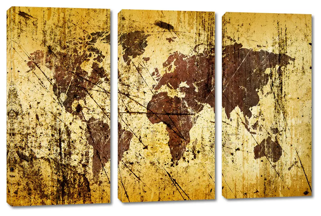 60"œ x 40"œ total size. Ready To Hang! (3 pieces - 20"œ x 40"œ each). 3 Panel Split (Triptych) Abstract Art World Map canvas print. Features buff, kobicha and shades of yellow/brown colors. For home or office wall decor & interior design. This giclee print includes beautiful digital texturing.. OBA free Giclée print wall art. Gallery Wrap - Image wraps around sides of the stretcher bars. Can be hanged without any decorative frames. • Canvas Giclee Wall Art• Made in USA• Ready to hang• Sawtooth hangers on the back• Hand stretched on 1.5"œ wooden stretcher bars• Fade resistant, OBA free canvas• 350gsm, 18mil poly/cotton canvas• UV-protective coating• Gallery Wraped with mirrored edges• Epson printing process• For indoor use