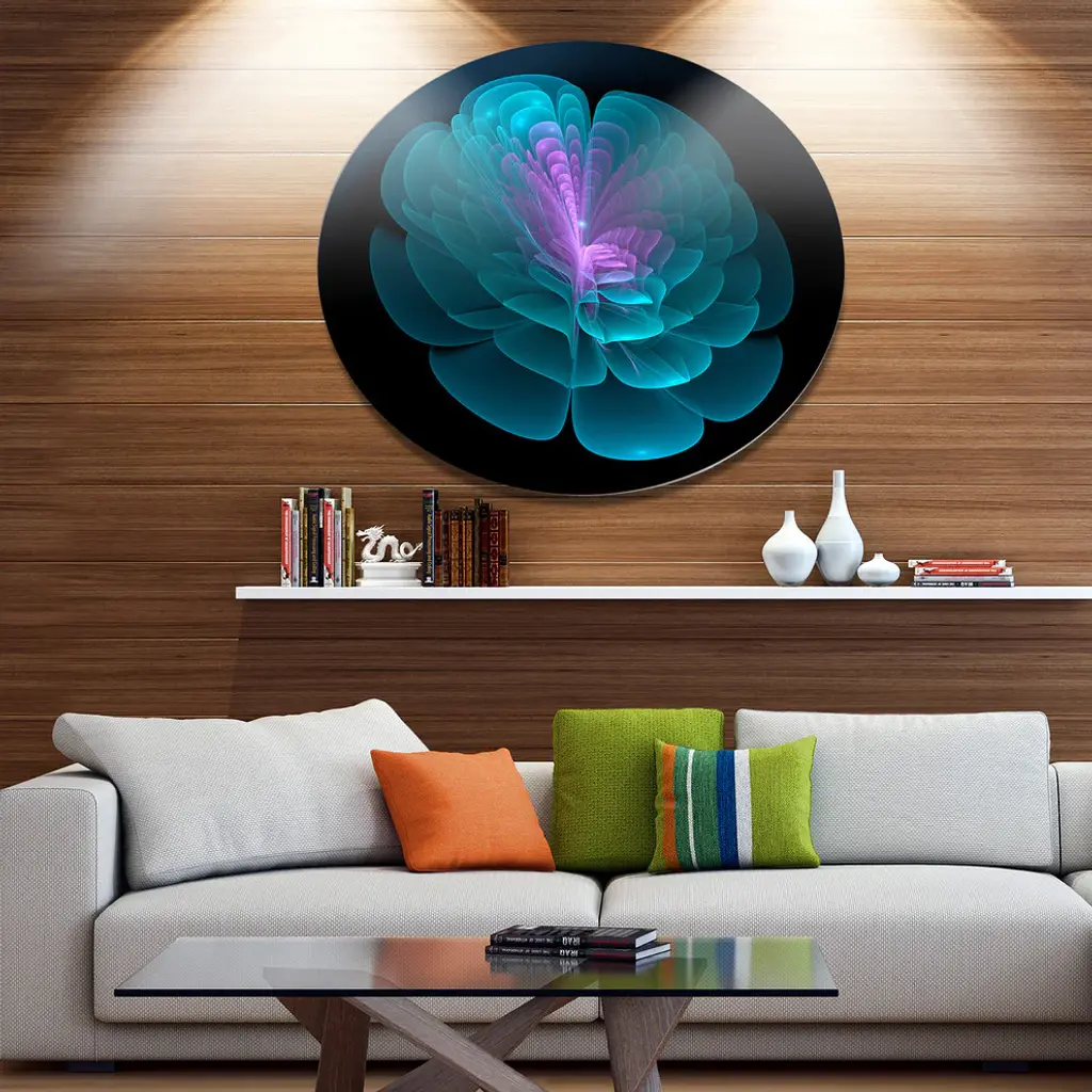 Bring Contemporary Abstraction to your home with this large Circle Metal wall art. This Abstract Blue Floral Fractal Background Metal Artwork makes it the focal point of any room or office. - White Gloss Coating ensures colors are extra vibrant with light reflection.- Aluminum grade Sheet Metal with 1 inch mounting frame on the back giving the illusion that the artwork is floating on the wall..- Mounting Brackets are included along with instructions.- High Quality Digital images are created directly into a glossy aluminum panel producing a stunning and captivating print into the glossy finish of the metal.- Water, Fire and Scratch resistant HD Aluminum panels.- Looks better than any photo paper and guaranteed to last at least 20 years- Easy to clean with a microfiber cloth. Colors are far superior to regular Canvas Art. - Easy to Hang