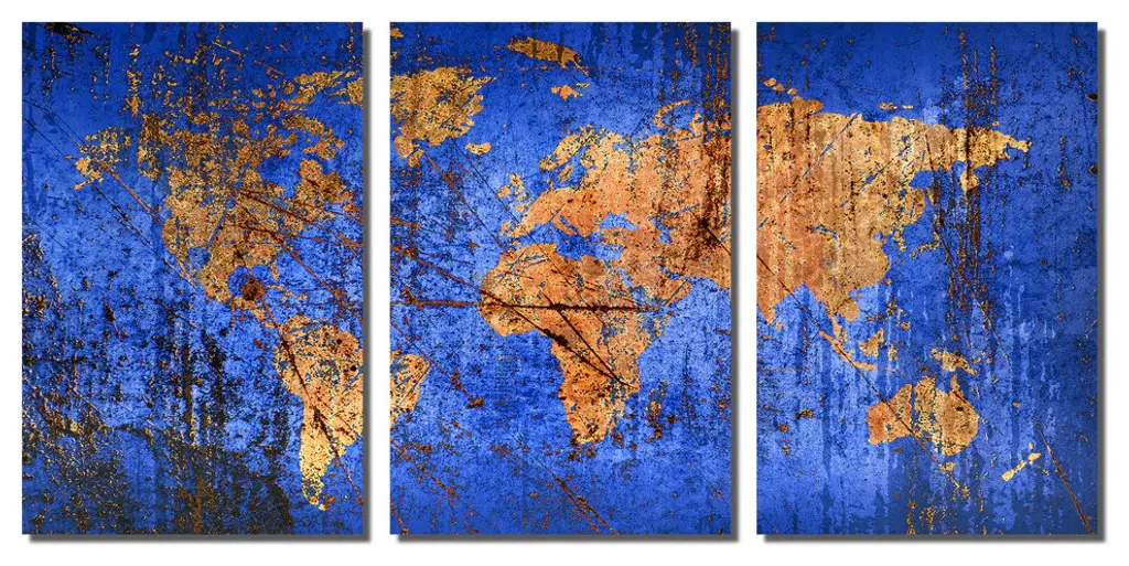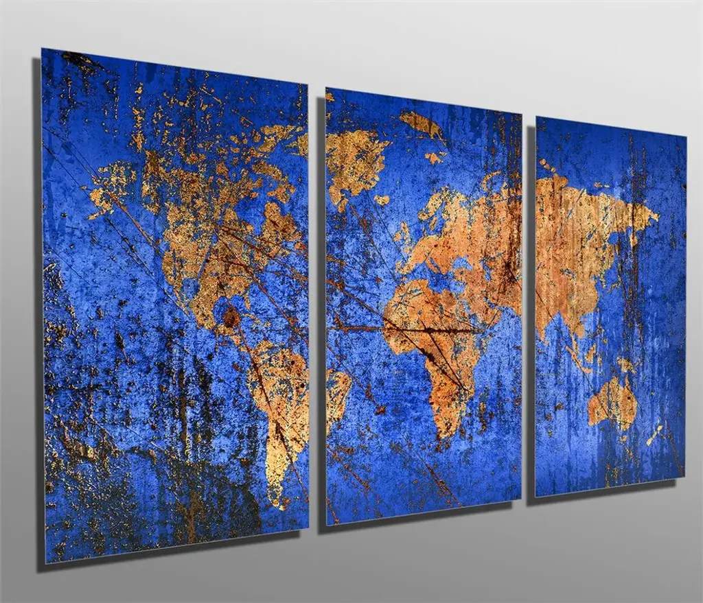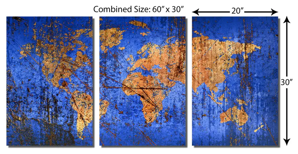 60"œ x 30"œ total size. Ready To Hang! (3 pieces - 20"œ x 30"œ each). 3 Panel Split (Triptych) Abstract World Map Metal Print art with shades of earth yellow/brown and blue colors. Modern metal wall art for home or office wall decor & interior design. Printed on Luxurious, HD aluminum glossy metal panels. Multi Panel art.. HD aluminum panels. Metal print wall art. Includes Shadow Wall Mount on the back.• Aluminum Metal Wall Art• Made in USA• Ready to hang - No assembly required• Shadow mount hardware on the back• 0.045"œ thick HD Aluminum Panels• Scratch resistant, glossy finish• Superb color clarity, luxurious prints• Epson printing process• For indoor or moisture rich environment use• Easy to clean. Gently wipe with microfiber cloth.