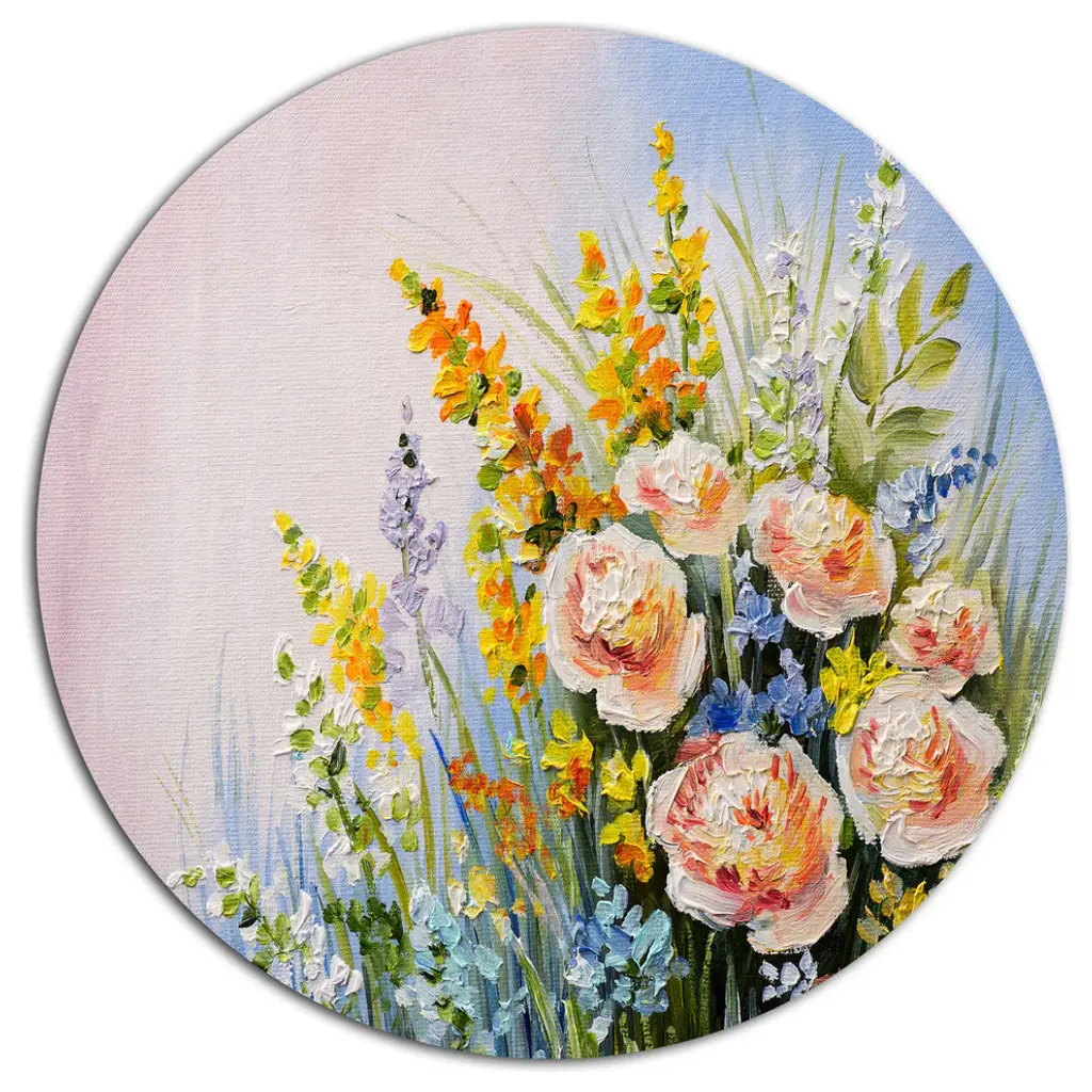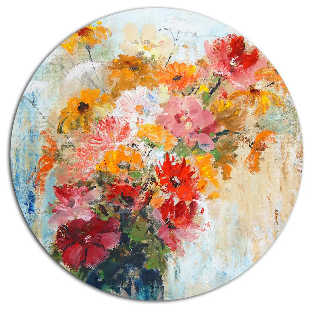 Bring Contemporary Abstraction to your home with this large Circle Metal wall art. This Abstract Bouquet of Summer Flowers Metal Artwork makes it the focal point of any room or office. - White Gloss Coating ensures colors are extra vibrant with light reflection.- Aluminum grade Sheet Metal with 1 inch mounting frame on the back giving the illusion that the artwork is floating on the wall..- Mounting Brackets are included along with instructions.- High Quality Digital images are created directly into a glossy aluminum panel producing a stunning and captivating print into the glossy finish of the metal.- Water, Fire and Scratch resistant HD Aluminum panels.- Looks better than any photo paper and guaranteed to last at least 20 years- Easy to clean with a microfiber cloth. Colors are far superior to regular Canvas Art. - Easy to Hang