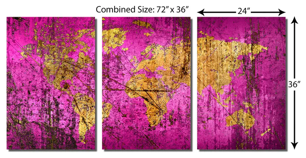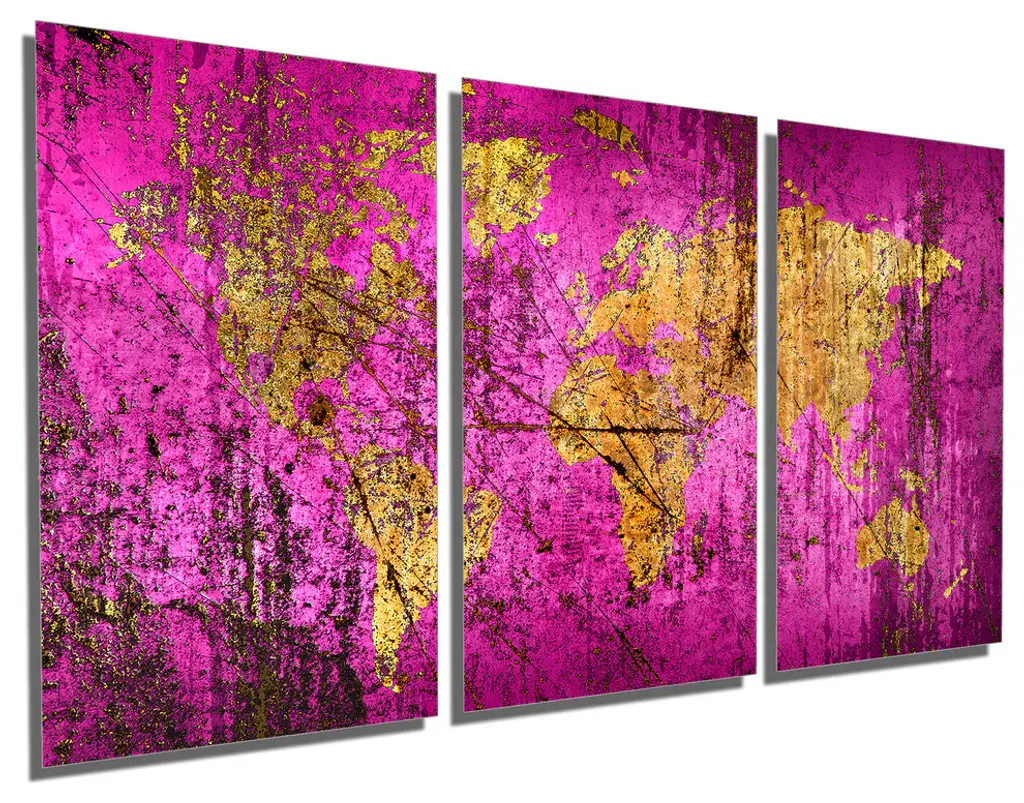 72"œ x 36"œ total size. Ready To Hang! (3 pieces - 24"œ x 36"œ each). 3 Panel Split (Triptych) Abstract World Map Metal Print art ft. shades of earth yellow/brown and Dark-Phlox, pink-purple colors. Modern metal wall art for home or office wall decor & interior design. Printed on Luxurious, HD aluminum glossy metal panels.. HD aluminum panels. Metal print wall art. Includes Shadow Wall Mount on the back.• Aluminum Metal Wall Art• Made in USA• Ready to hang - No assembly required• Shadow mount hardware on the back• 0.045"œ thick HD Aluminum Panels• Scratch resistant, glossy finish• Superb color clarity, luxurious prints• Epson printing process• For indoor or moisture rich environment use• Easy to clean. Gently wipe with microfiber cloth.