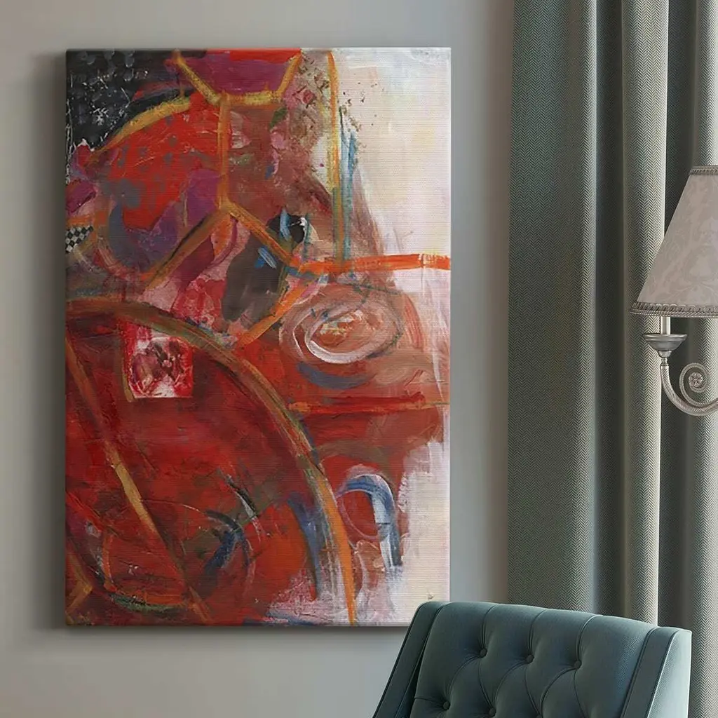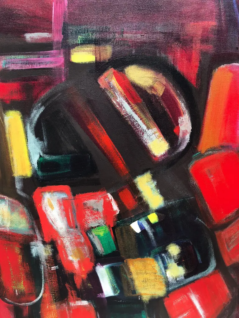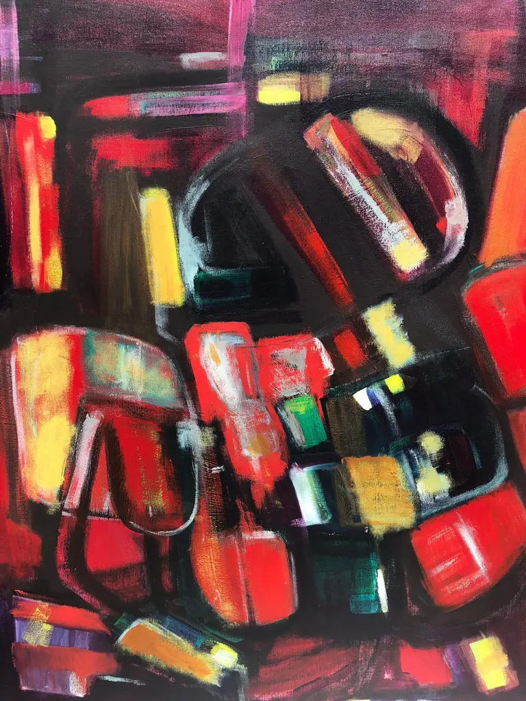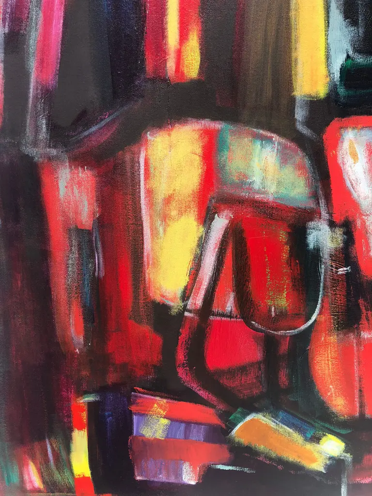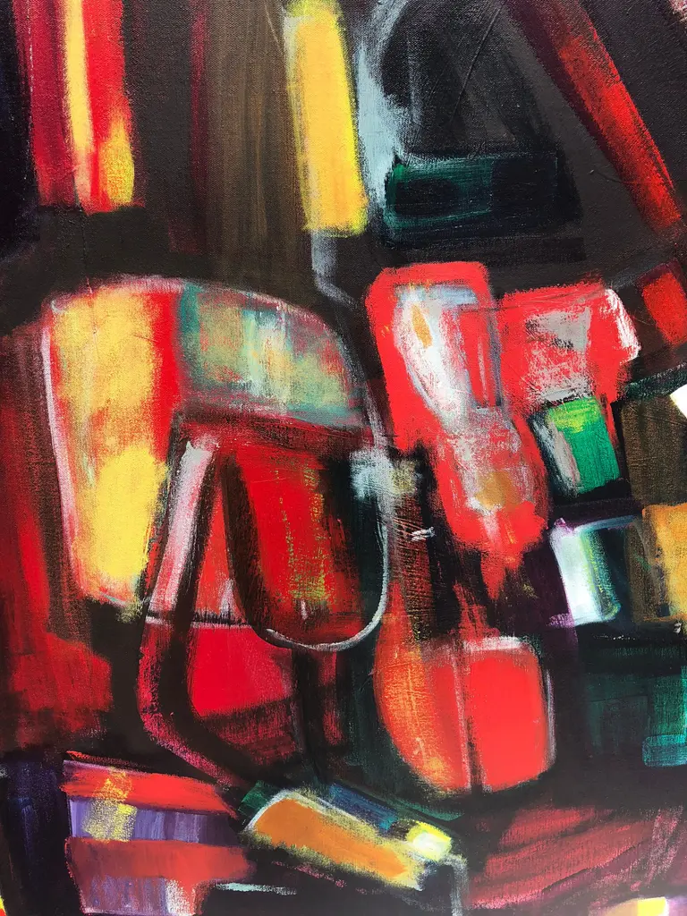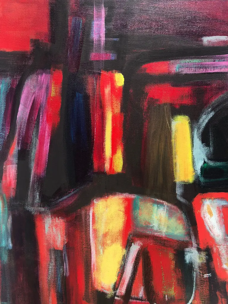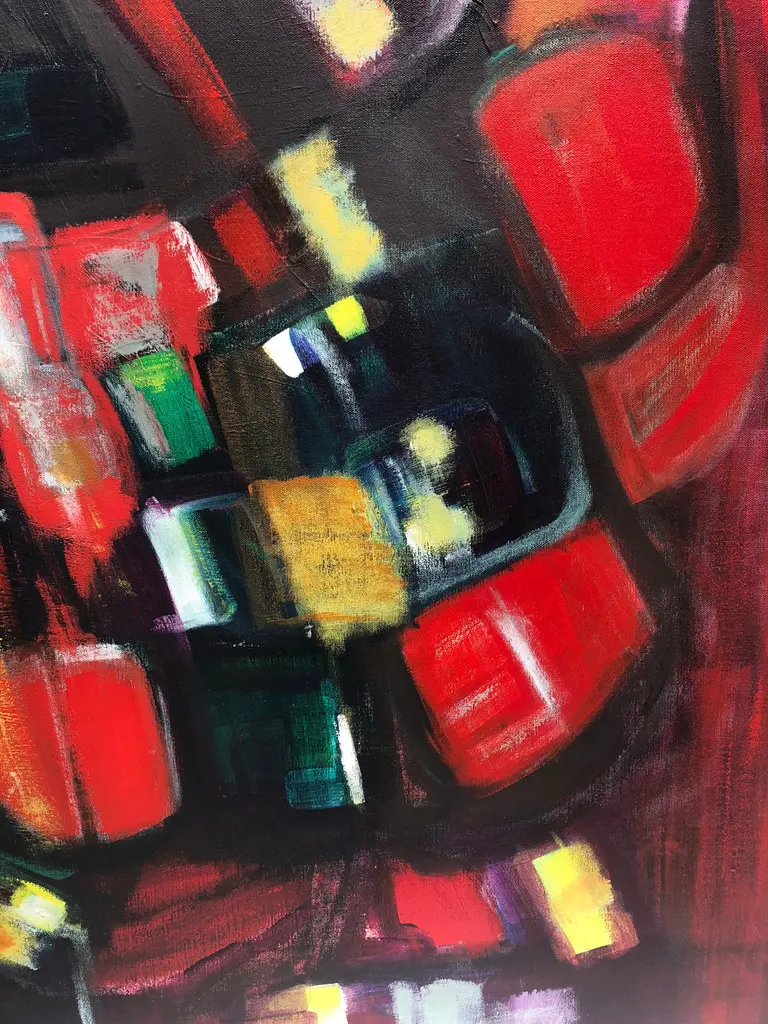 Contemporary abstract expressionist painting. Oil on canvas displayed in a minimalist white wood frame. Canvas: 40"L x 40"H; frame: 41"L x 41"H.