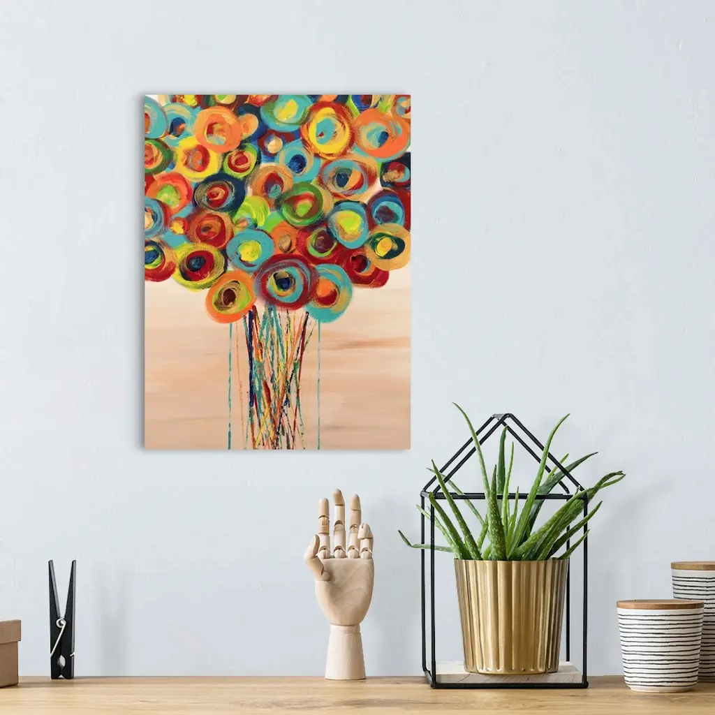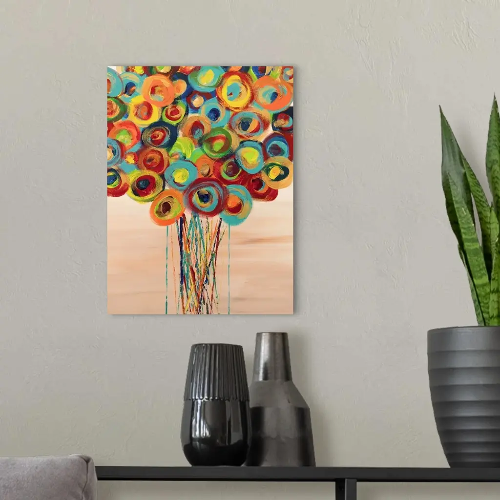 A contemporary abstract painting of a bouquet of colorful flowers in a vase against a light brown background.