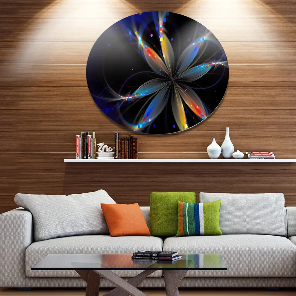 Bring Contemporary Abstraction to your home with this large Circle Metal wall art. This Abstract Fractal Flower on Black Metal Artwork makes it the focal point of any room or office. - White Gloss Coating ensures colors are extra vibrant with light reflection.- Aluminum grade Sheet Metal with 1 inch mounting frame on the back giving the illusion that the artwork is floating on the wall..- Mounting Brackets are included along with instructions.- High Quality Digital images are created directly into a glossy aluminum panel producing a stunning and captivating print into the glossy finish of the metal.- Water, Fire and Scratch resistant HD Aluminum panels.- Looks better than any photo paper and guaranteed to last at least 20 years- Easy to clean with a microfiber cloth. Colors are far superior to regular Canvas Art. - Easy to Hang