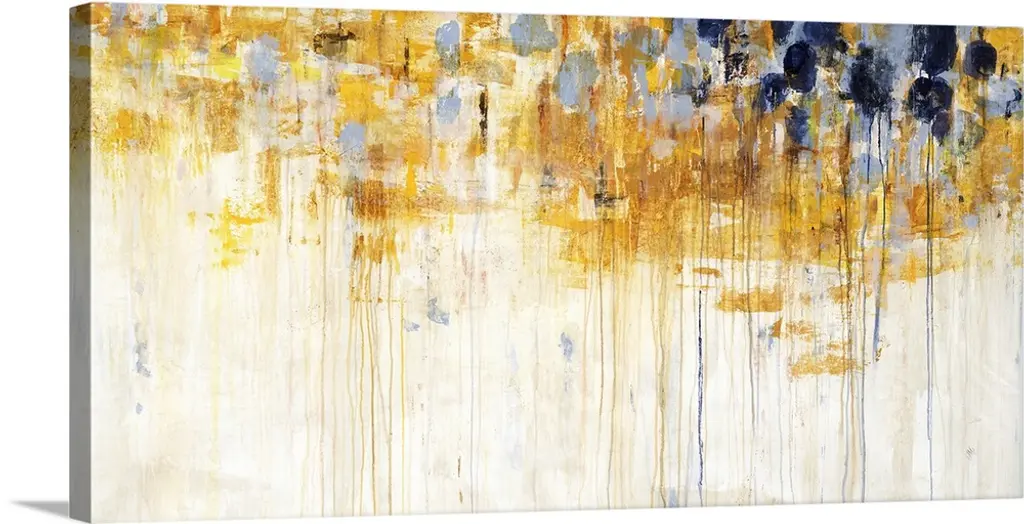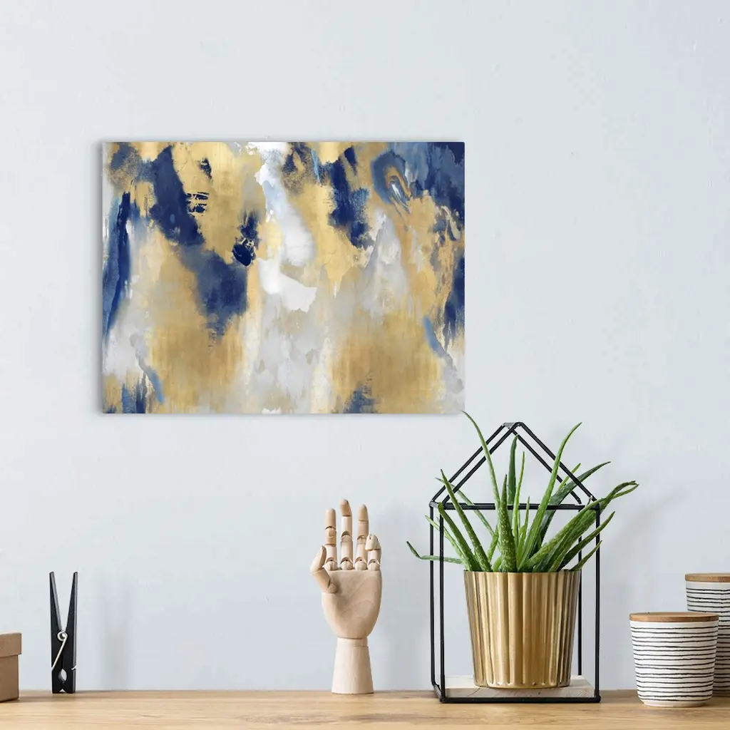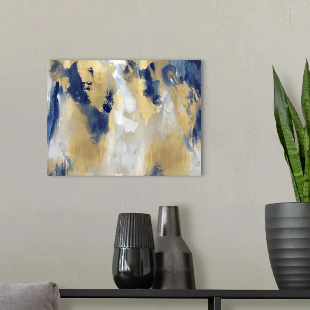 A large, horizontal abstract painting in shades of indigo and gold. This statement piece of art would look outstanding in a dining room or over the fireplace.