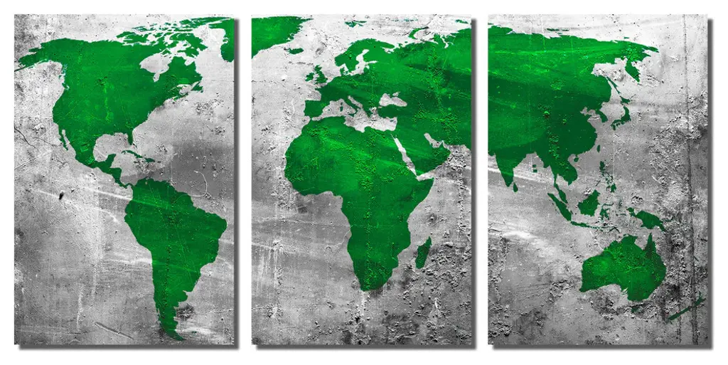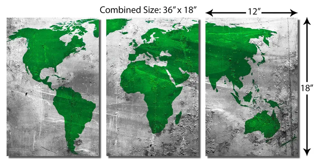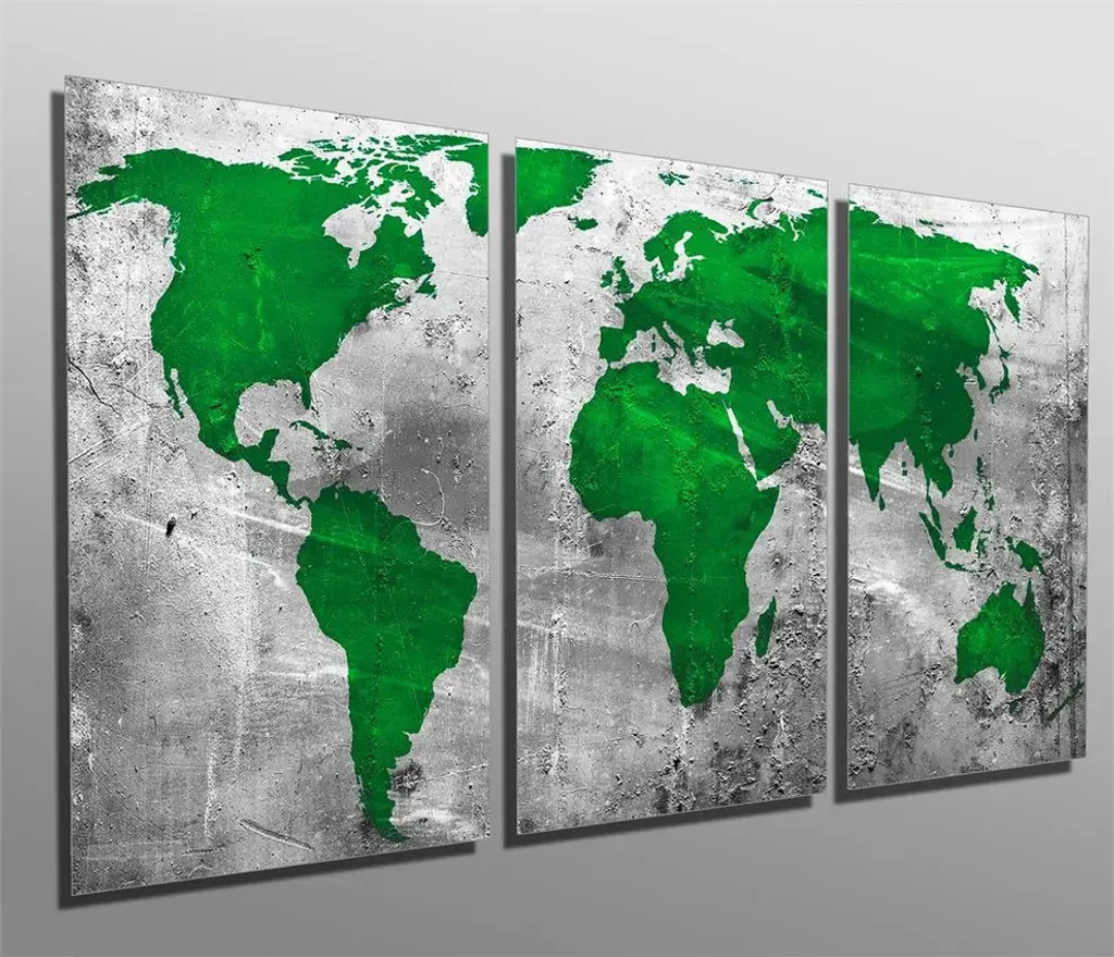 Abstract Green World Map Metal Print Wall Art, 3 Panel Split, Triptych, 36x18