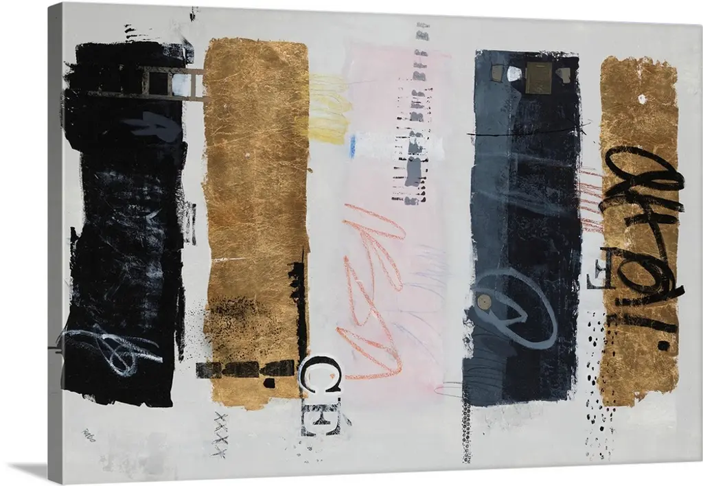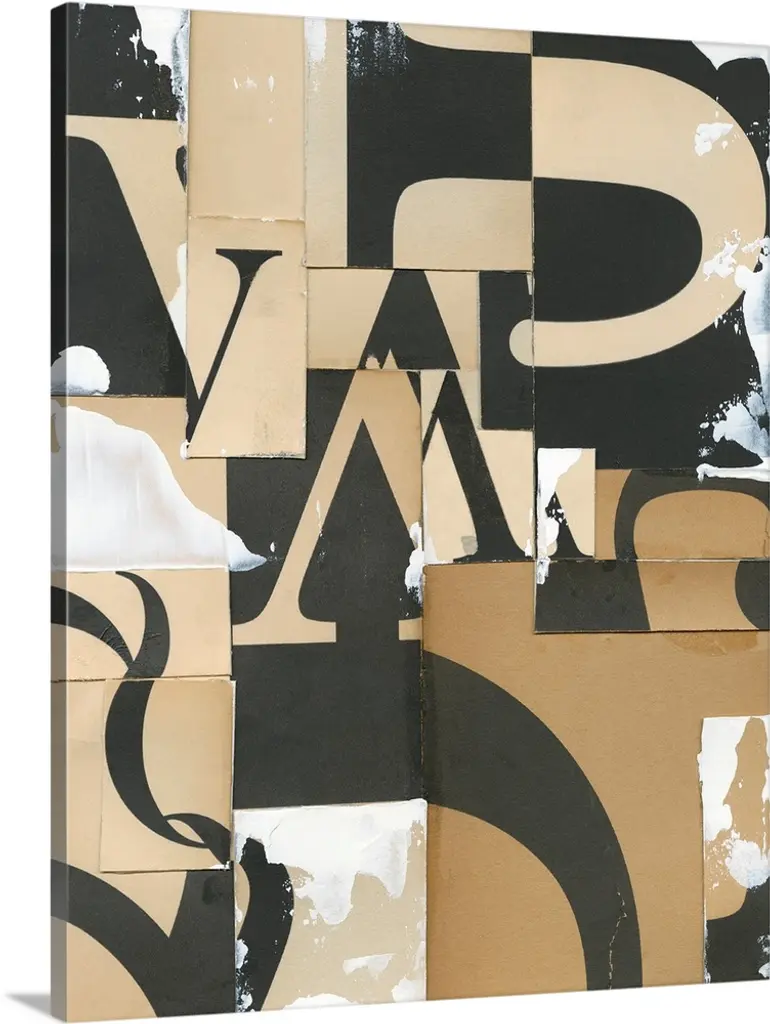 Collage style artwork using muted paper clippings and paint to make an abstract piece.